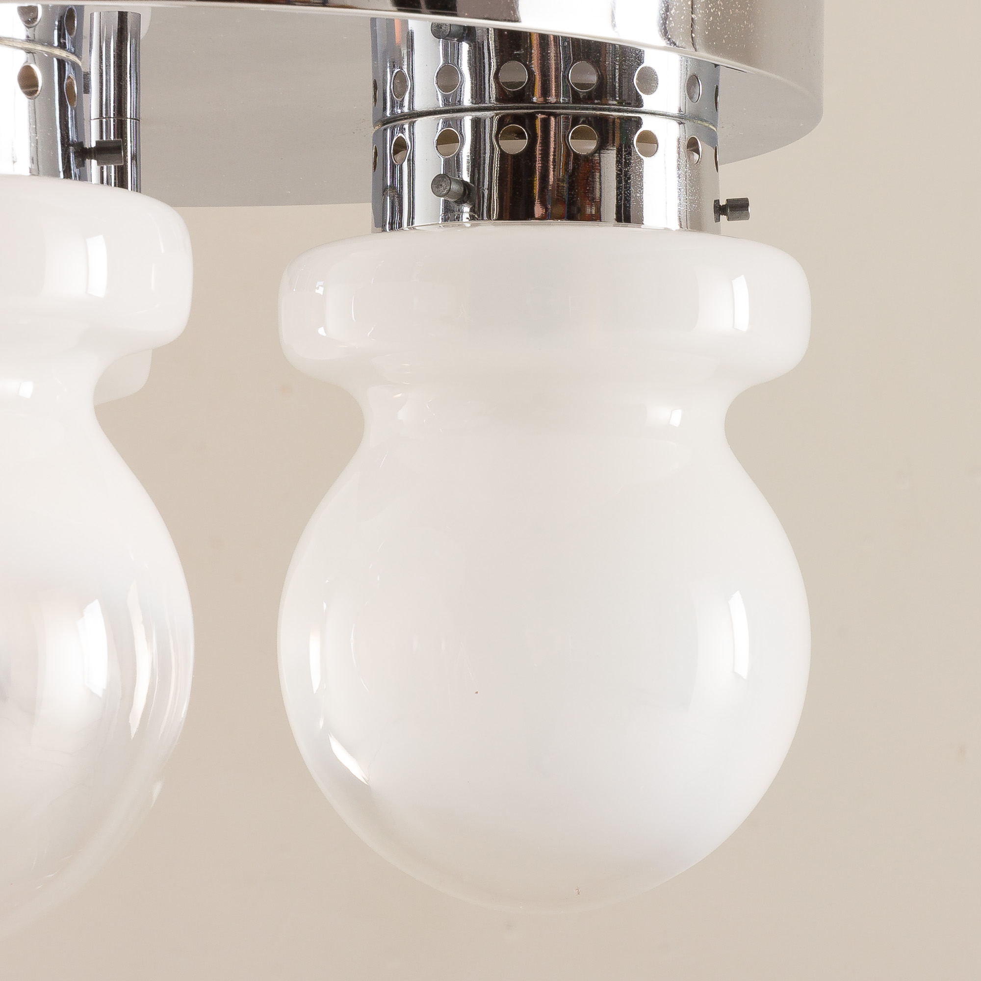 The softly rounded shades showcase a distinctive organic form typical of Italian lighting from the era. Lattimo glass is a traditional Murano glass technique, named after the Italian word latte (“milk”), known for its elegant, opaline finish and warm light diffusion.