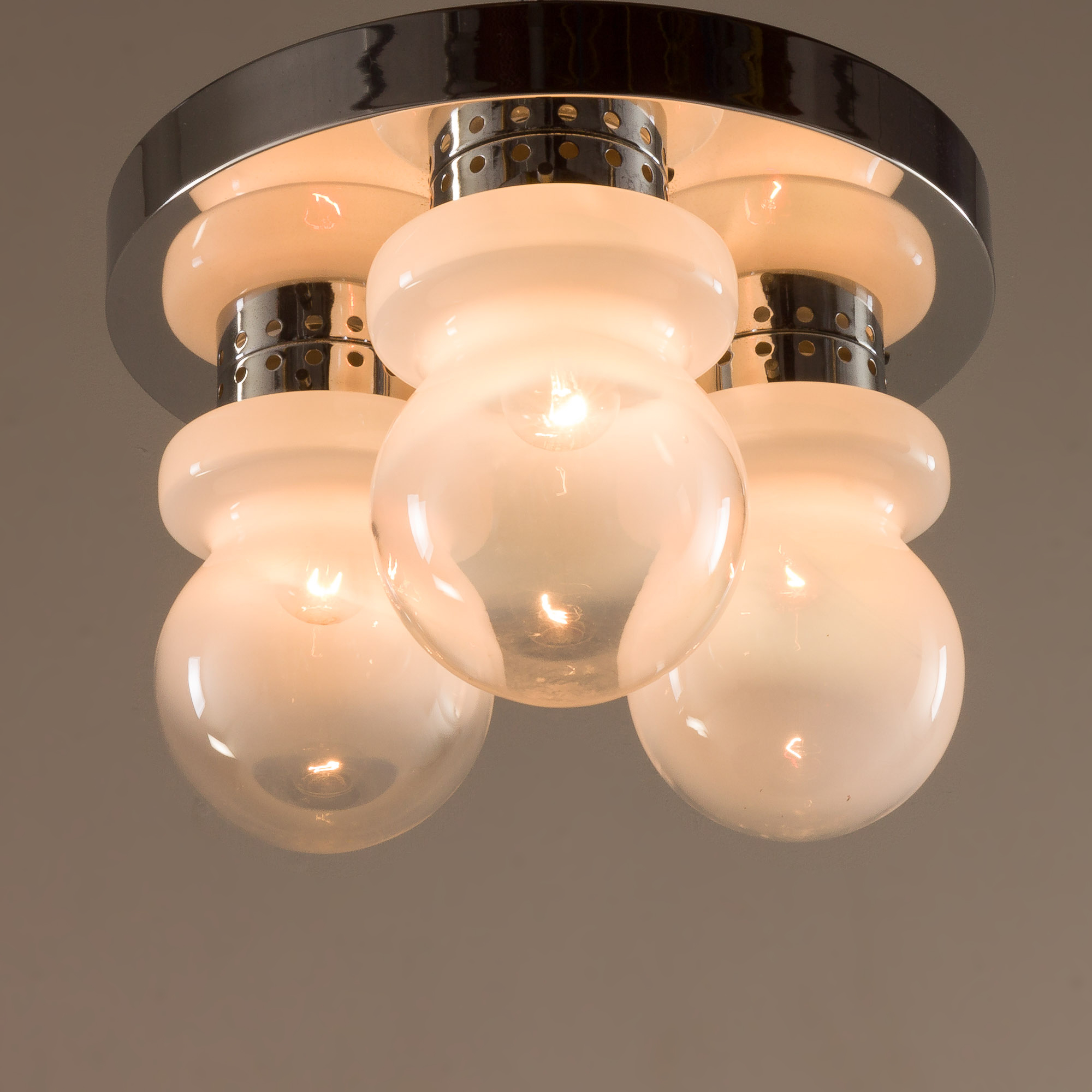 This ceiling light was most likely made by Mazzega in the 1970s and represents Italian mid-century modern design at its finest. The shades are typical for Mazzega productions from that period. The lamp features a high-quality chrome-plated steel structure combined with three hand-blown Murano glass lampshades in milky white “Lattimo” glass.
