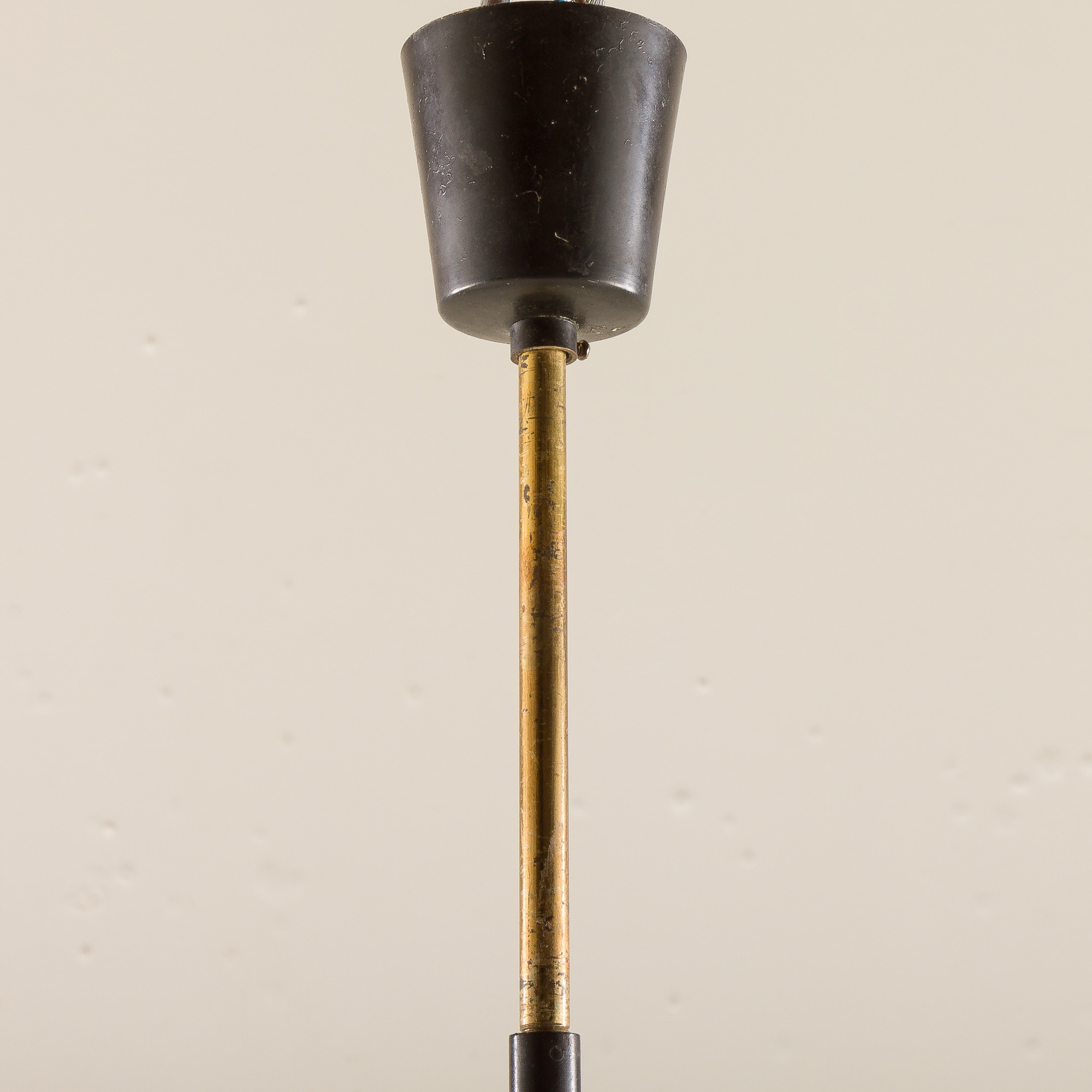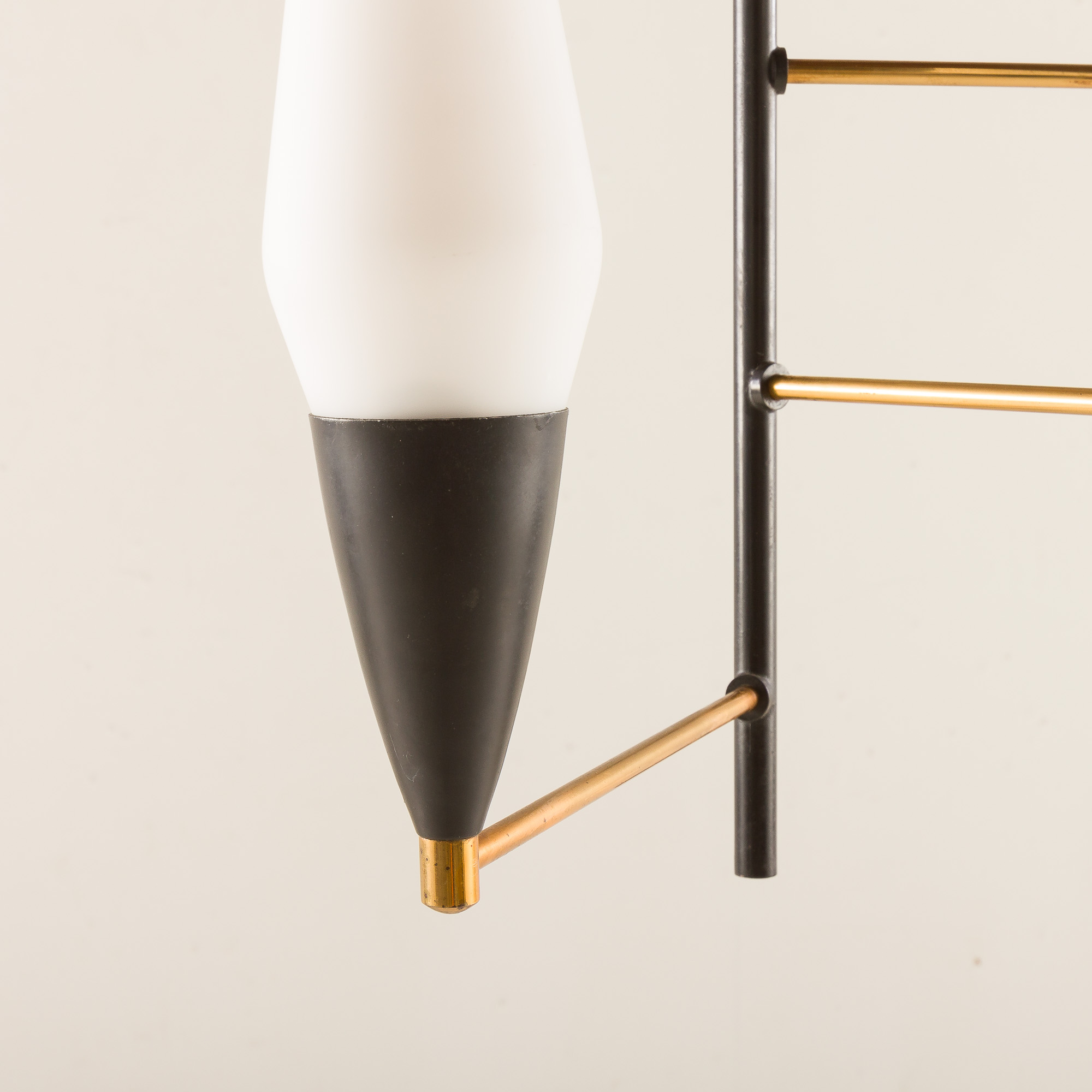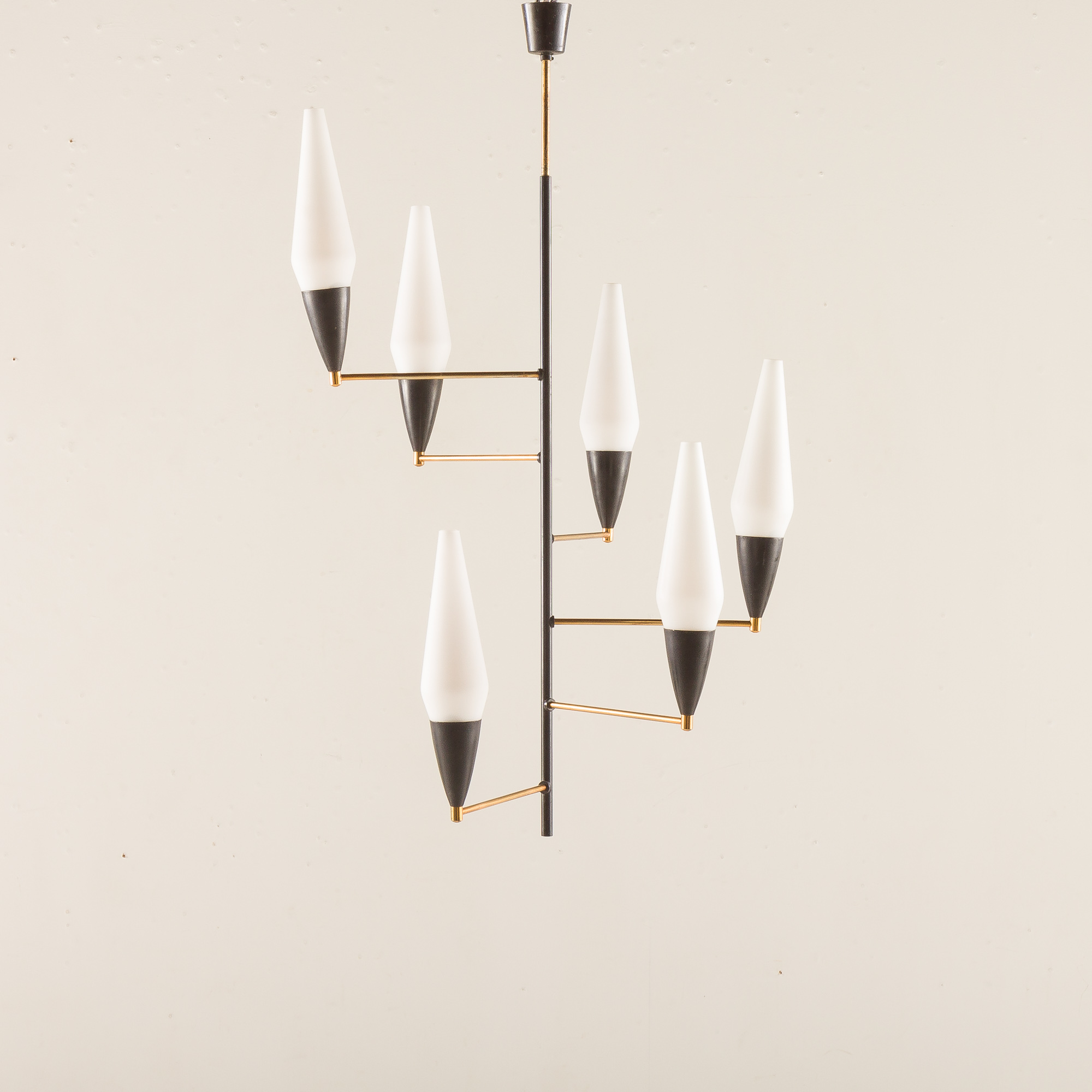Elegant Italian mid-century chandelier from the 1960s, designed in the distinctive Stilnovo style. The composition showcases a refined balance of geometry, movement, and material contrast typical of Italian lighting from this era.