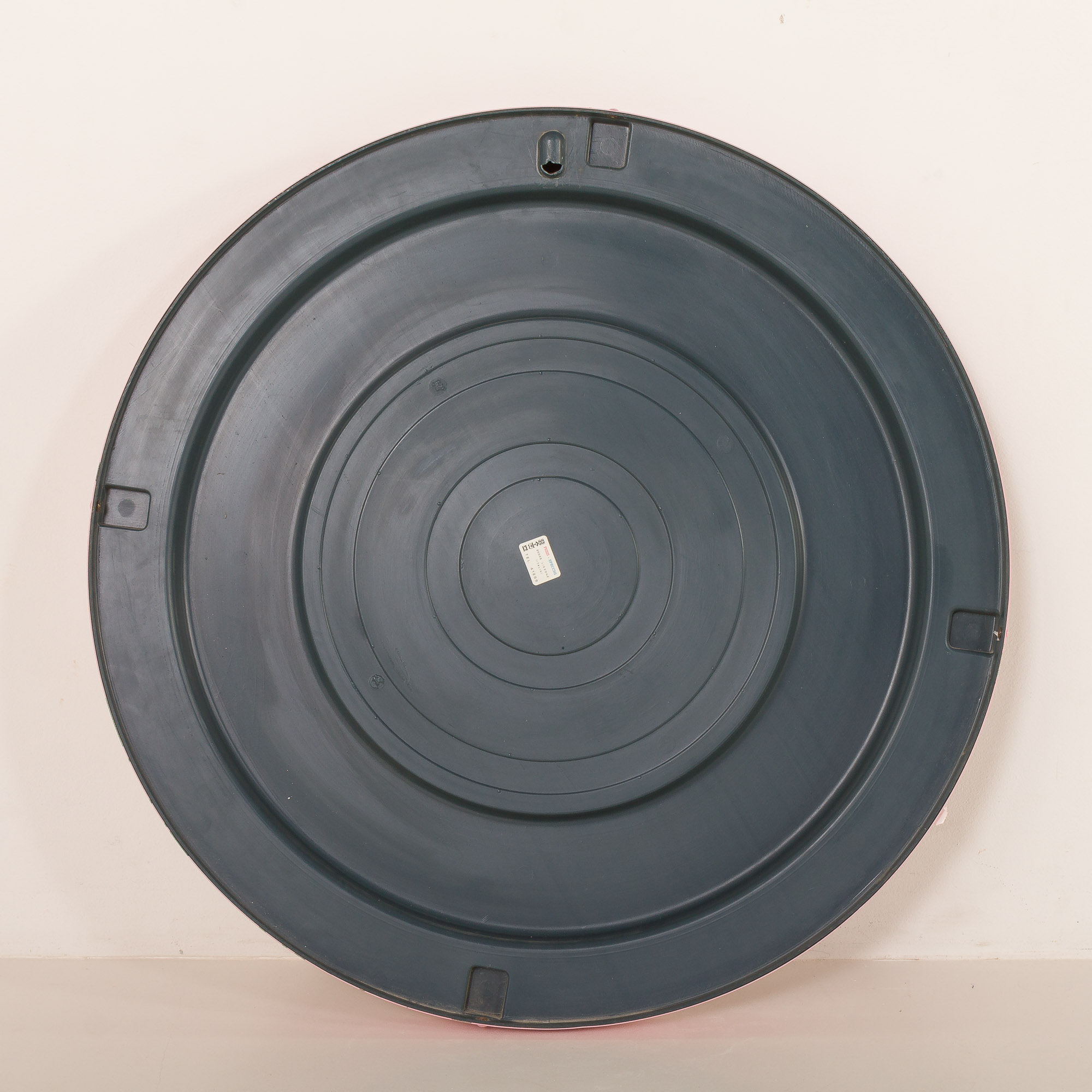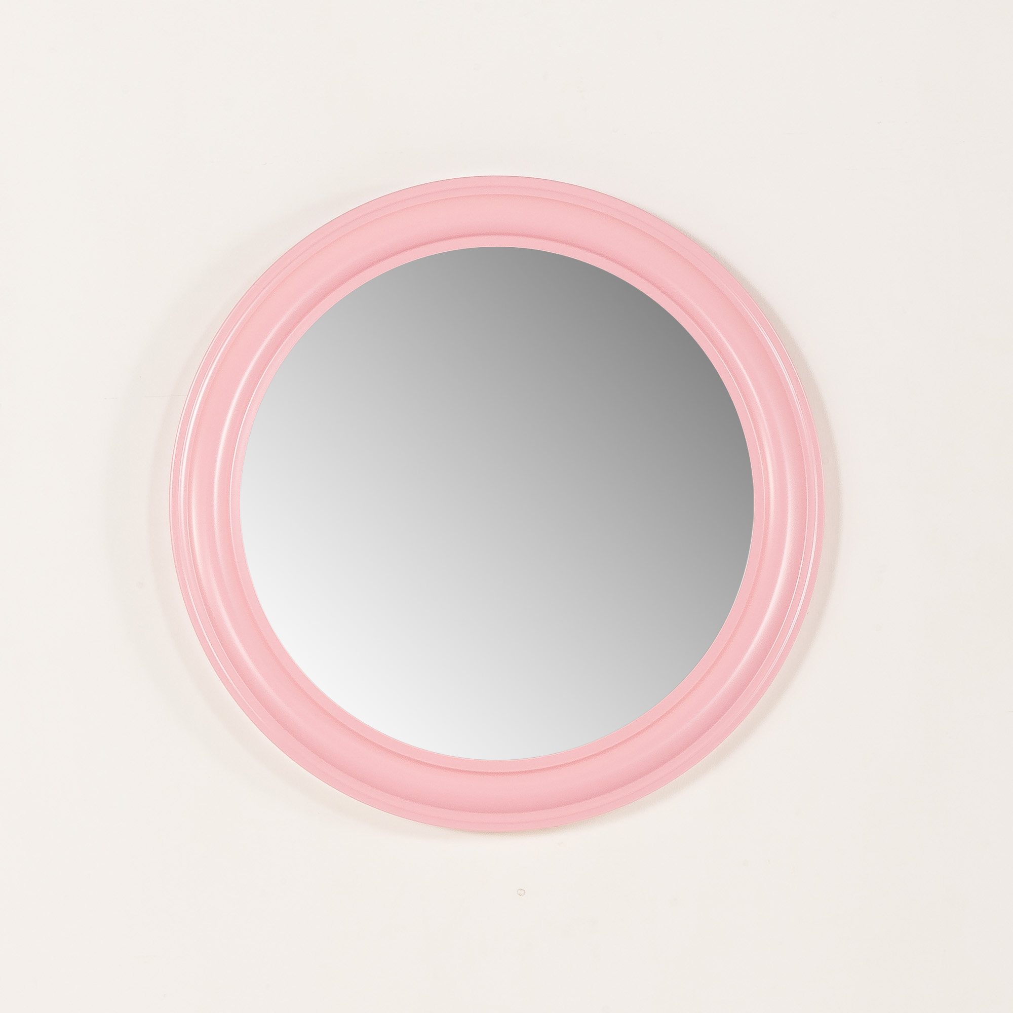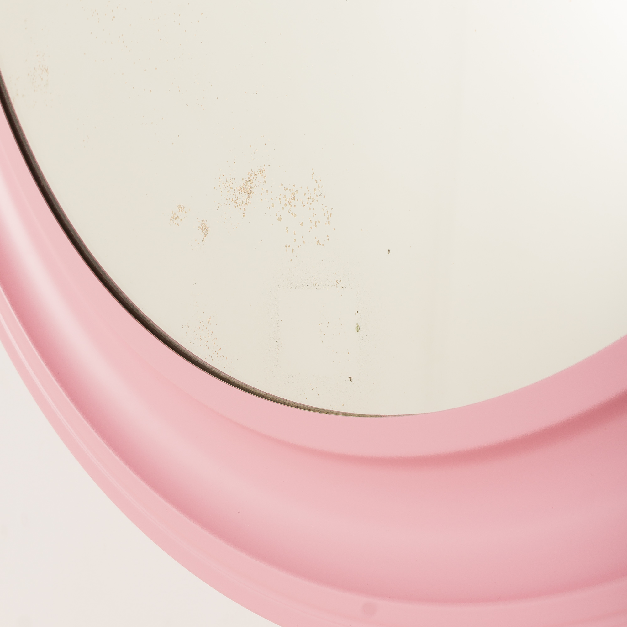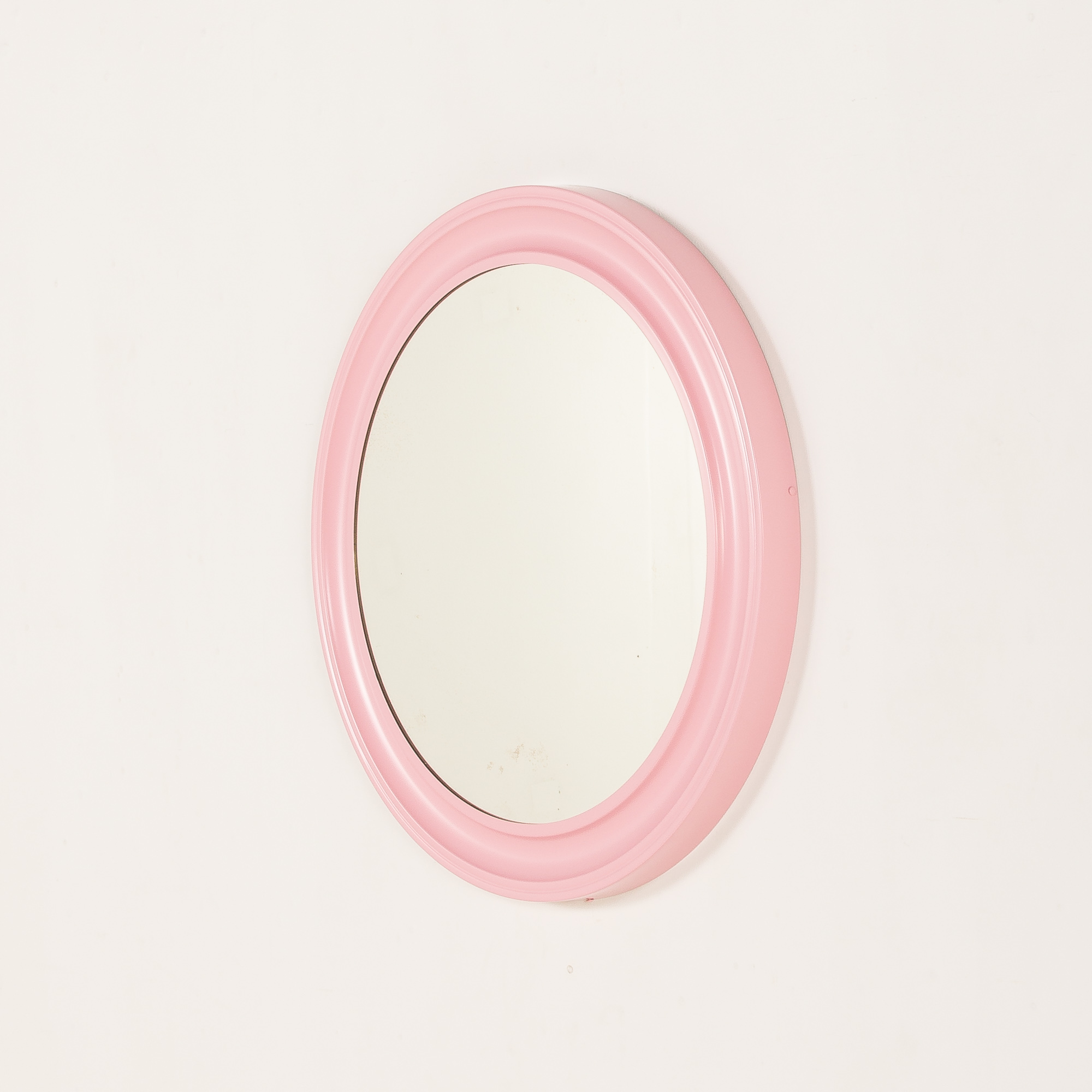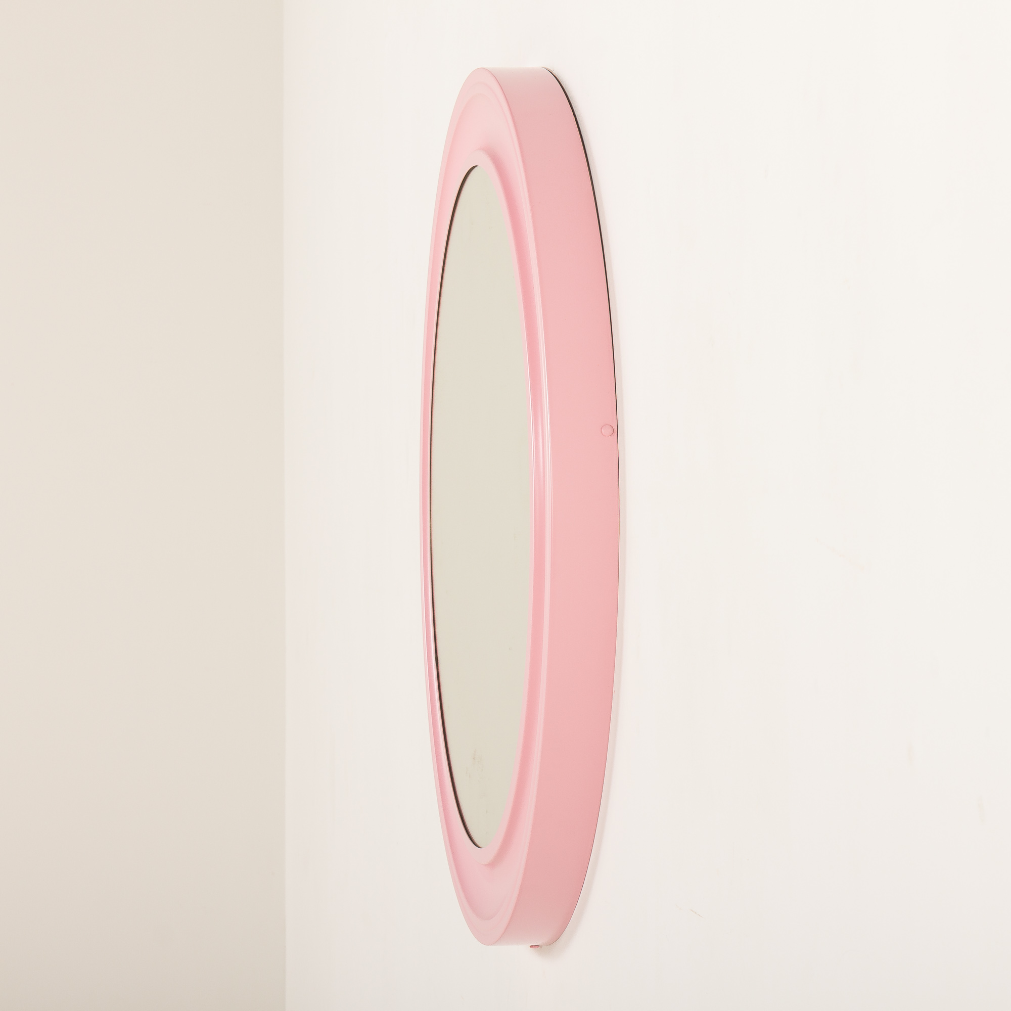 This curvaceous, rounded metal frame features a satin pink lacquer, typical of the era’s fascination with vibrant colors and unconventional forms. The organic shape and light pink color give it a sculptural presence on the wall. Original PI Glass label confirms its authenticity.
