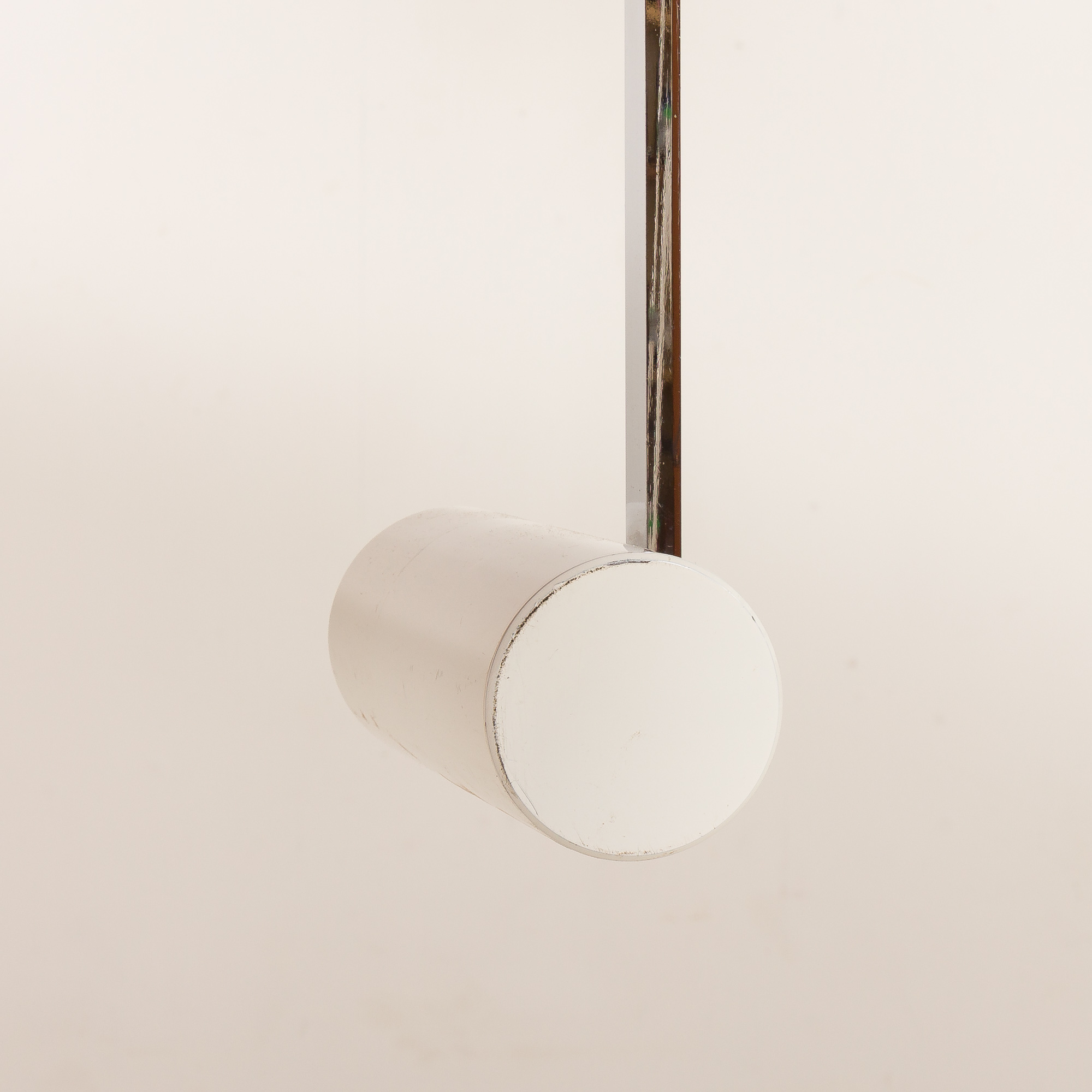The lamp features a hemispherical white opaline diffuser suspended from a slender chromed metal structure with distinctive red-lacquered accents. When illuminated, the lamp emits a soft, diffused light, creating a warm and intimate atmosphere. The most interesting feature of this lamp is that the shade can be placed in various positions: up, down, higher, or lower.