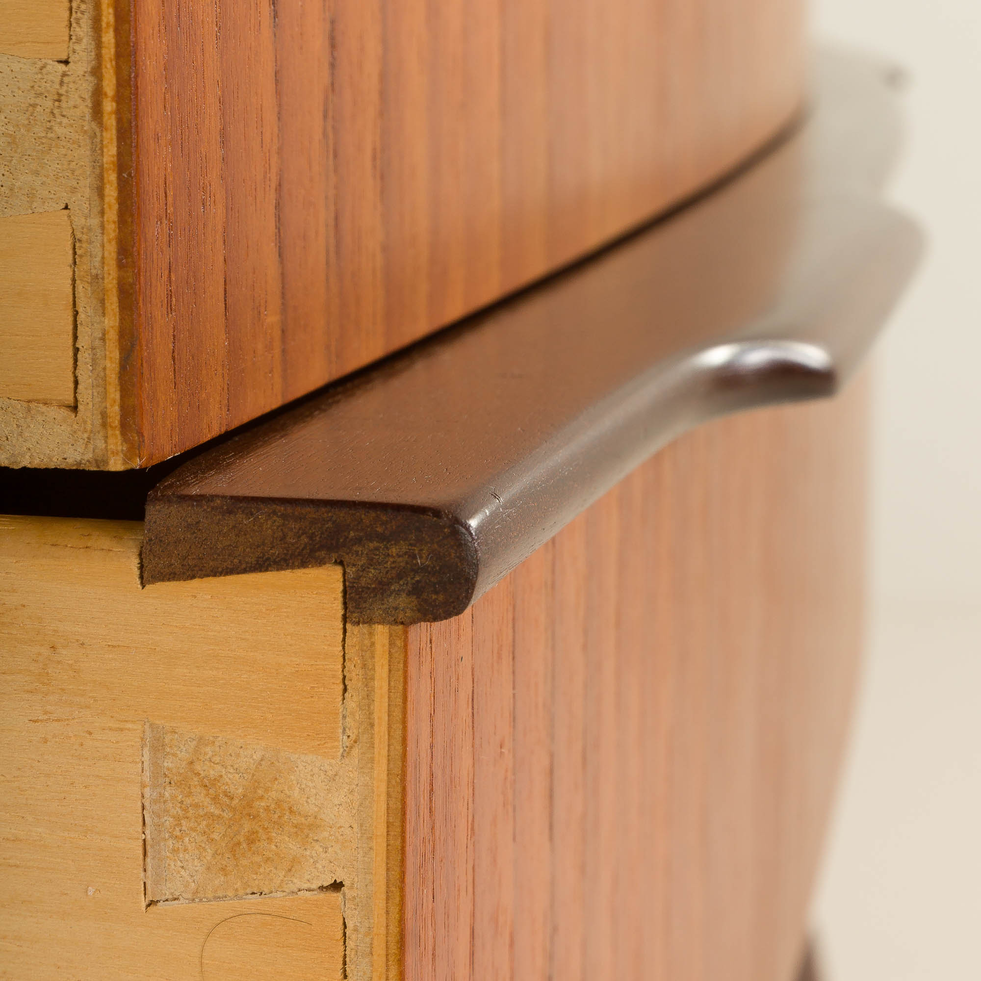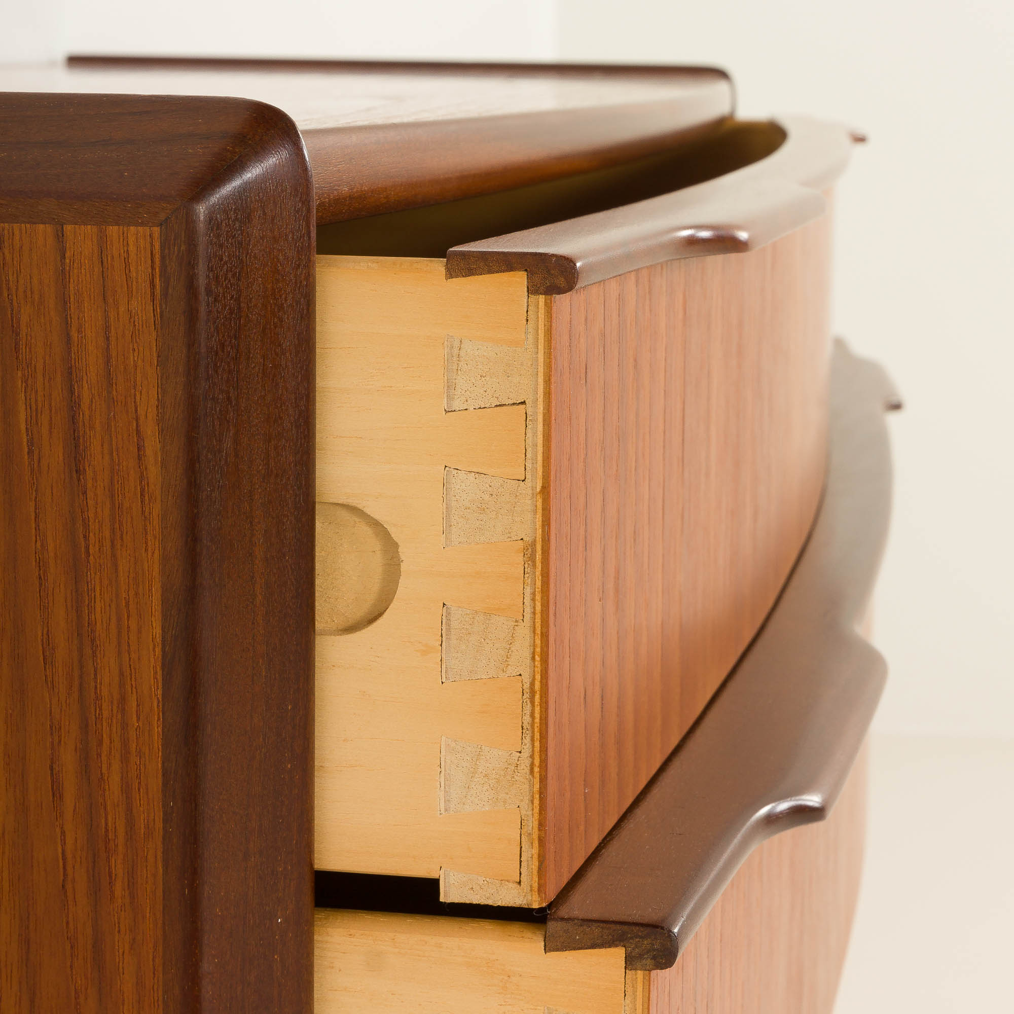 The chest includes five dovetailed drawers, each adorned with two sculptural solid teak handles, and beautifully showcases continuous wood grain flowing seamlessly from drawer to drawer. This precise alignment highlights exceptional craftsmanship, emphasizing attention to detail and the natural beauty of teak. The drawers glide smoothly, reflecting the meticulous joinery and durability characteristic of high-quality Danish furniture.