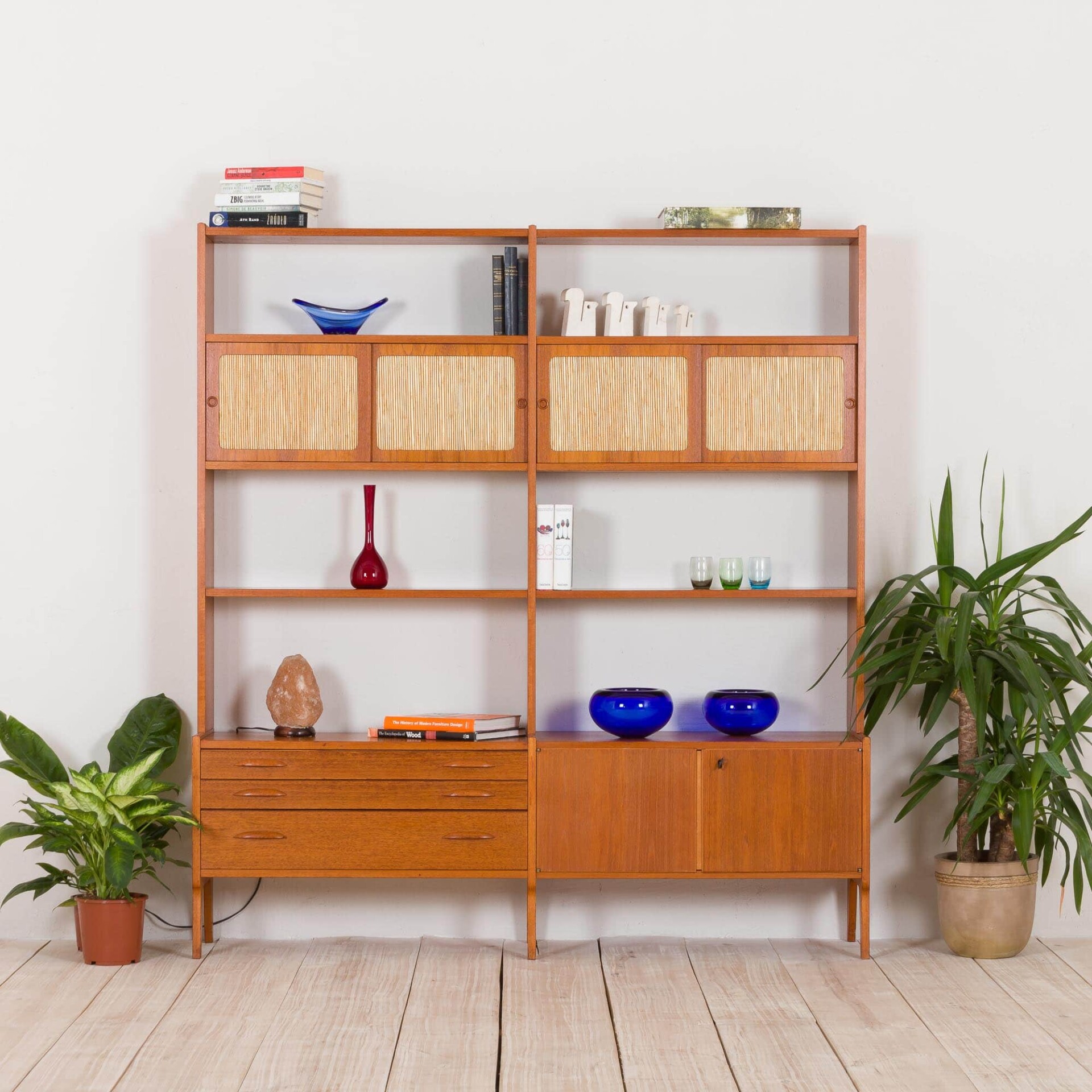 Norwegian modular wall unit in teak with straw sliding doors, 1970s