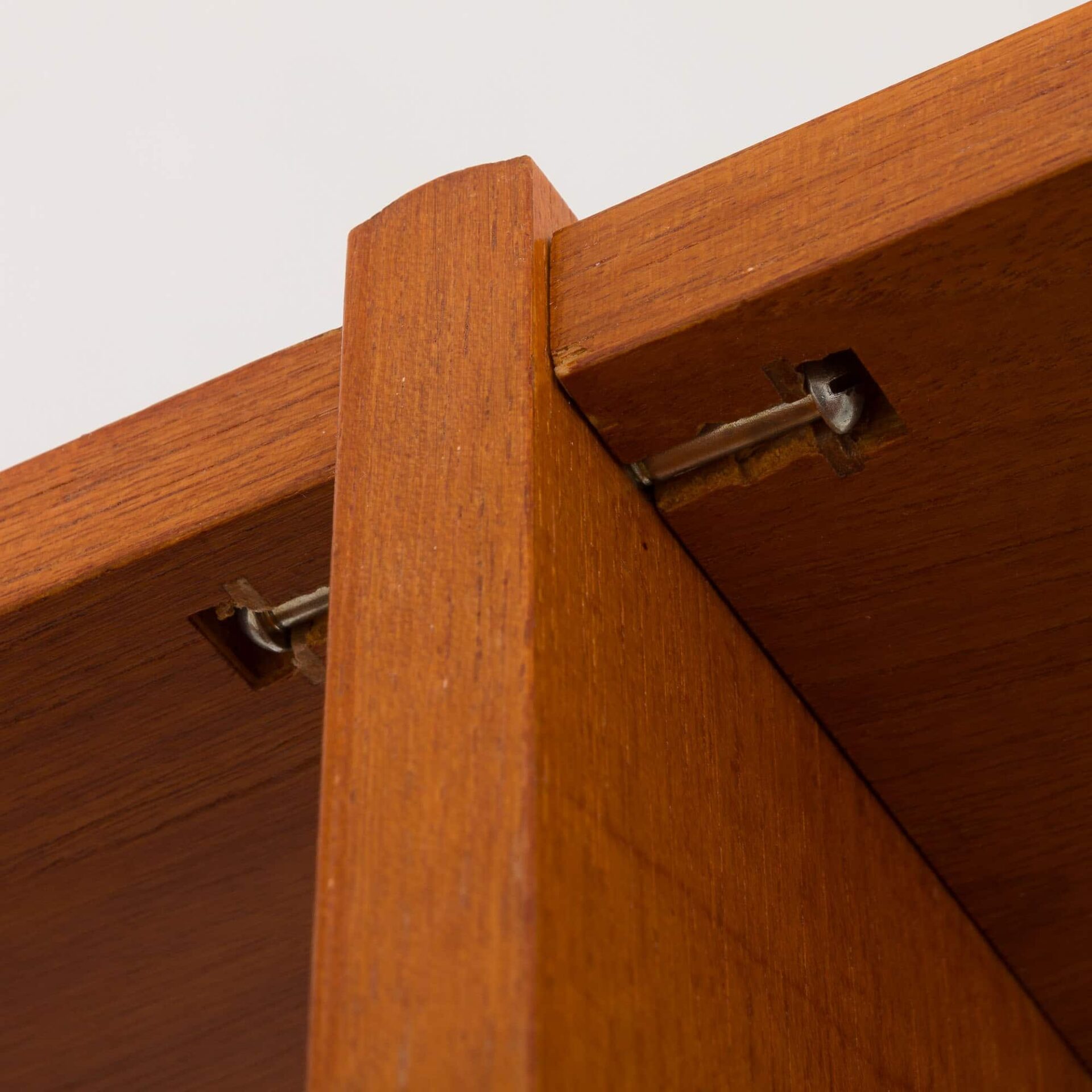 Norwegian modular wall unit, that is a great example of early DIY furniture from 60s and 70s from Scandinavia. As it is well known they conquered the world with its simplicity and easy shipping abilities. Here great execution in teak and also in straw, weaved in the doors panels, which adds very mid century look. The unit consists os several parts put together with screws and pegs, very easy to assembly. Very good original condition including the key and quality control sticker for the top quality pieces of Norway in the mid 20th century.