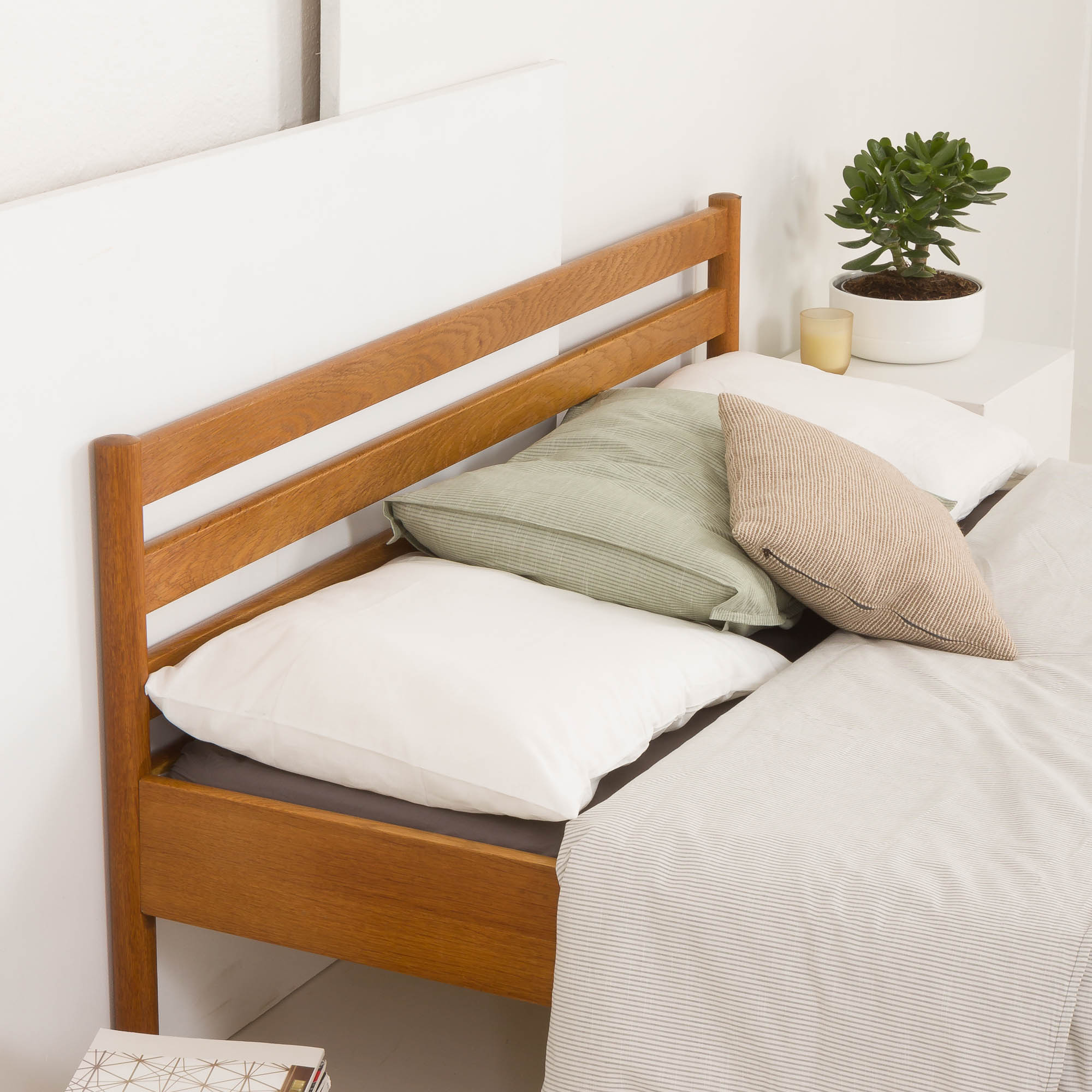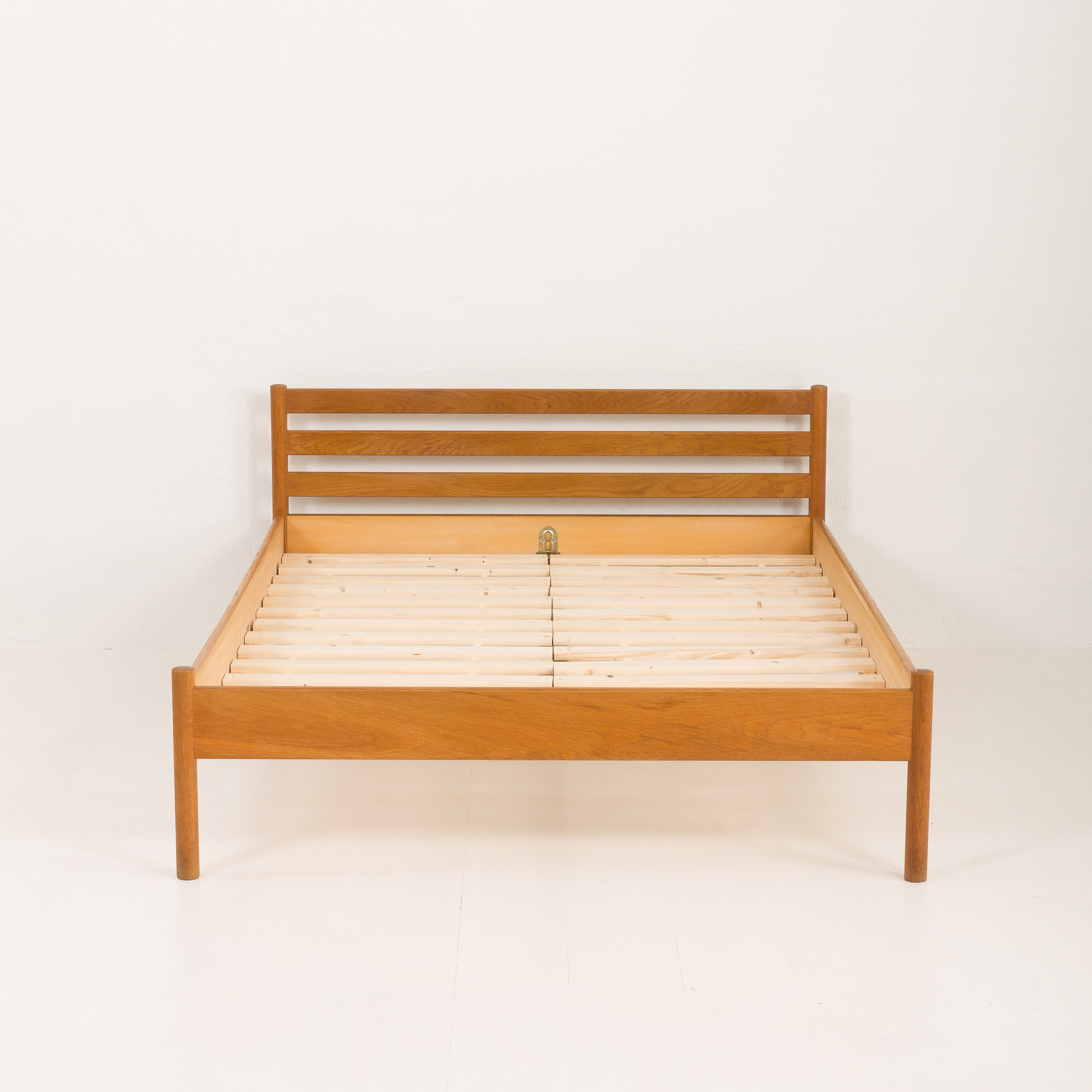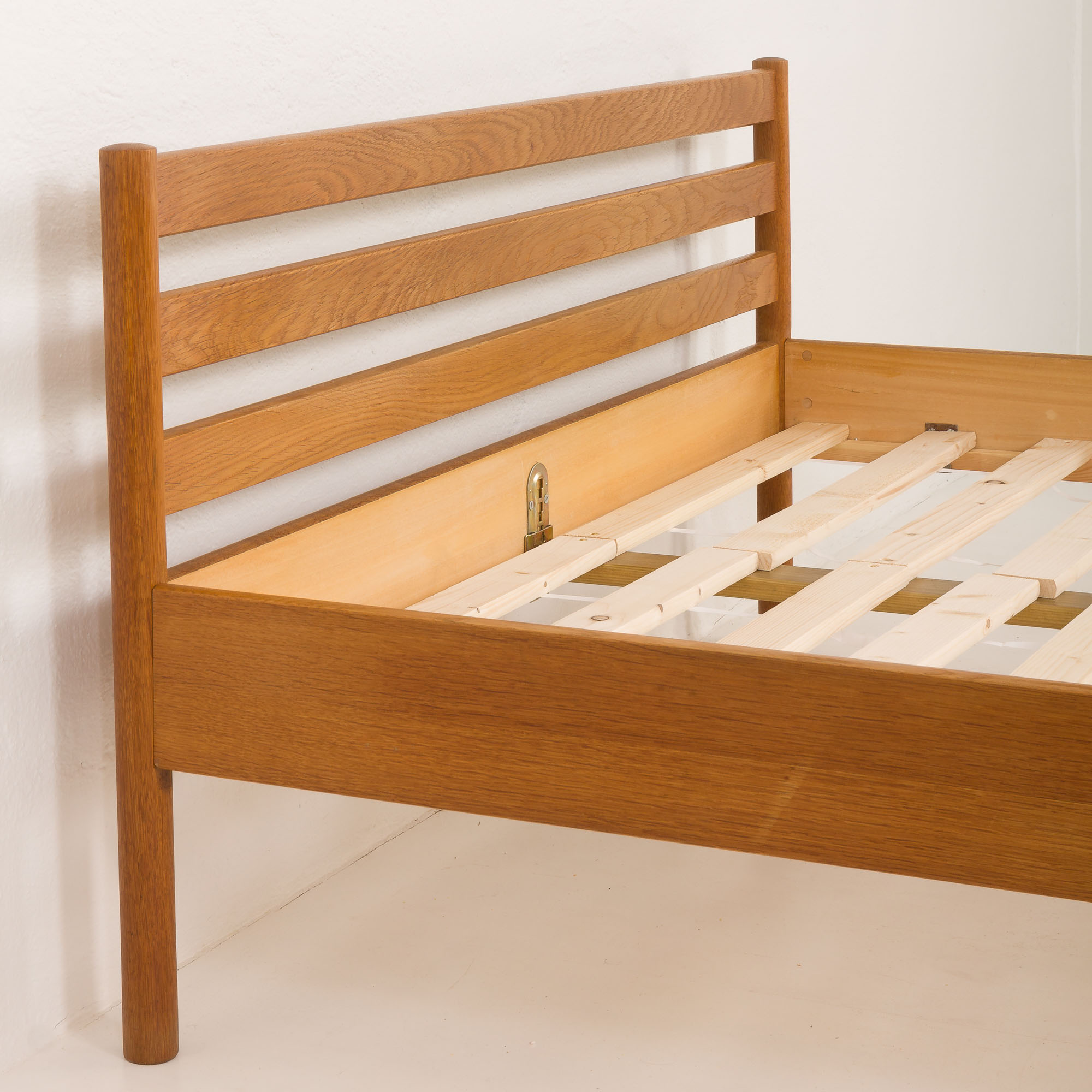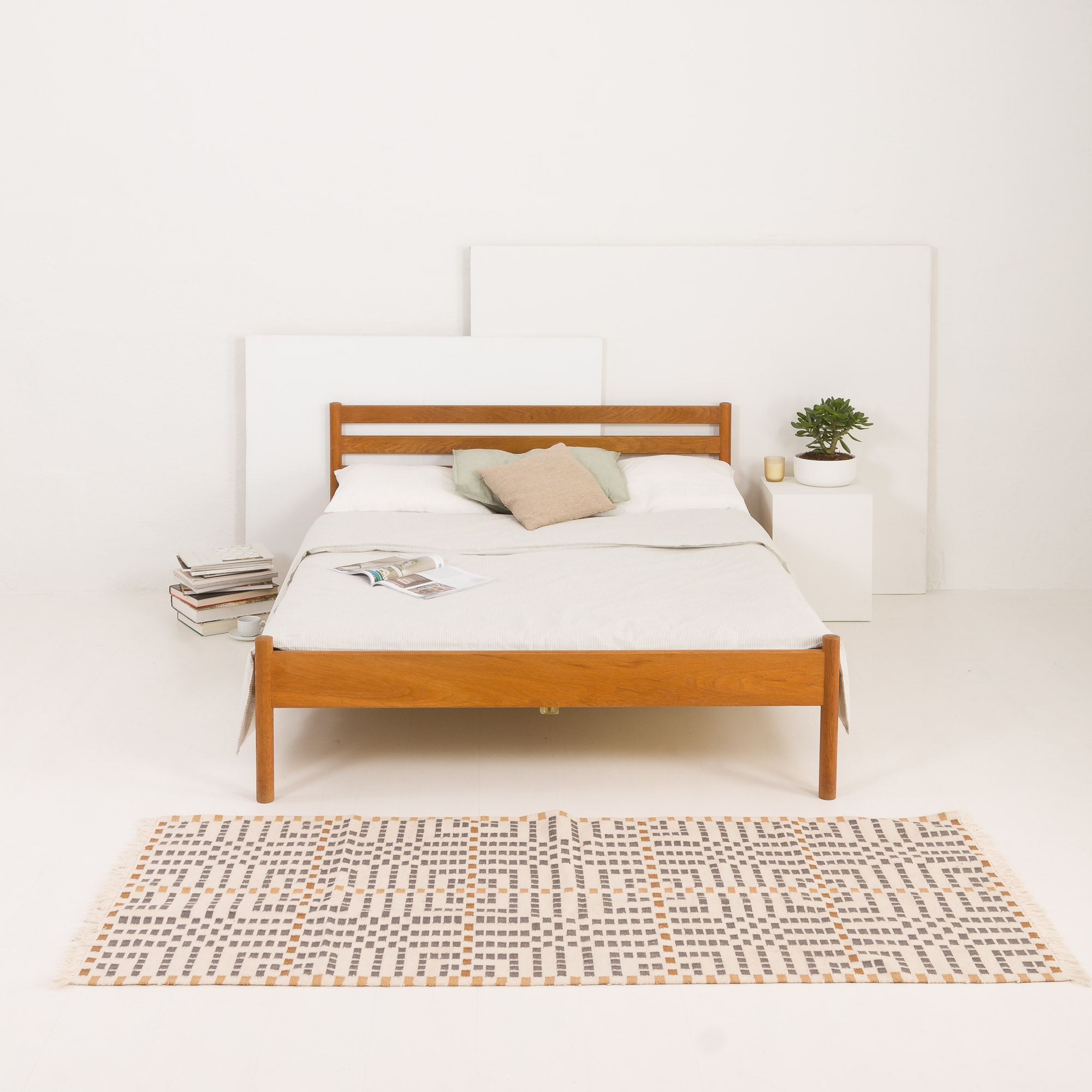 The oak bed frame is in perfect original condition with only minimal signs of use consistent with its age. As the mattress support frame is an essential part of the bed’s structure, we replaced the old one to ensure maximum stability and provide adequate support, crucial for sleep comfort. Although this is a mid-century piece, Wegner’s frame design is thoughtfully crafted to facilitate easy assembly and disassembly. Precise construction and well-fitting components make putting the bed together intuitive and straightforward. The wooden frame has been cleaned and refreshed with professional compounds to enhance the beauty of the wood, making it a perfect example of comfort and practicality without compromising on style.