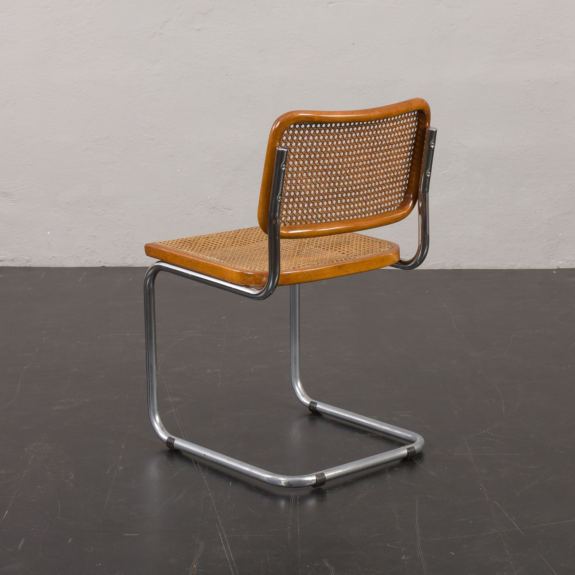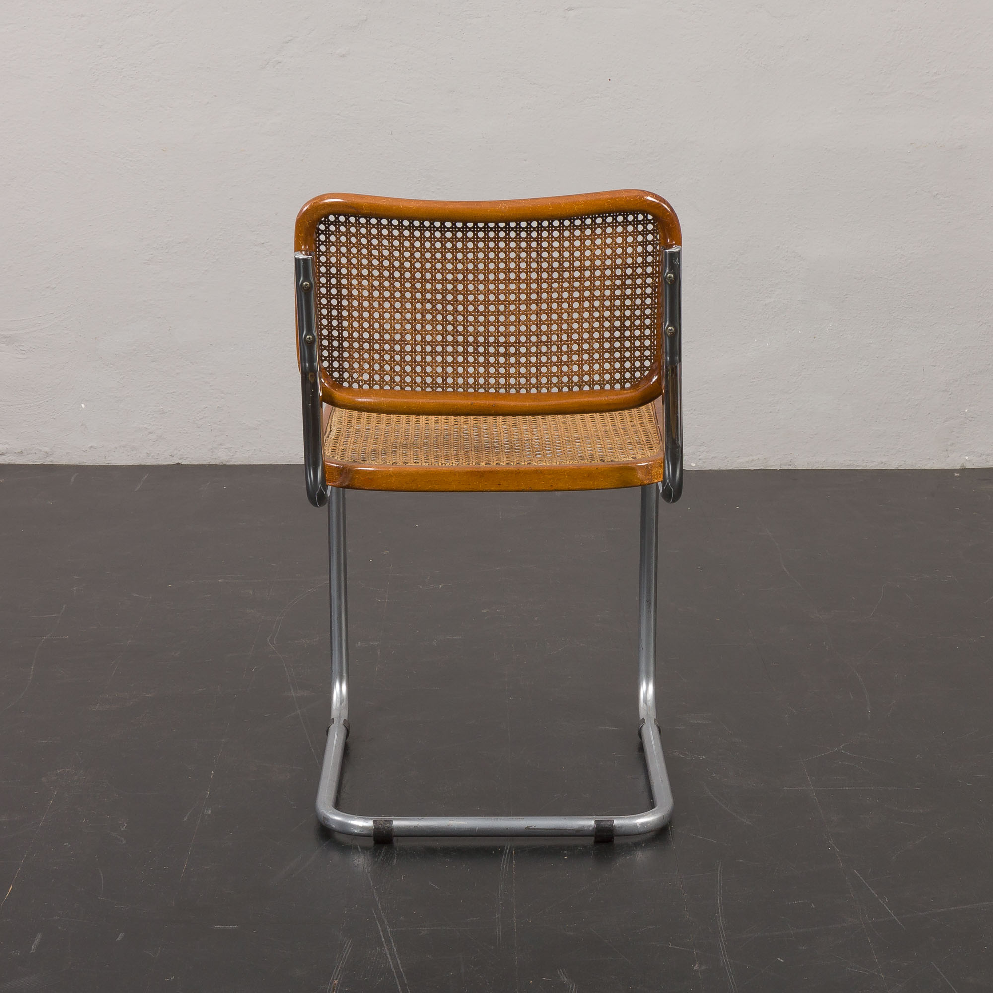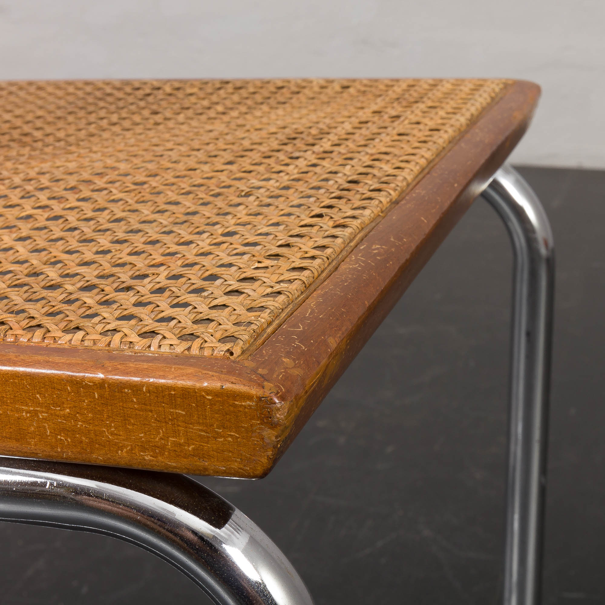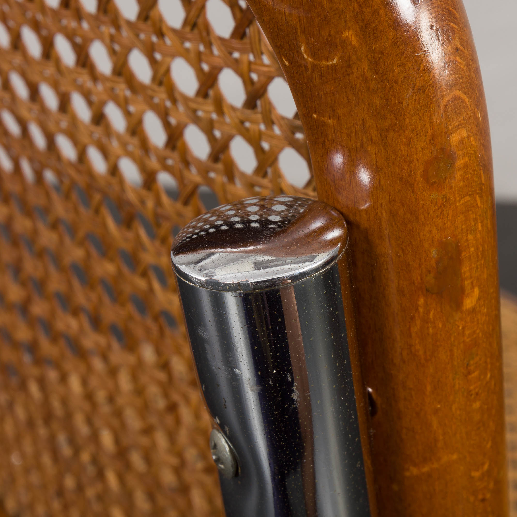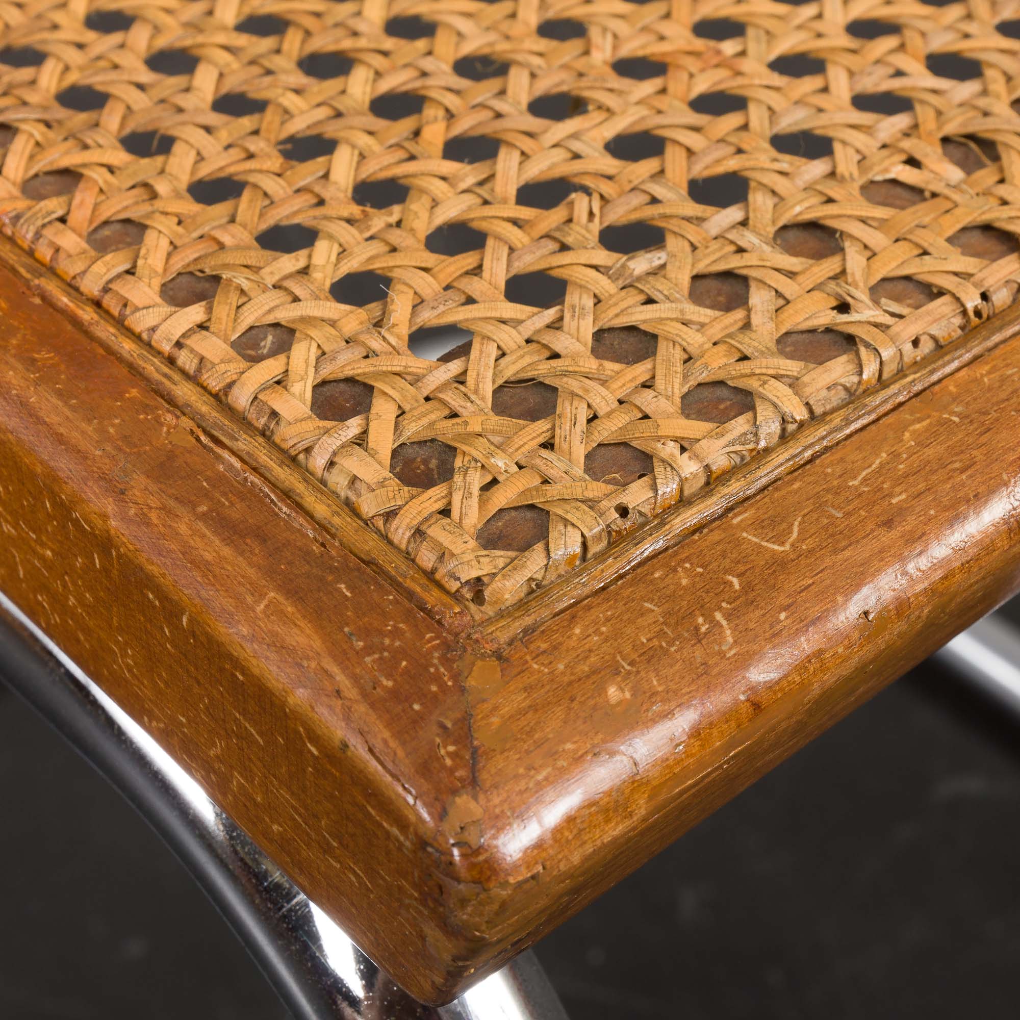 The chrome frames show some minor discoloration but no corrosion. Light scratches on the beech frames add character and do not detract from the overall aesthetic.