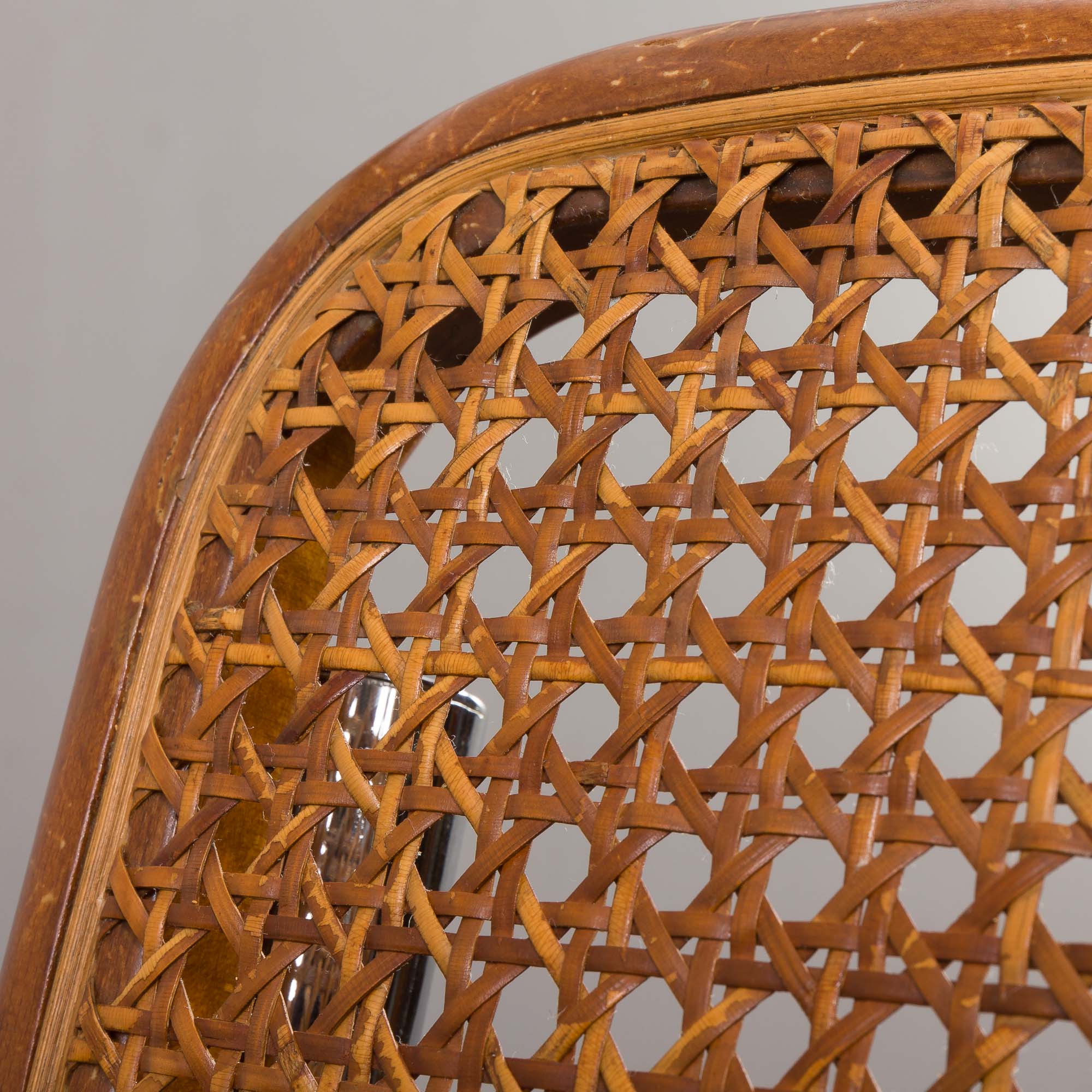 These chairs have a tubular steel frame that supports a seat and back made from meticulously woven cane, giving them a distinctive and timeless look. The honey-brown color of the cane weaving has aged beautifully over time, with a lovely patina that enhances the chair’s warm appearance. The natural beech frame, with its rich brown hue, is quite rare.