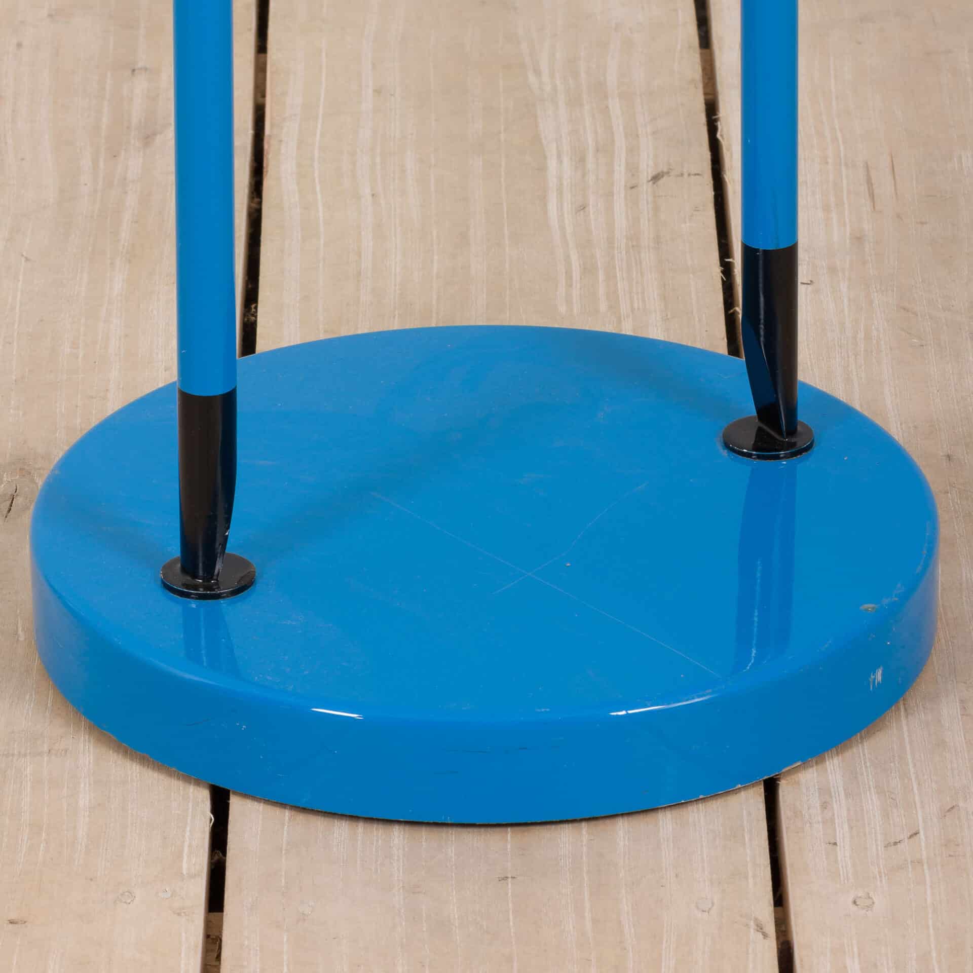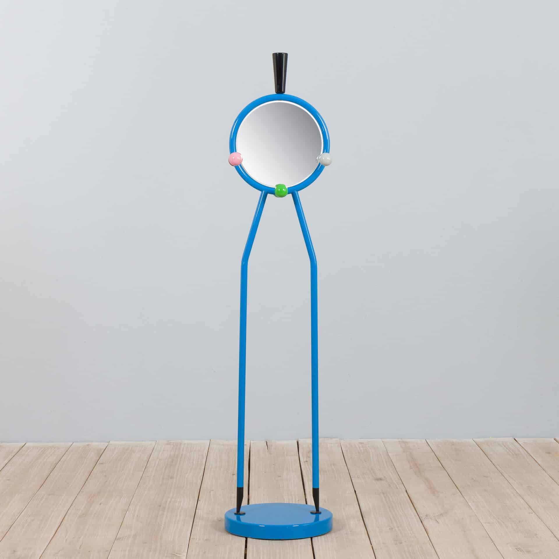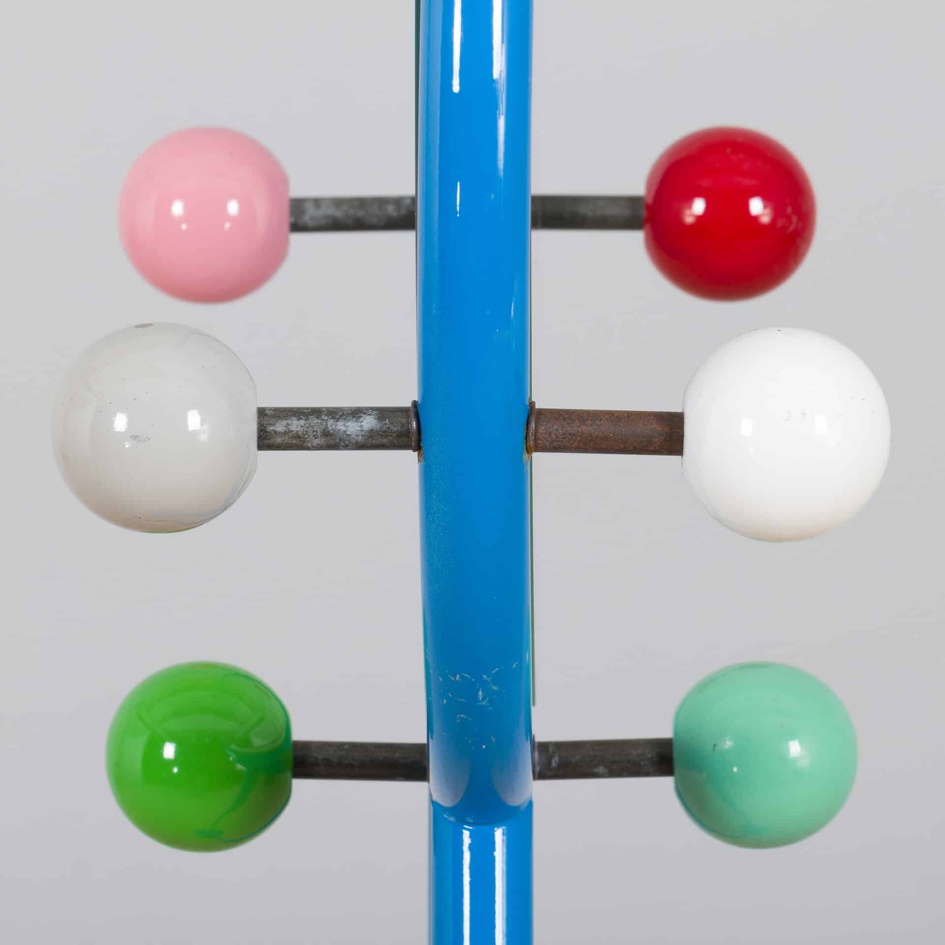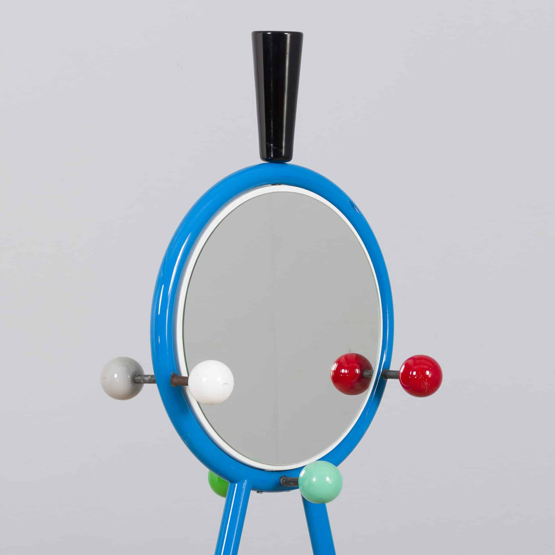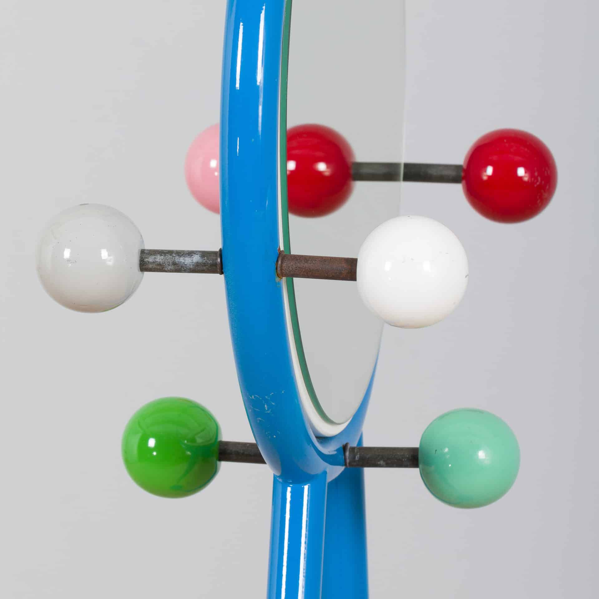 A large blue free-standing metal coat rack with a mirror on each side was made in the 80s in Italy. It features three colorful balls assembled on each side for hanging and two round mirrors with a diameter of 30 cm. The piece is made in varnished metal with wooden balls. Great vintage original condition with a few very slight colour abrasions on the frame and foot. The original paint is still very well preserved.