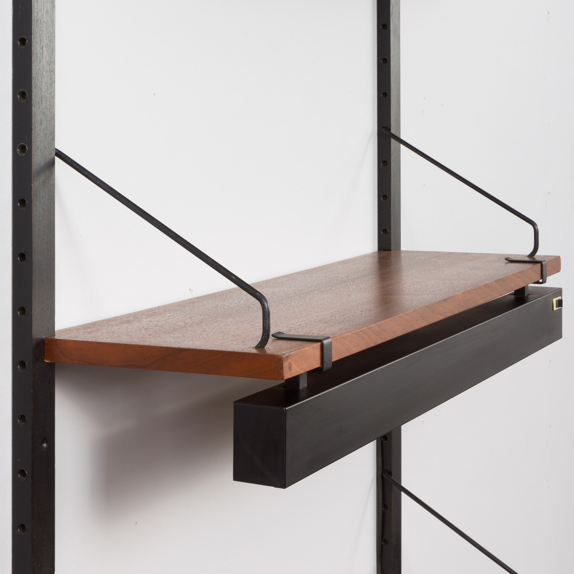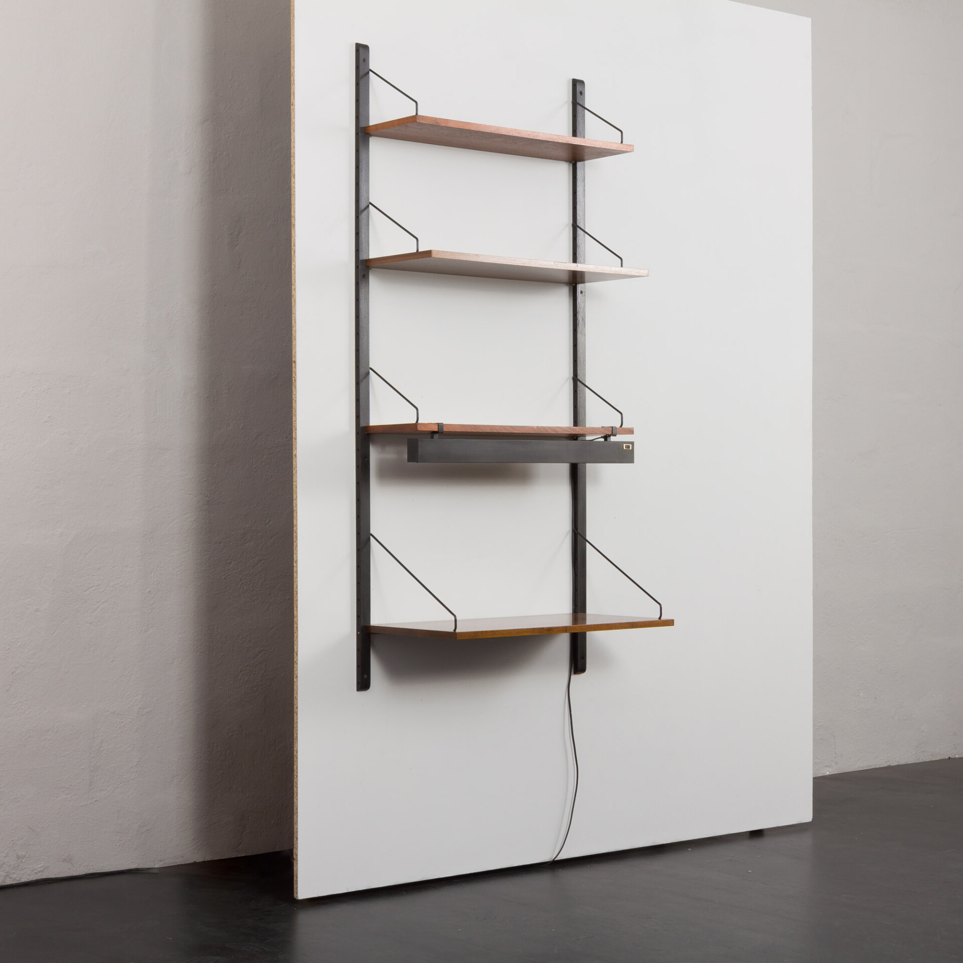 A simple yet elegant walnut wall unit with a desk and shelf light, designed by Poul Cadovius for Cado in the 1960s, is an alternative to a traditional desk and ideal for a home office space. It can be placed in a bedroom, or a living room, saving space and providing a discreet working area. It features a writing desk-shelf with a portable lamp and three shelves, including two deeper ones (24 cm). It is made of walnut with black metal hardware and black varnished solid wood rails.
