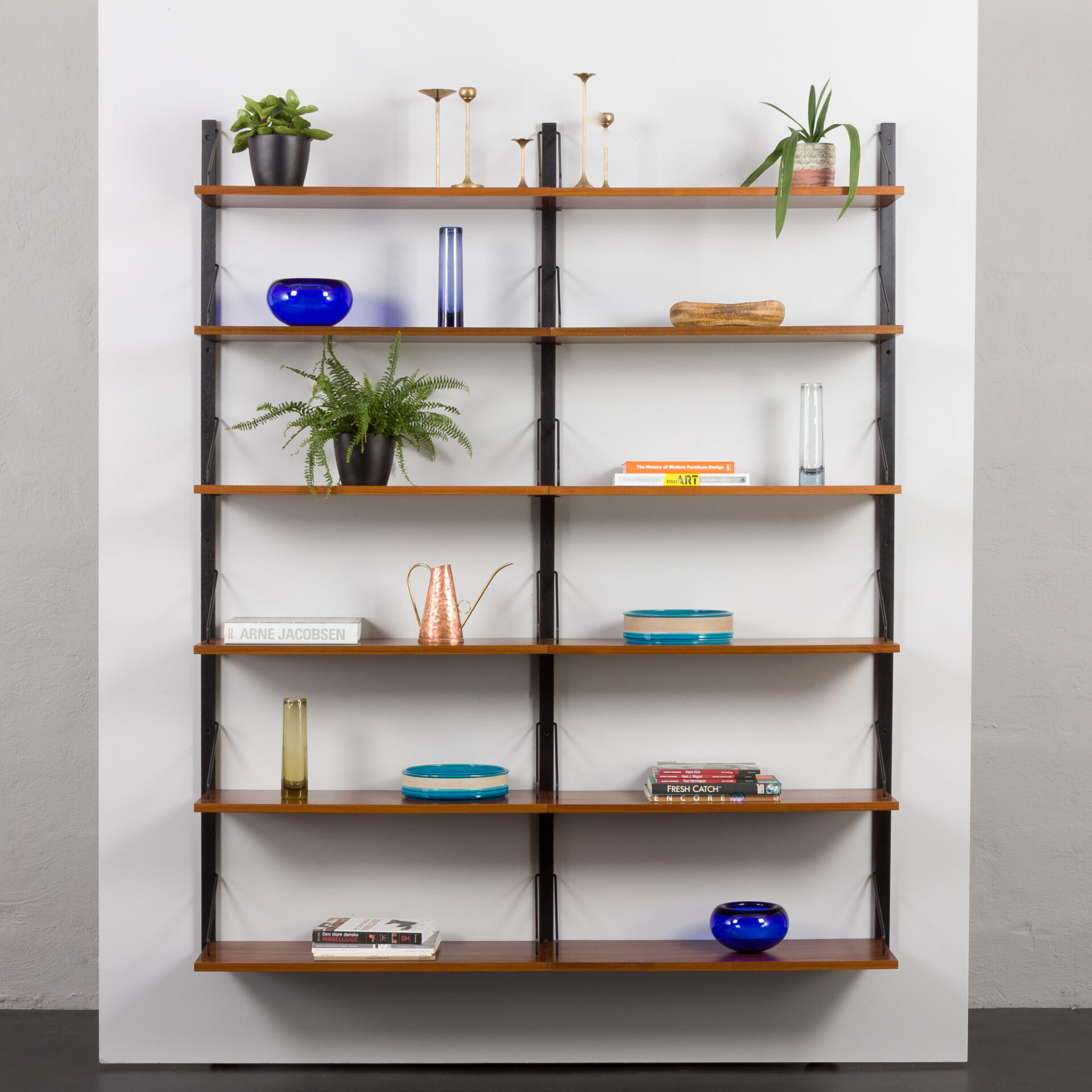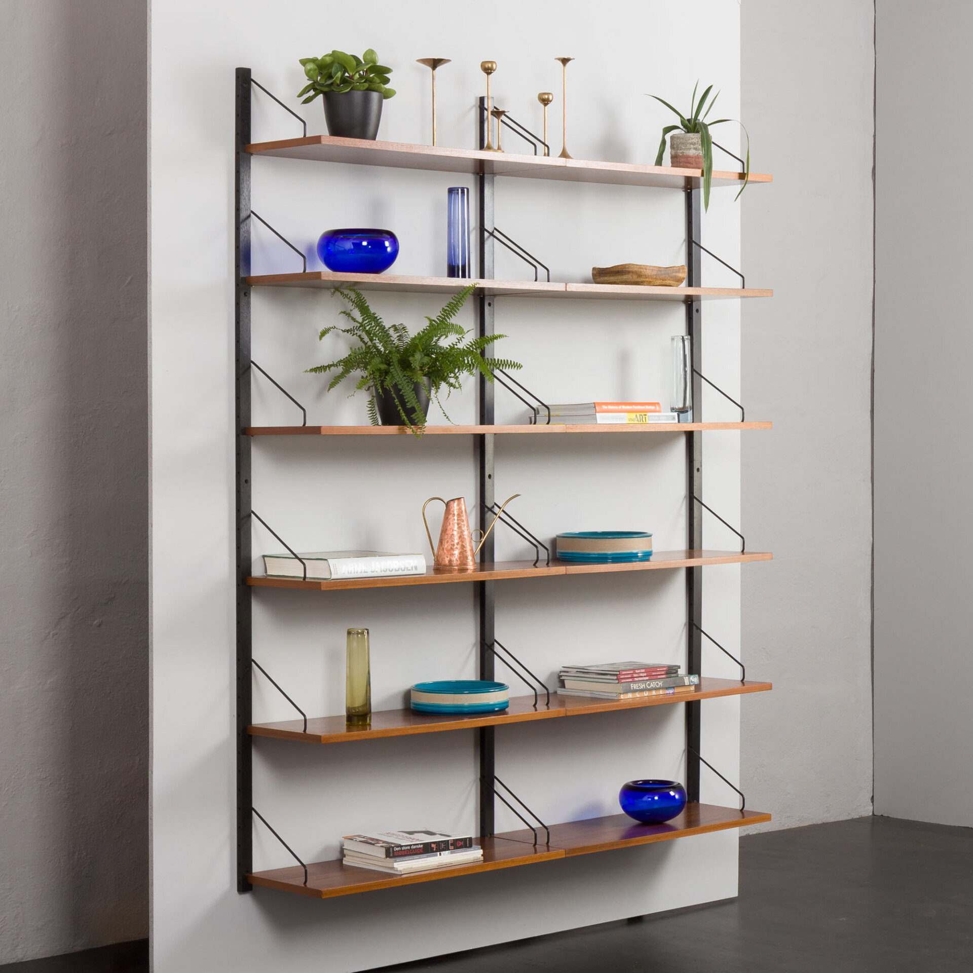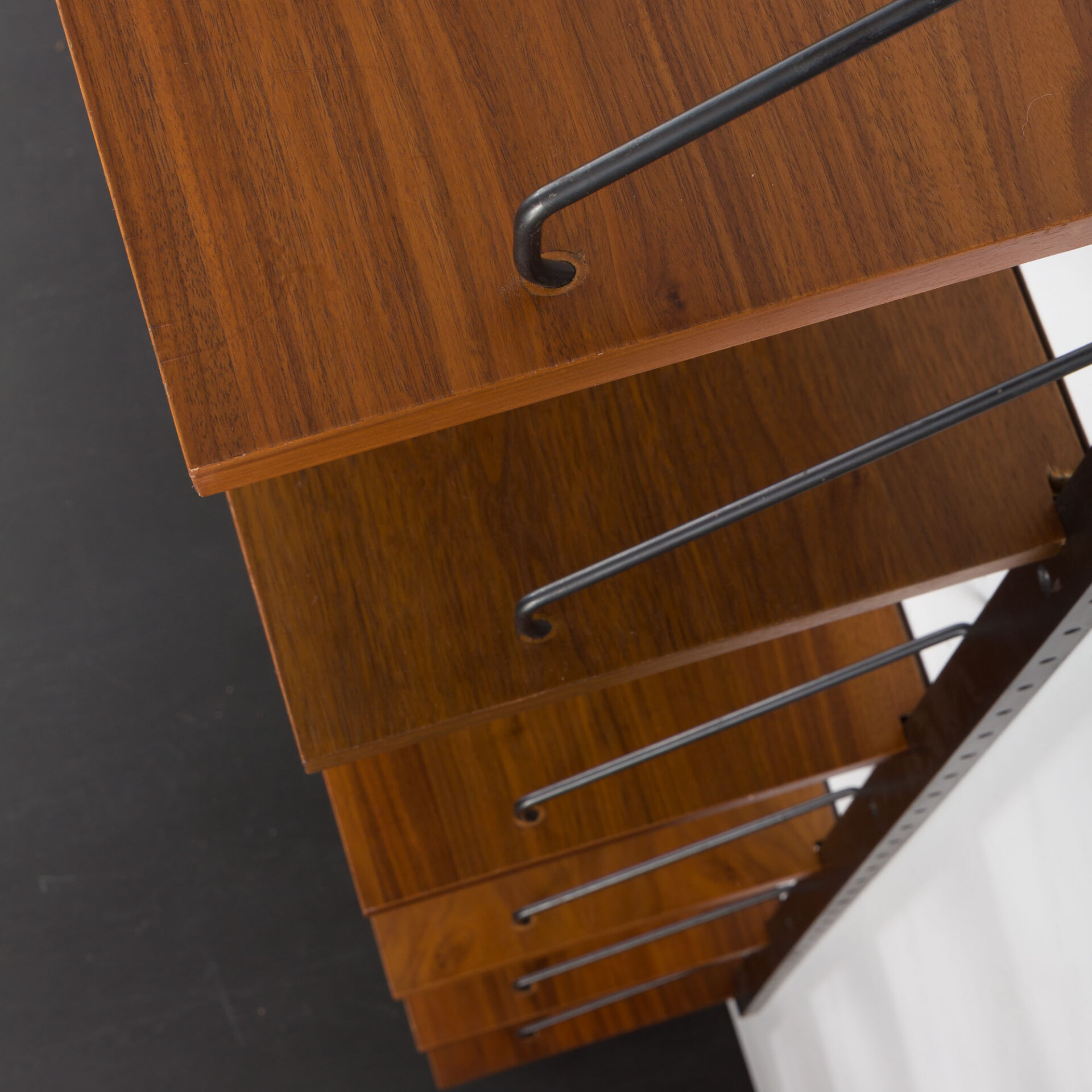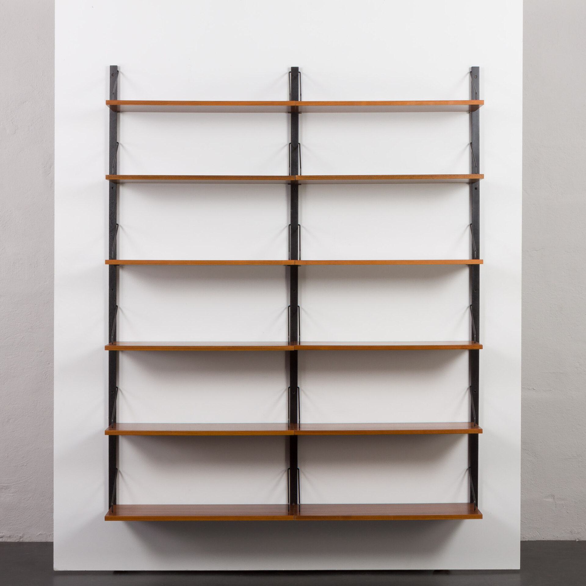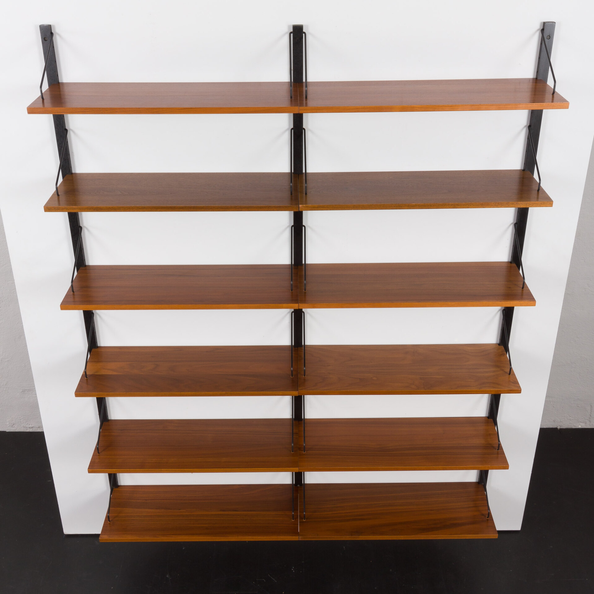 A very practical mid-century walnut set of twelve 30cm walnut shelves, designed by Poul Cadovius and manufactured by Cado in the 1960s. The piece is a fine example of Danish carpentry from the mid-century era and is considered of the highest quality. This stunning modular wall unit is a beautiful addition to any room. Twelve large, 30cm deep shelves, with “made in Denmark” engraved on the back. It also provides plenty of storage space for bigger albums and magazines. The shelves are conveniently hung on three black varnished rails, each 200cm long, with black metal hangers. The rich grain of walnut contrasting with black details makes it a sculpture-like showcase piece on any wall.