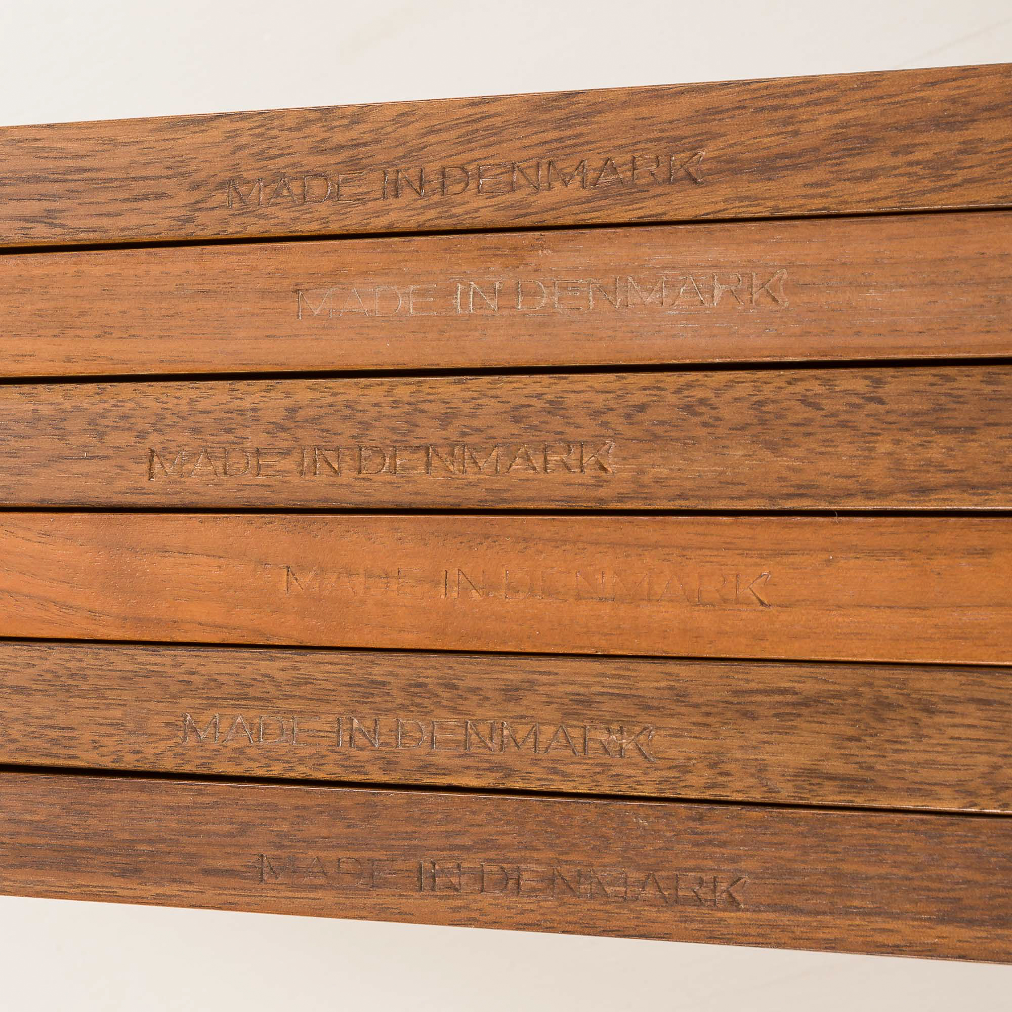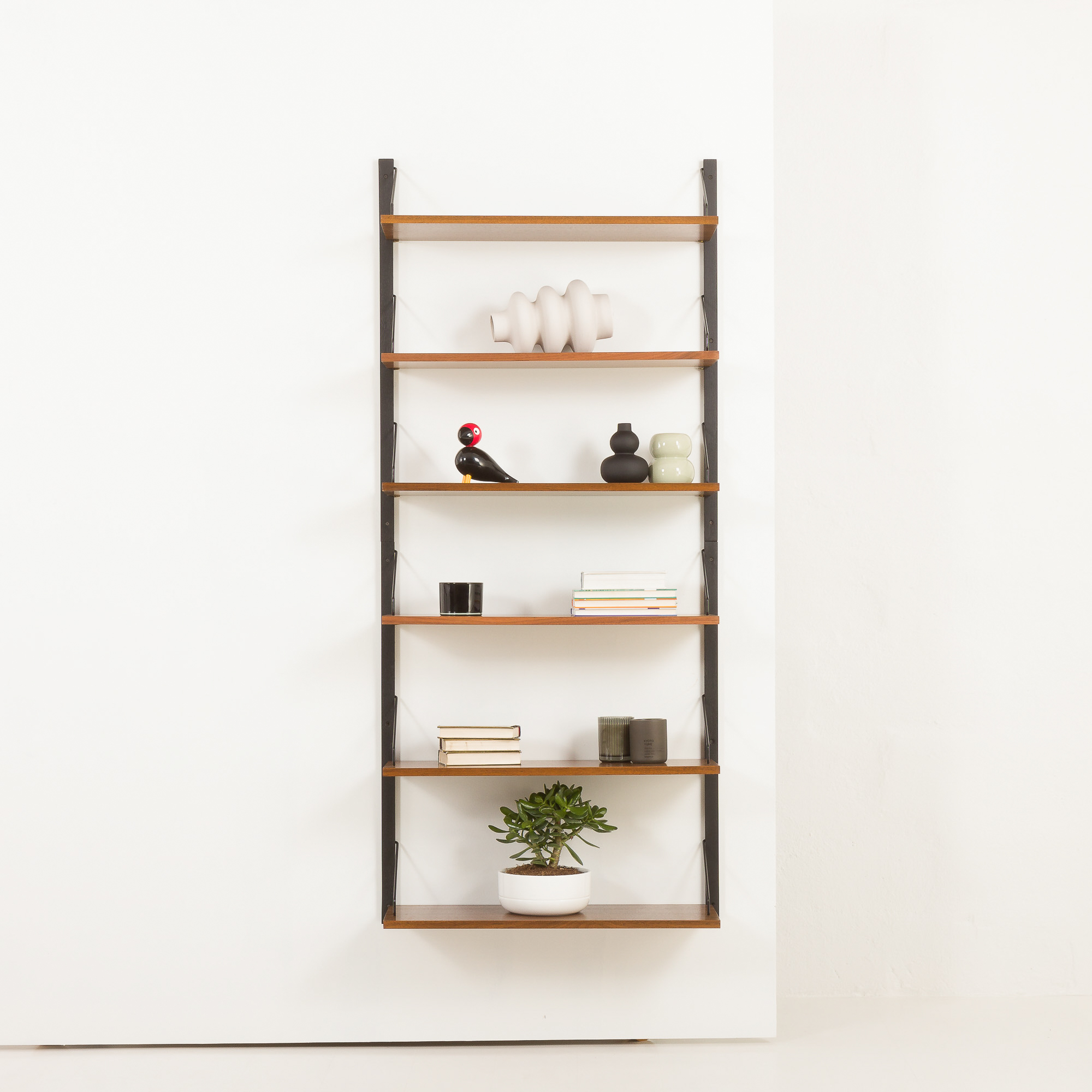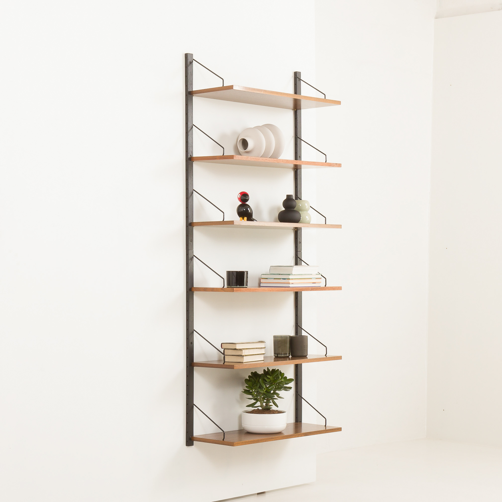 The set has been checked by our team. It is in excellent vintage condition. Each shelf has engraved inscriptions: “Made in Denmark”. All components fit together. The wood has been cleaned and rejuvenated with professional compounds.