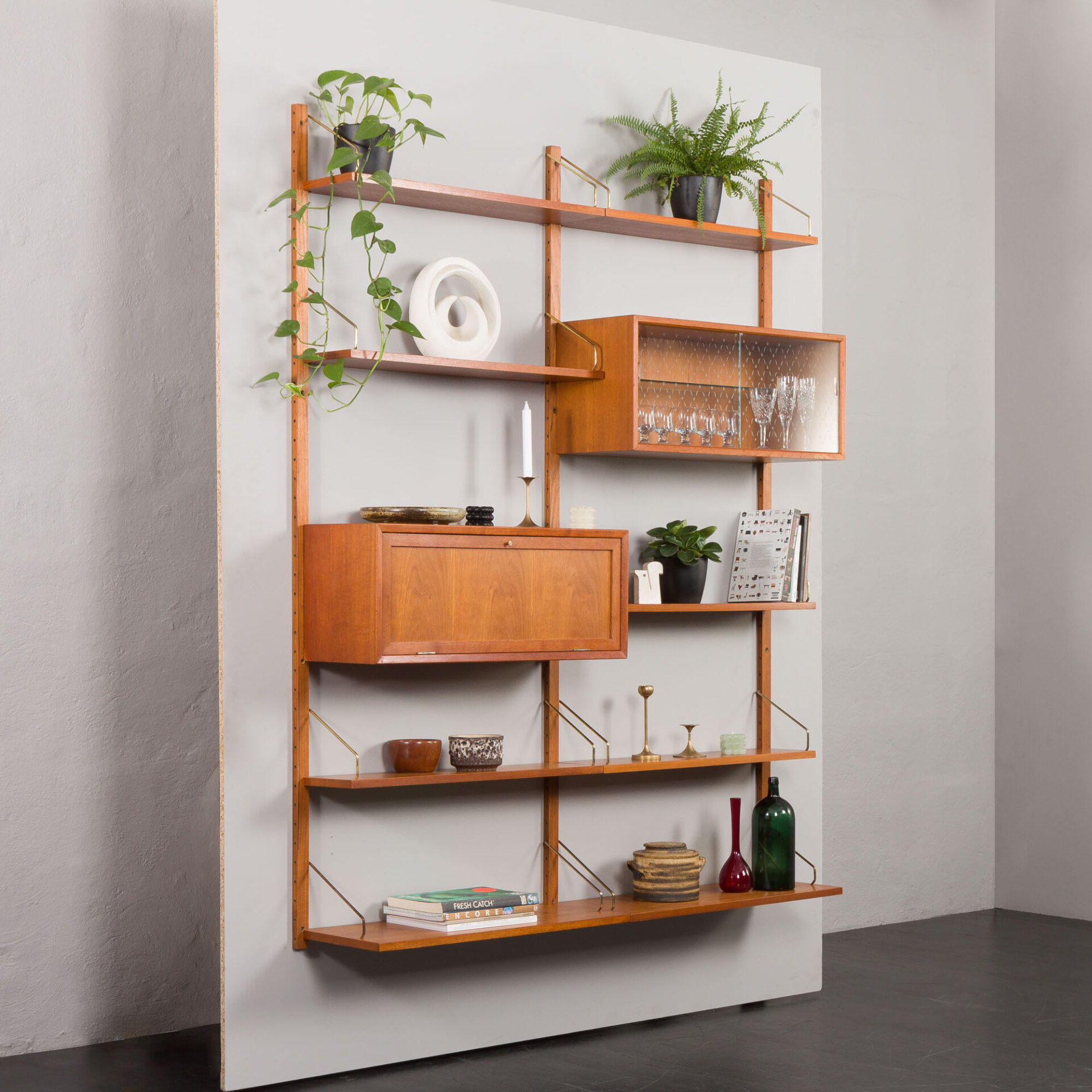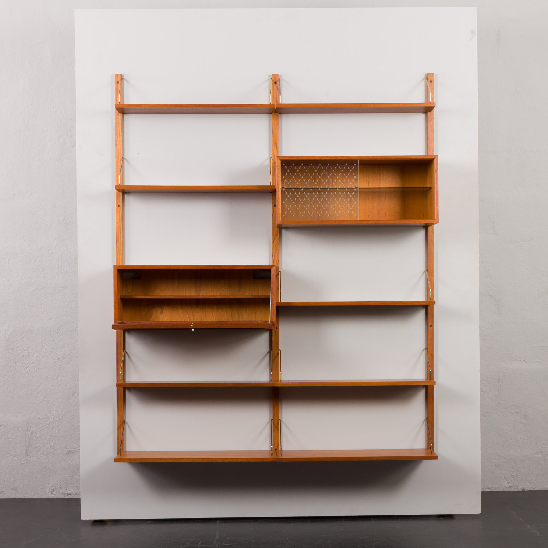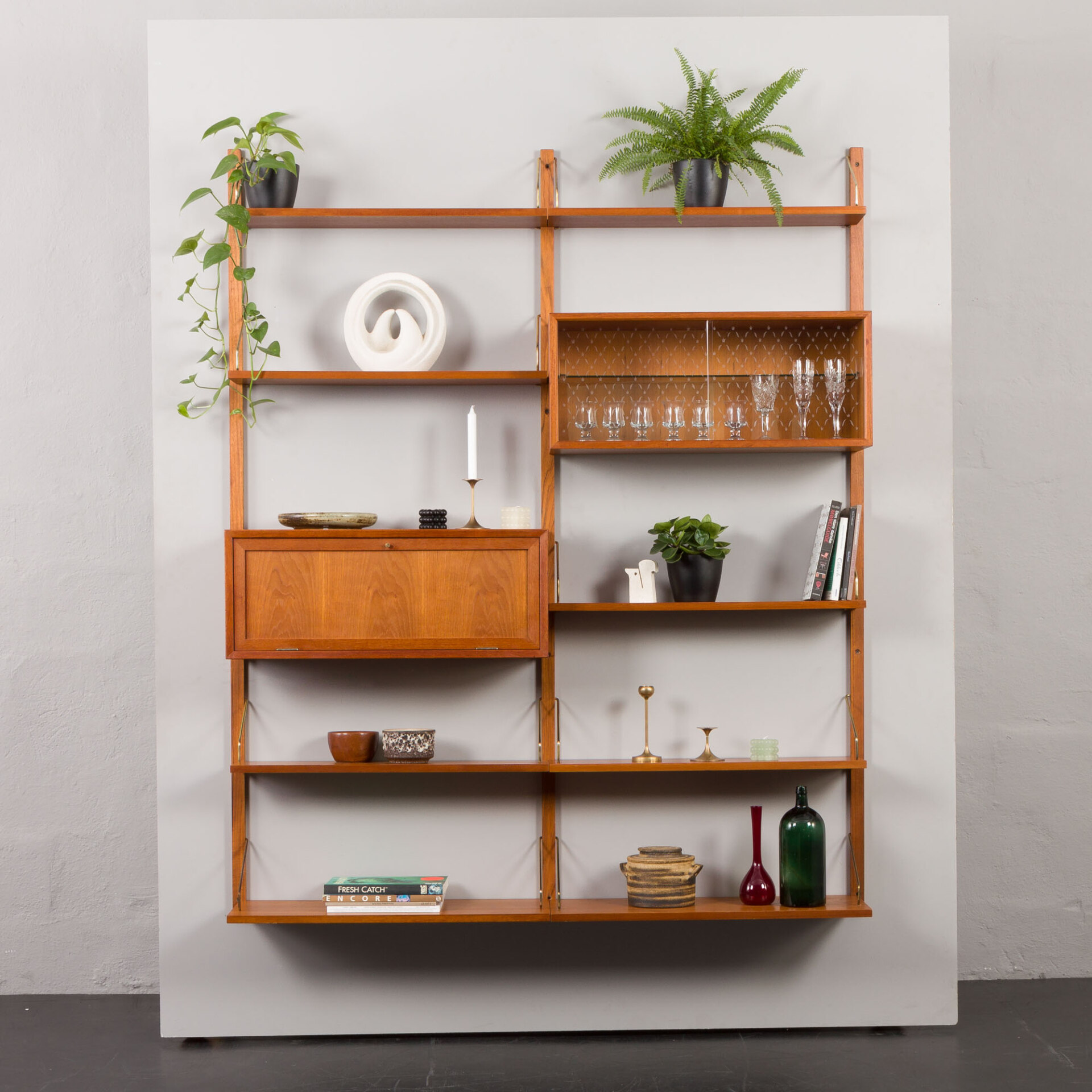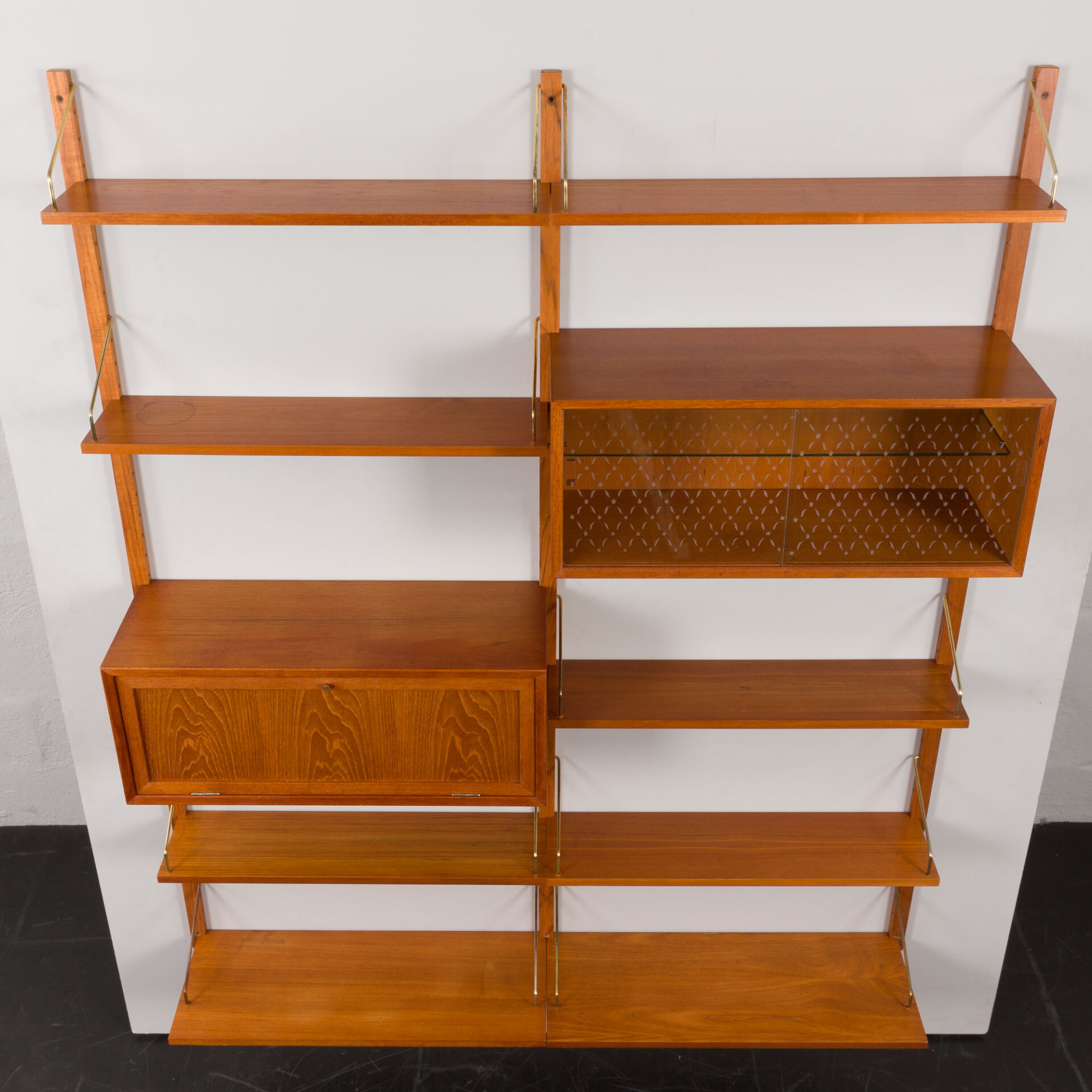 Danish mid century modern teak wall unit designed by Poul Cadovius was manufactured in the 1960s. It is a fully modular shelving system with interchangeable parts that can be arranged upon one’s need. Placed lower, higher moved to another section. The wall unit features a functional bar cabinet, glass cabinet and eight shelves, which provide enough space for storage and exposing a lot of books and decorations.