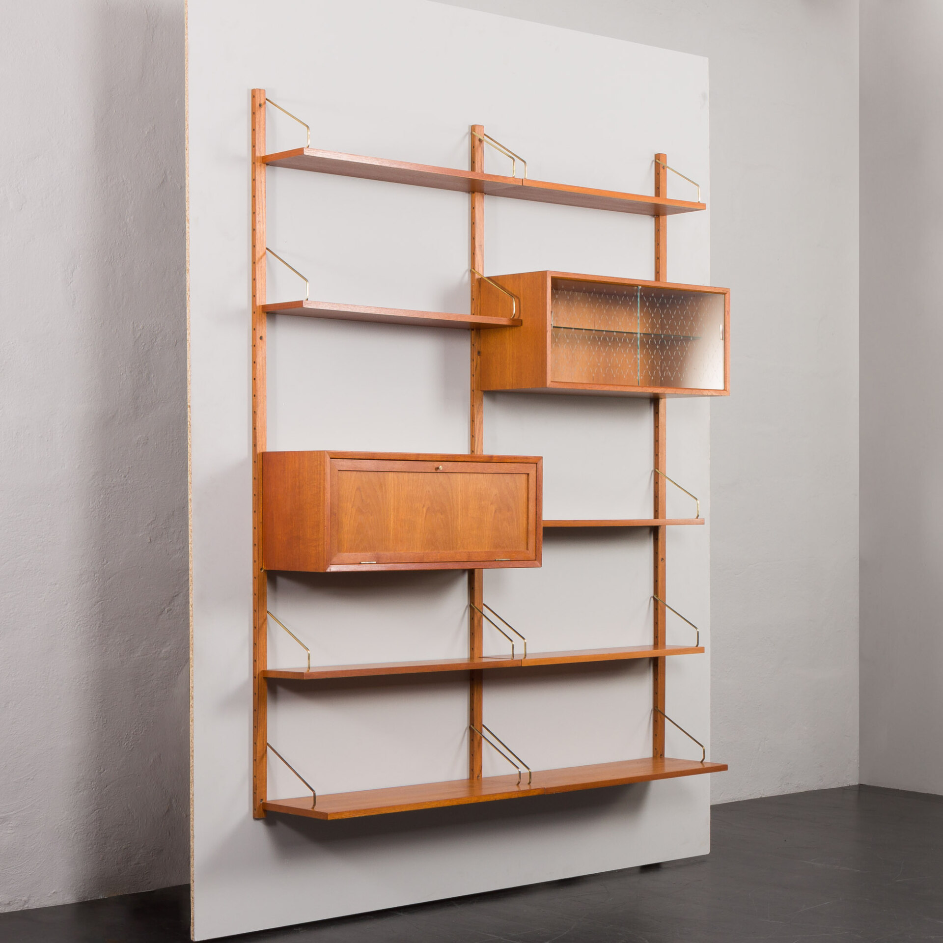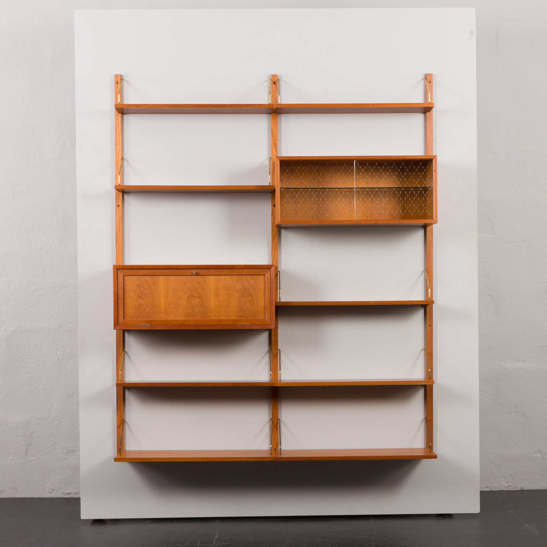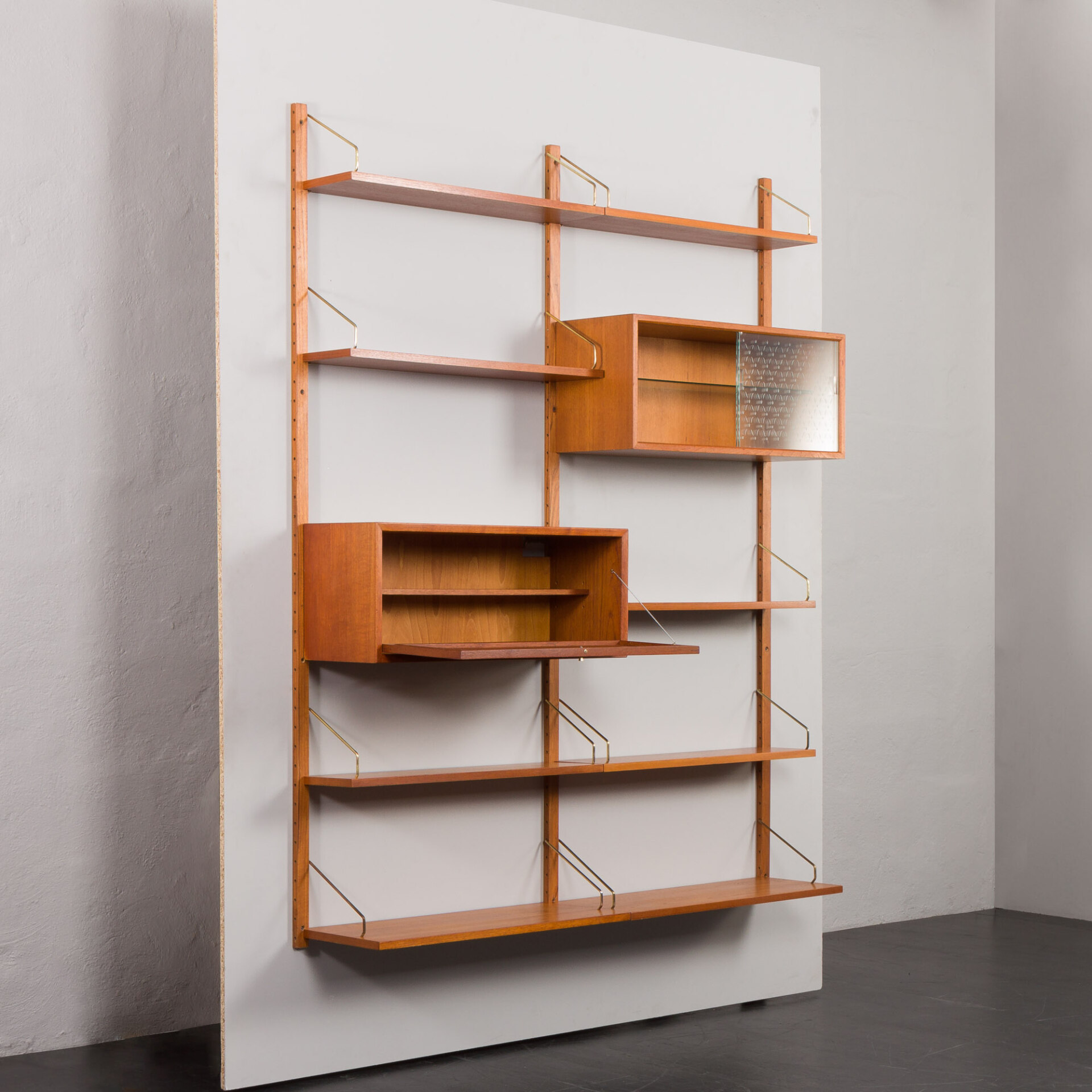 The wall unit has been checked by our team. We have made sure that doors work properly, and all parts fit together. Each element has been cleaned and treated with Danish oil. There is a minimal chip on the glass ( original Cadovius Royal pattern ) but it does not effects the overall esthetics of the unit.