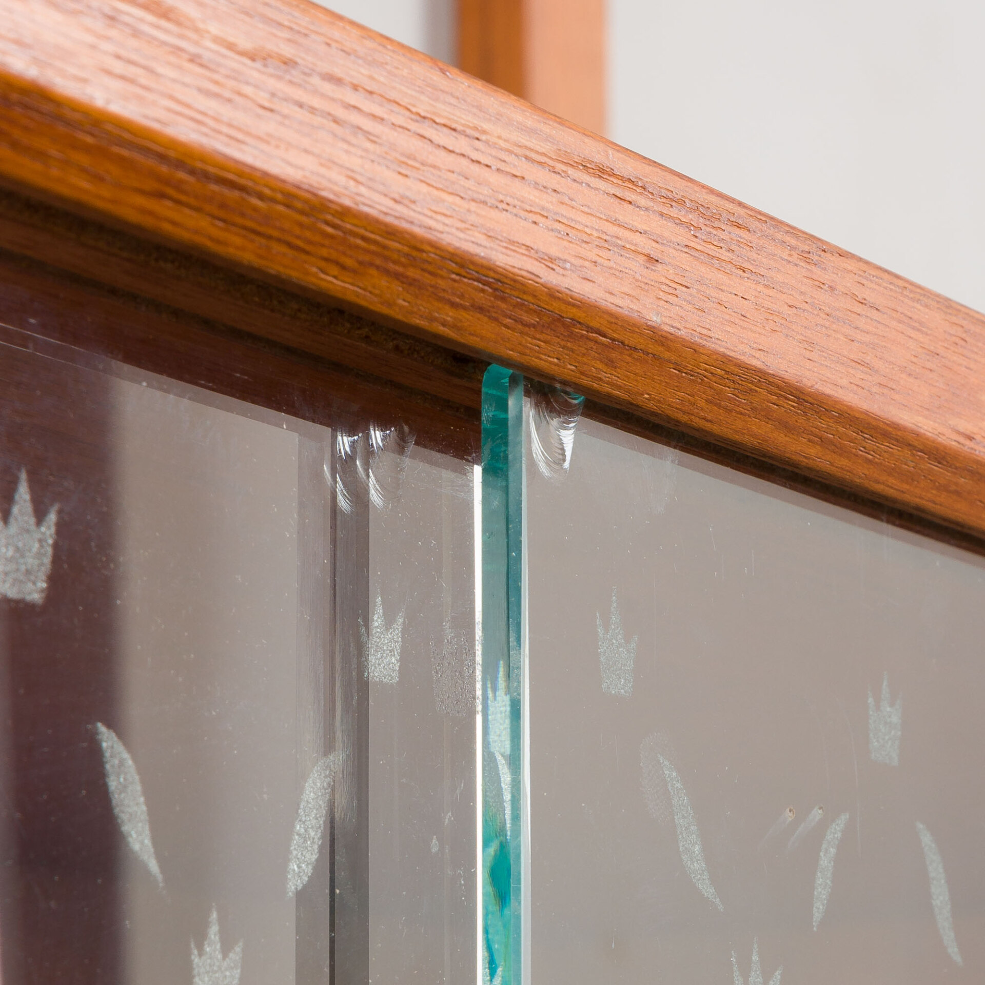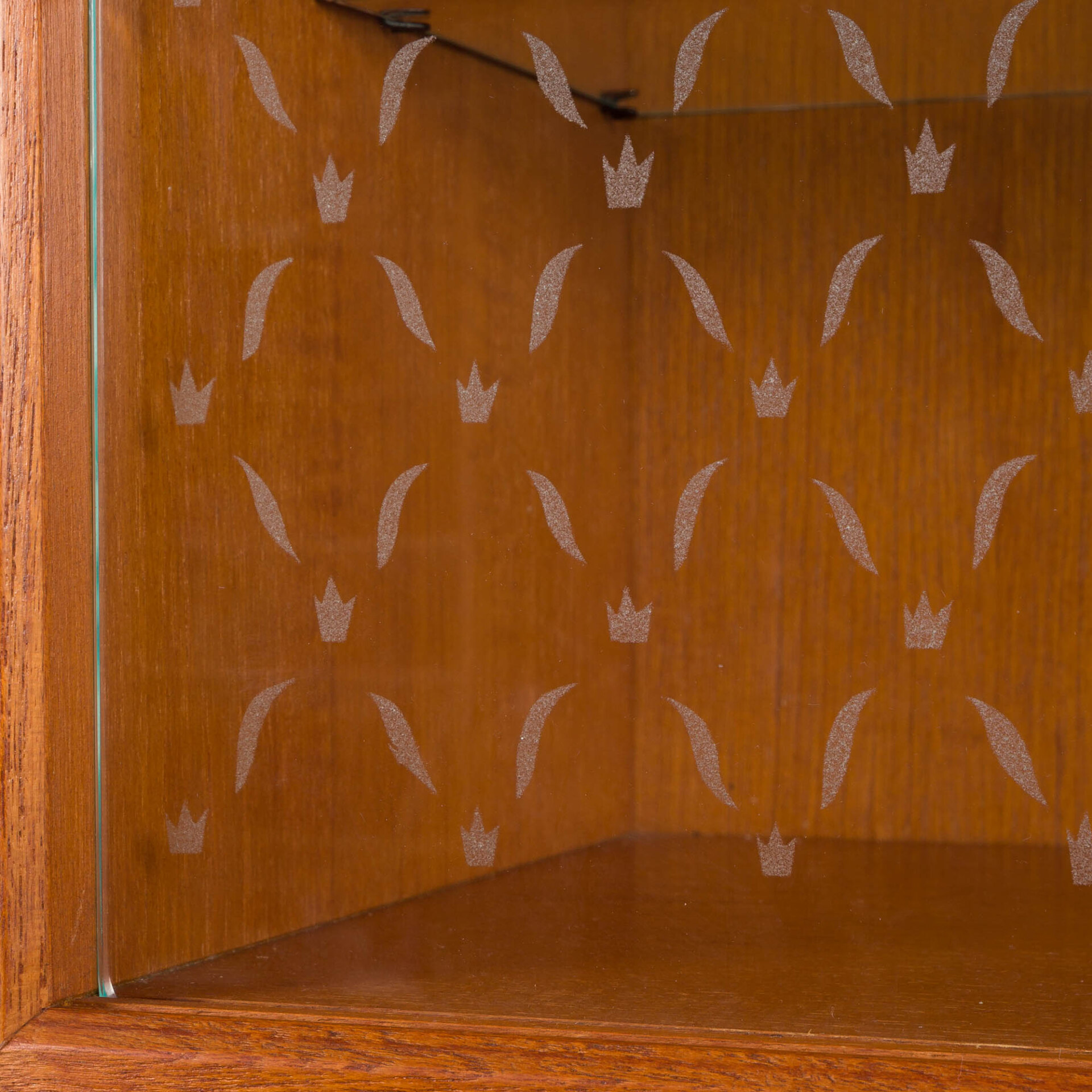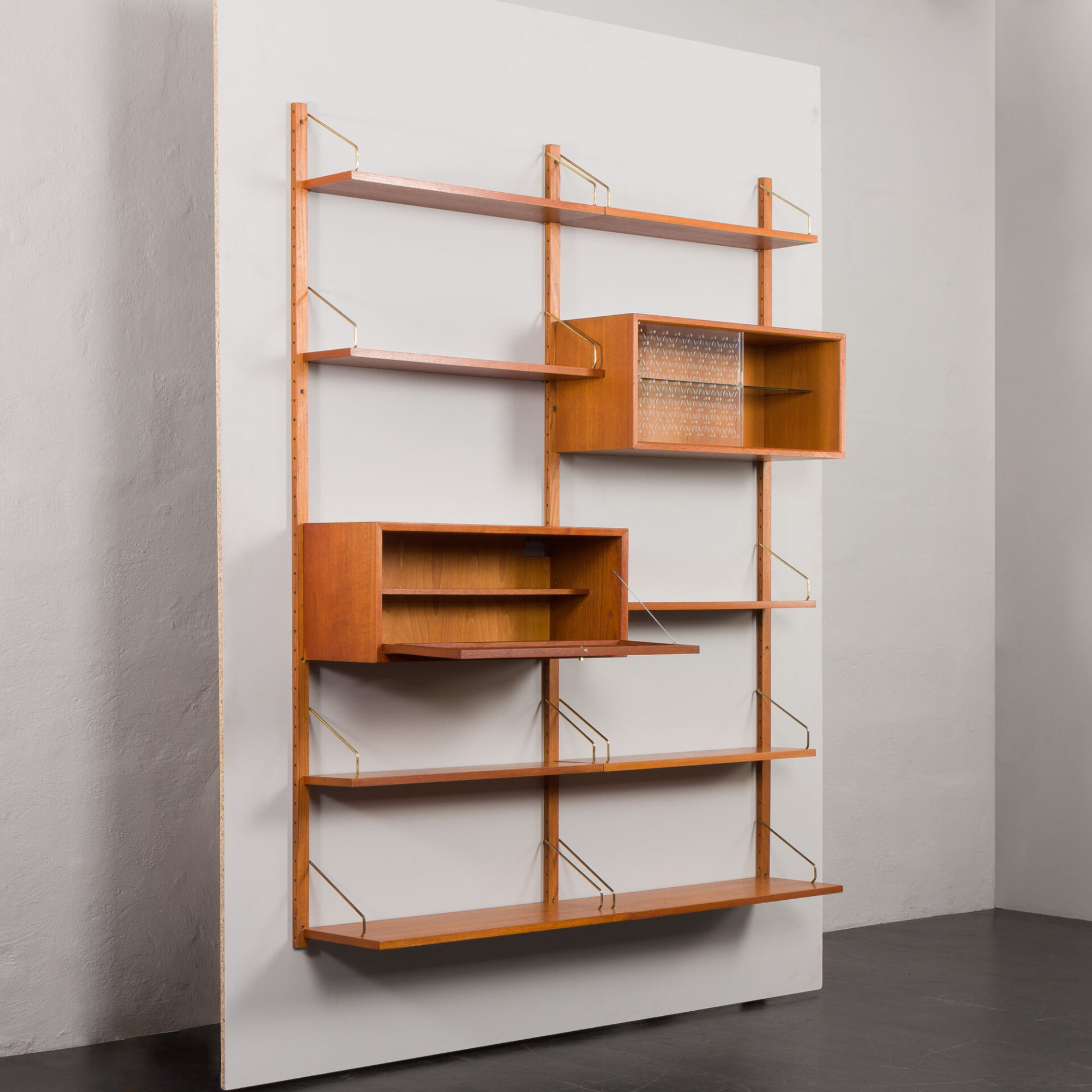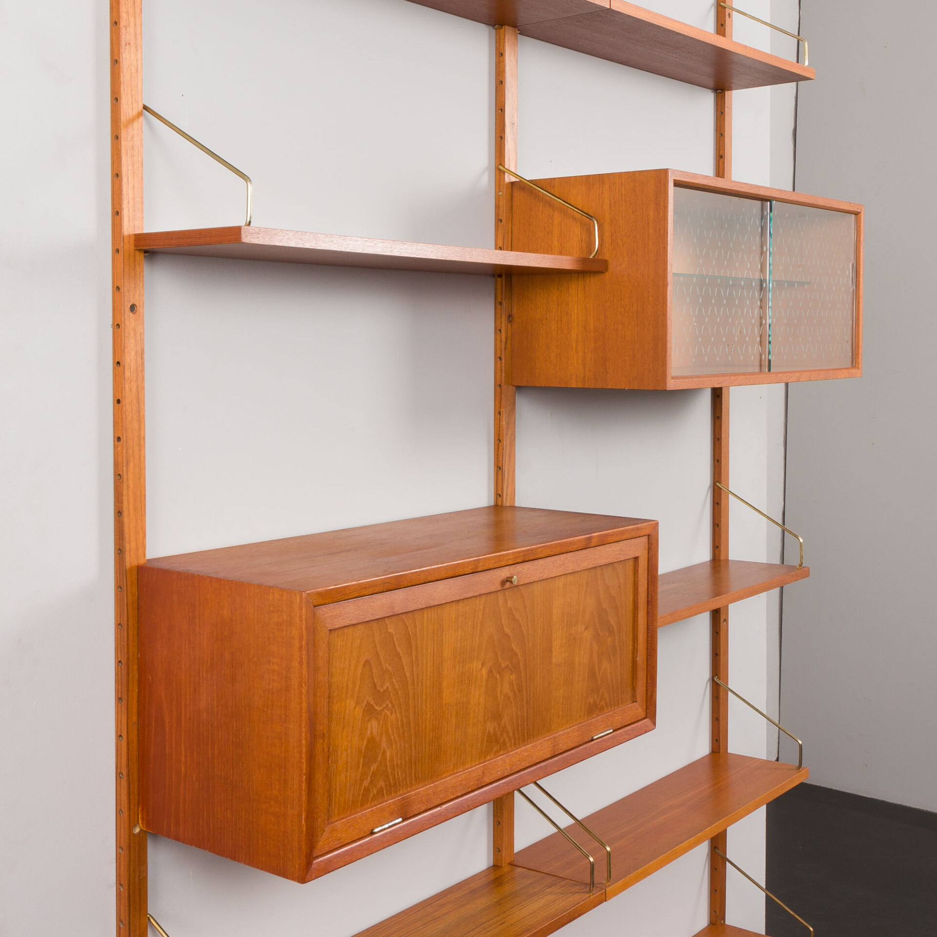 The wall unit has been checked by our team. We have made sure that doors work properly, and all parts fit together. Each element has been cleaned and treated with Danish oil. There is a minimal chip on the glass ( original Cadovius Royal pattern ) but it does not effects the overall esthetics of the unit.
