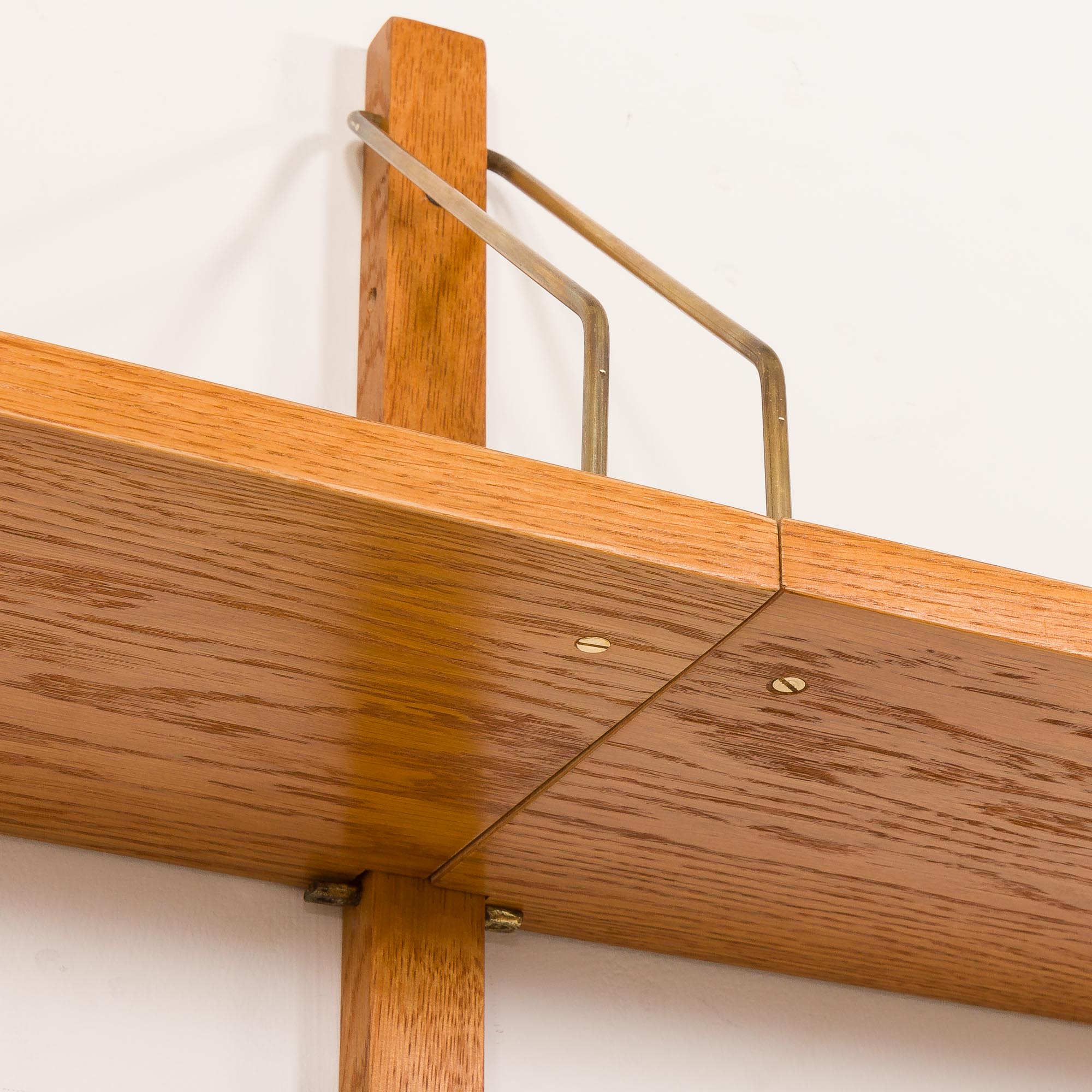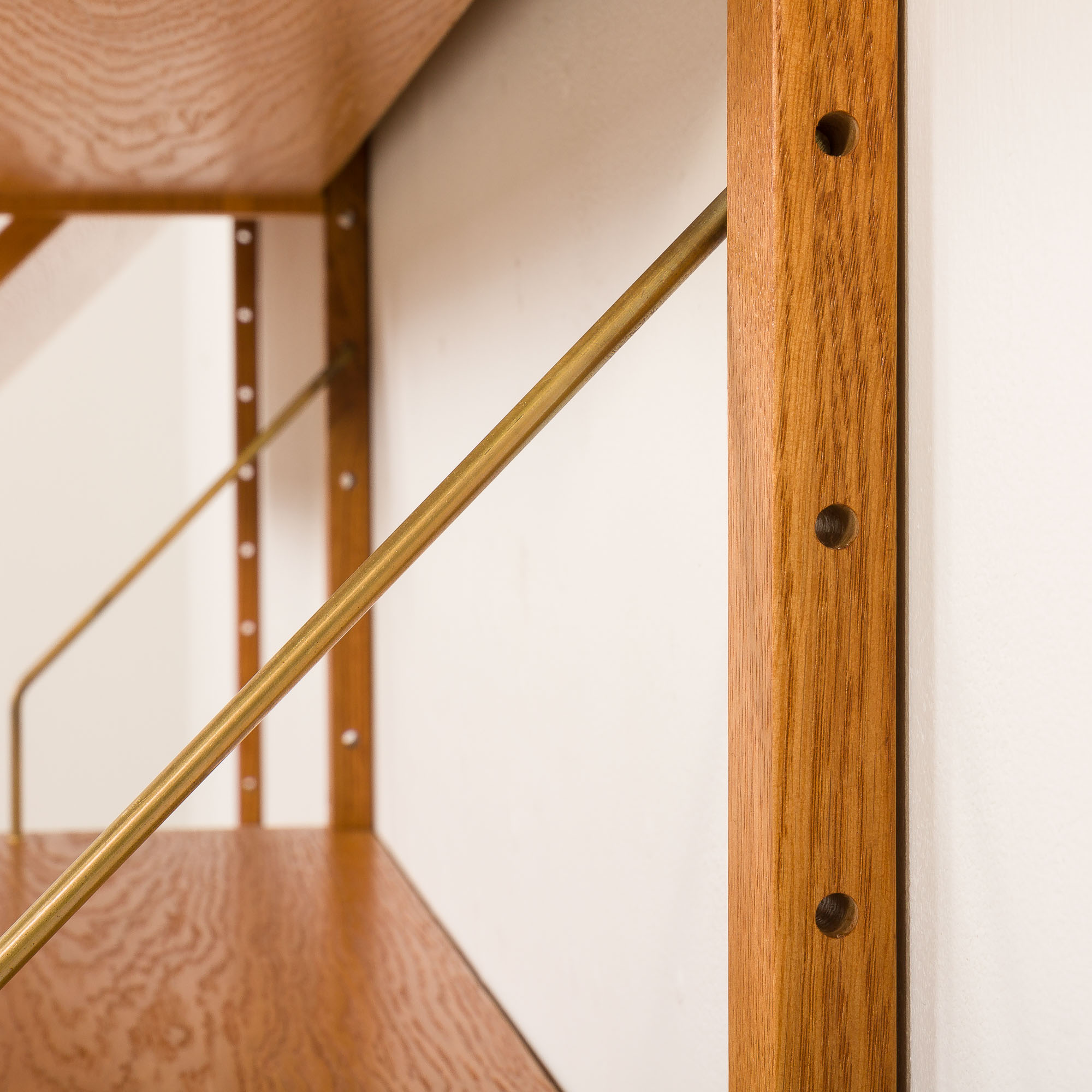 Adjustable shelves allow for the display of personal items or art, regardless of size. Its modularity allows for flexible configuration. The arrangement of the shelves and cabinets can be easily changed. The shown setup is just an example. The assembly system is simple and intuitive, with components mounted on solid wood rails using brass hangers and pins.