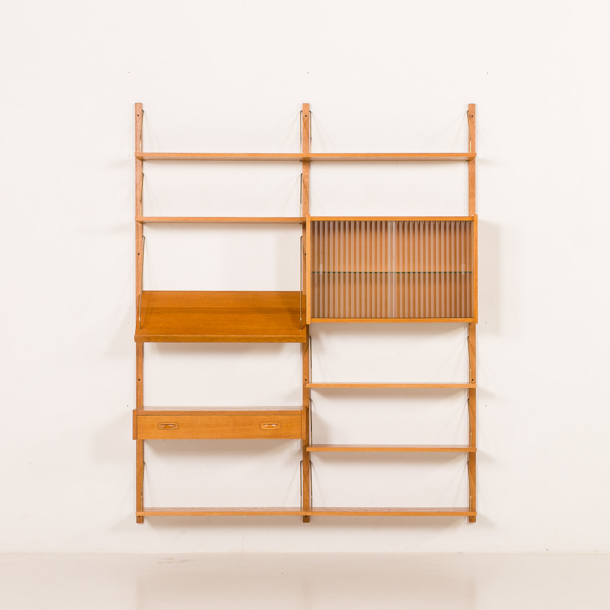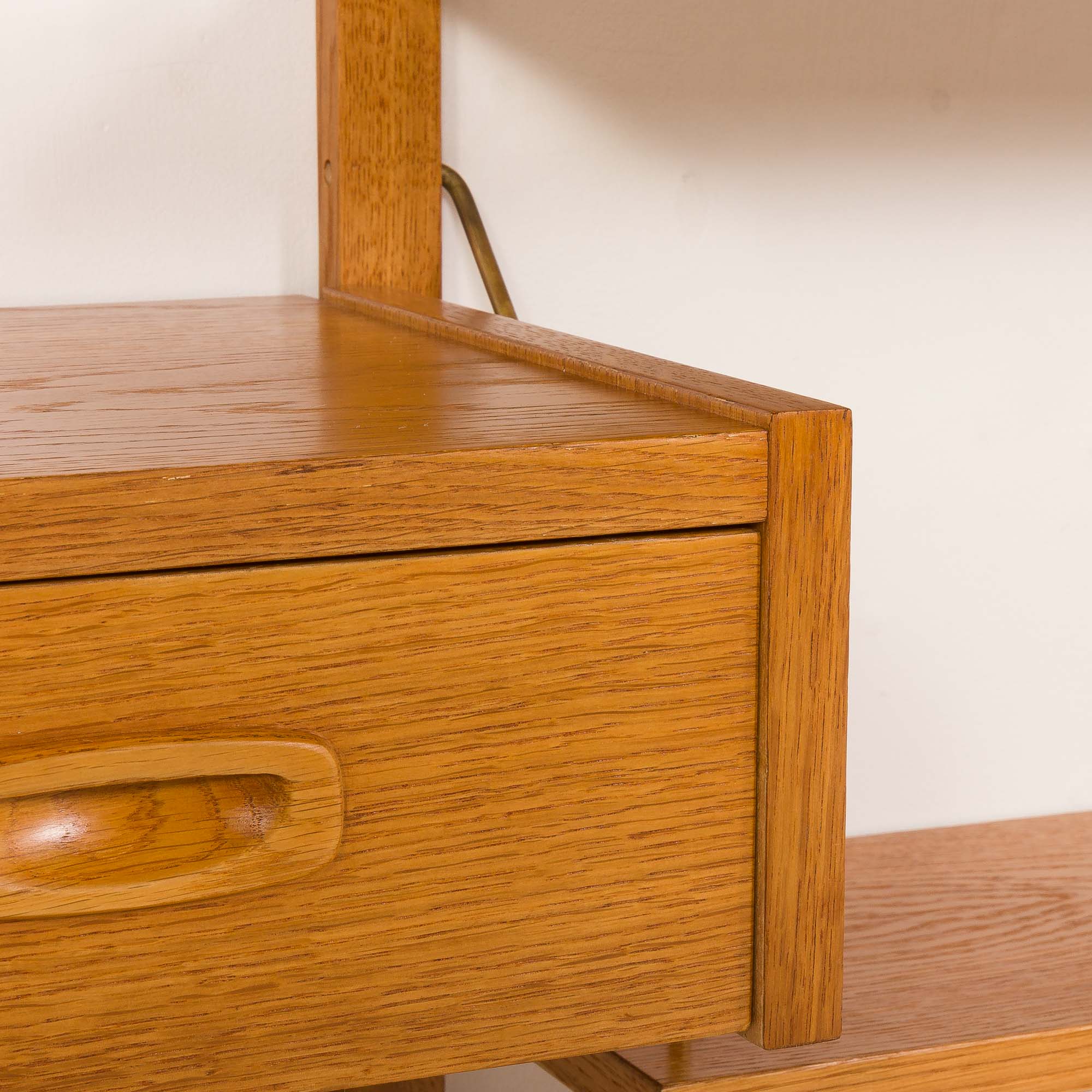 Danish mid-century oak wall unit designed by Preben Sørensen and manufactured by PS System in Randers in the 1970s. It was made in the very same period as Poul Cadovius wall units, and it presents the same Danish mid-century quality.