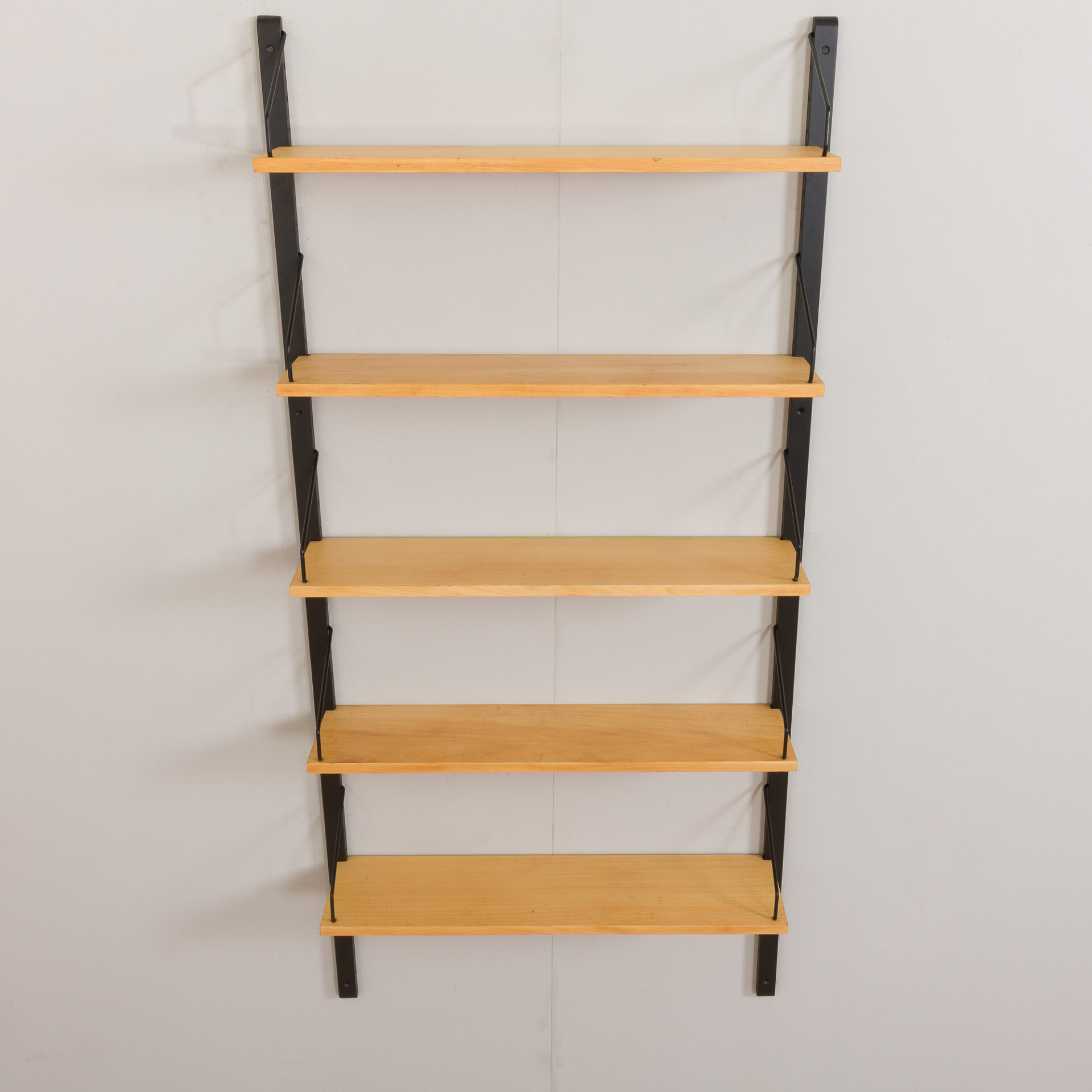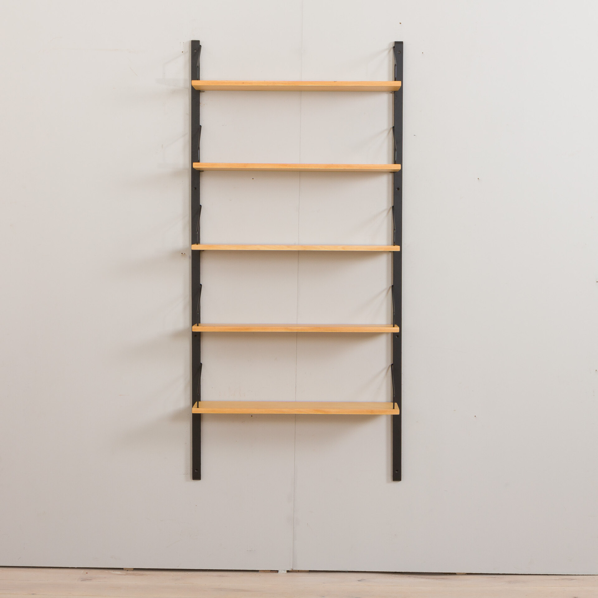 Vintage danish bookshelves hanging on solid wood black-varnished rails are a pretty composition to expose books and decorations. This set, designed in the style of Poul Cadovius, comes from the 1960s and is made of solid birch, rare in Danish design. It is a modular wall unit with adjustable hight of the shelves.