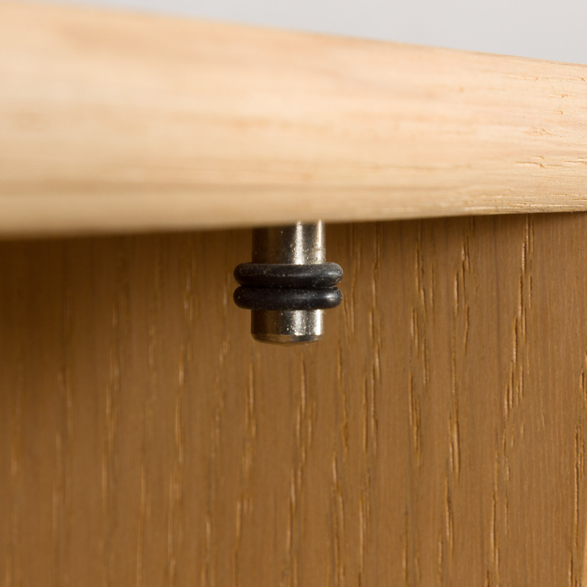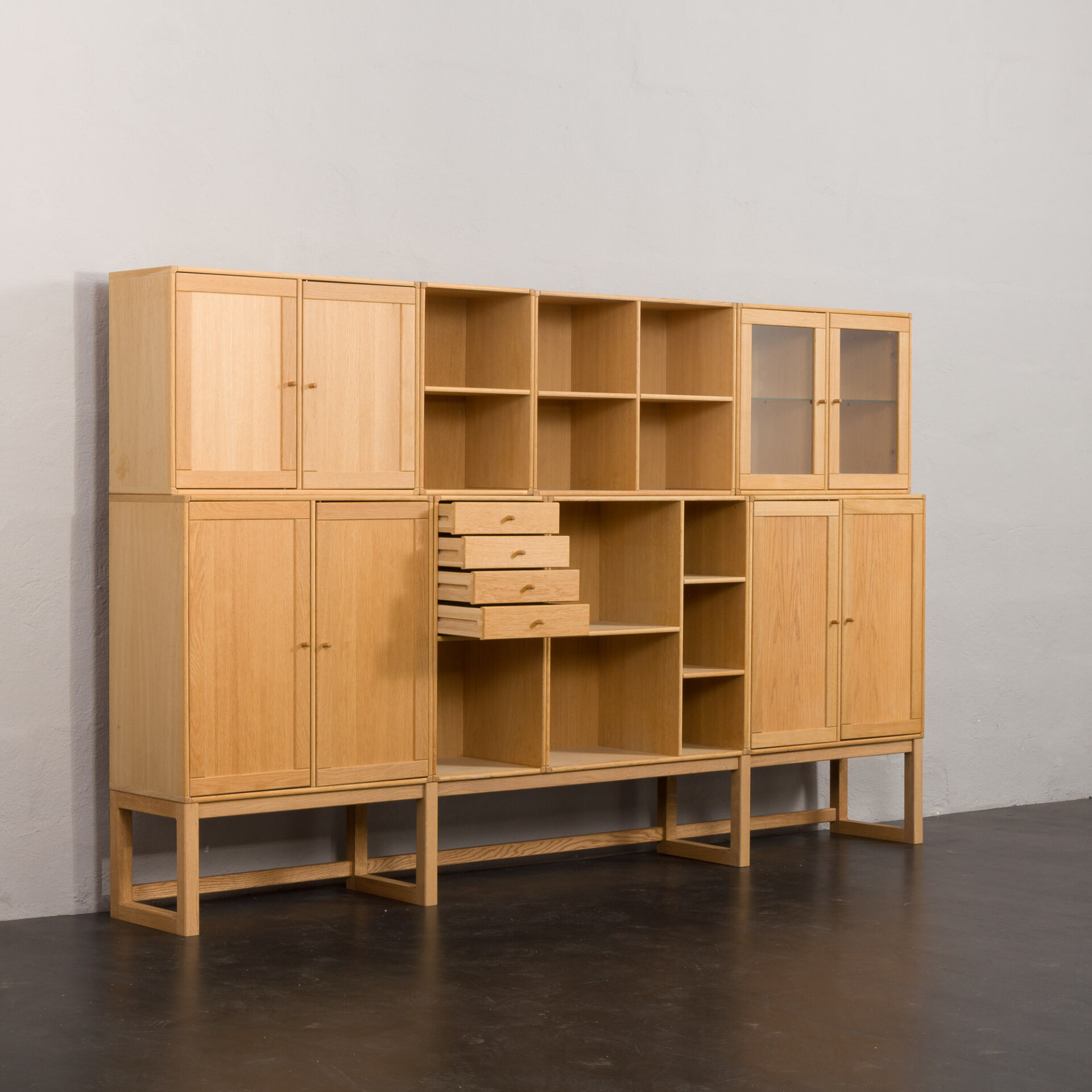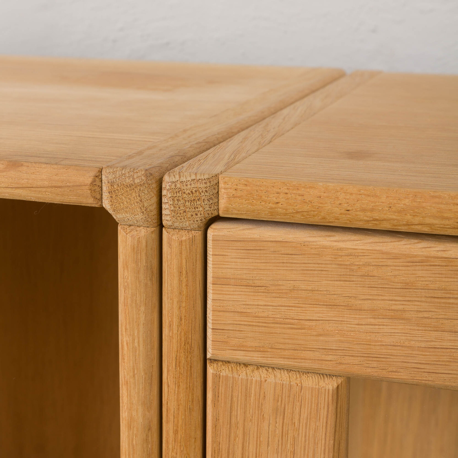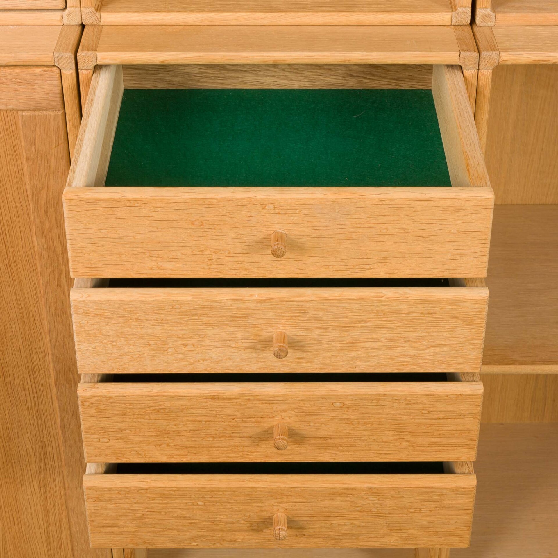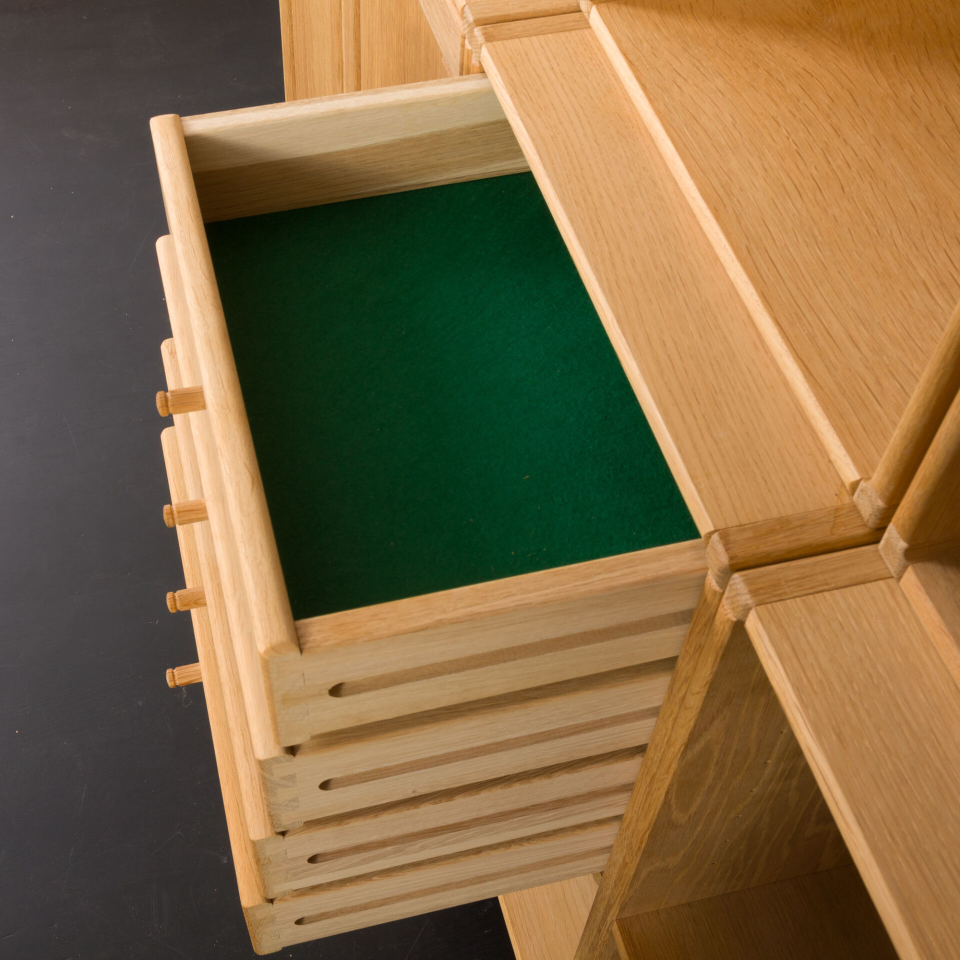 The set features eight solid oak wood modules (6 x bigger, 2 x smaller), including one with drawers and one display cabinet. The unit is modular, and one can interchange parts and arrange them as required, vertically and horizontally divided into smaller groups in a few rooms. The base unscrews easily, and the unit can also be used without it. It is all up to you!