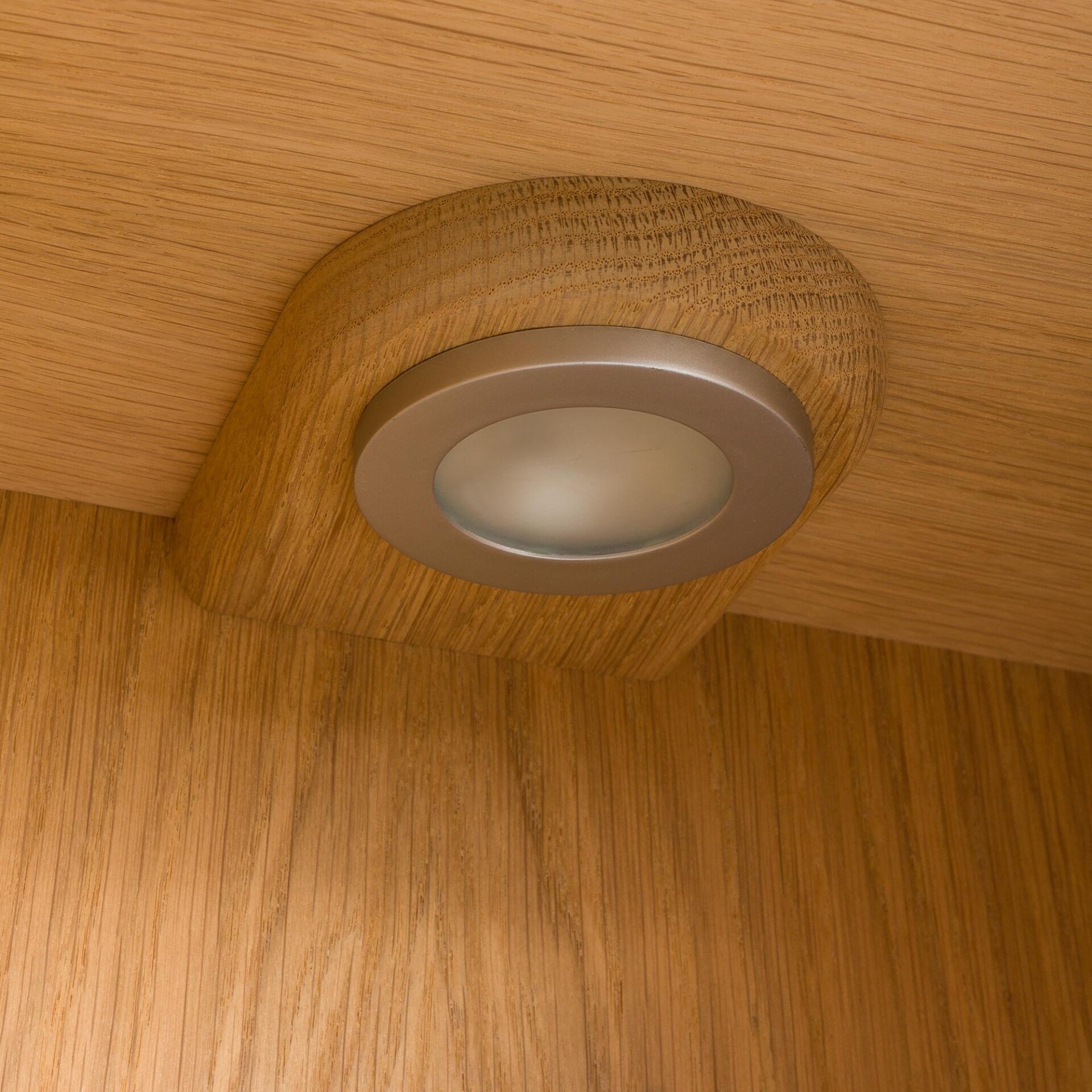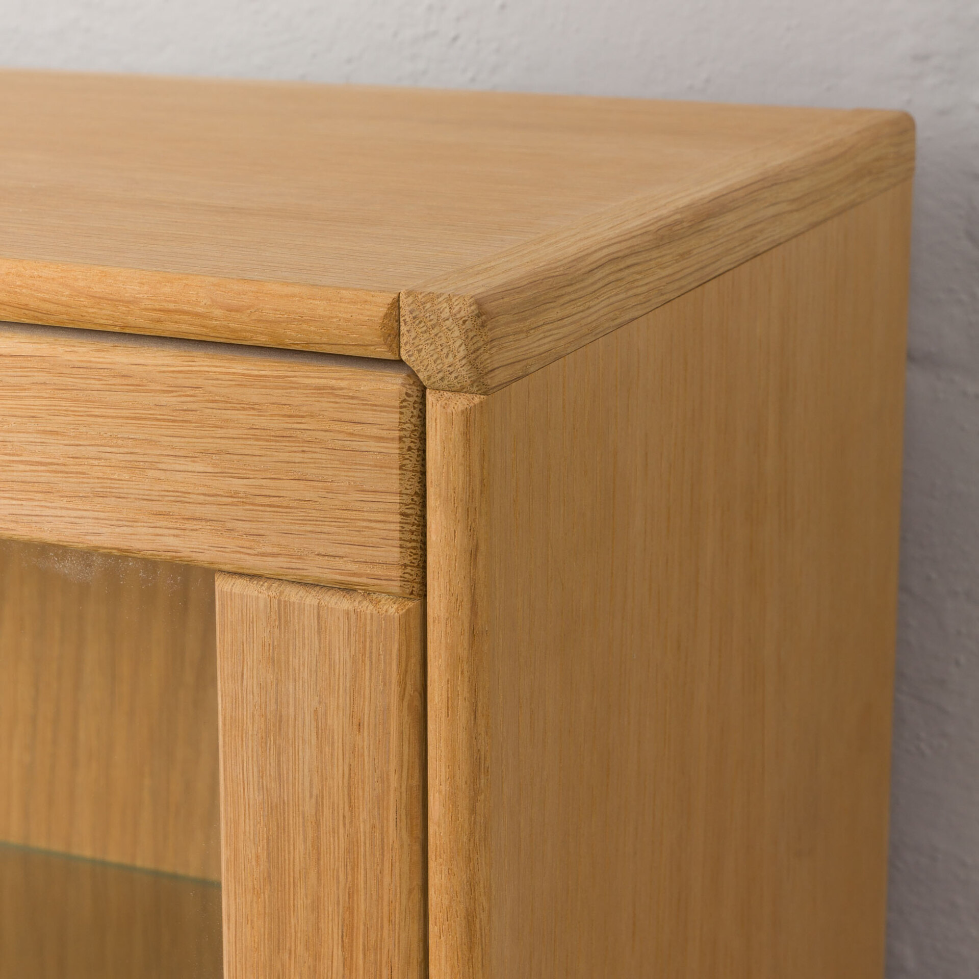 The unit has been created from several different parts. We call it upcycle. We use contemporary and mid-century parts to create a unique, stylish look and a functional furniture piece. Here, additionally, we made the base. The cubes are made in solid light oak, the same as the base. The glass cabinet is equipped with two spotlights.