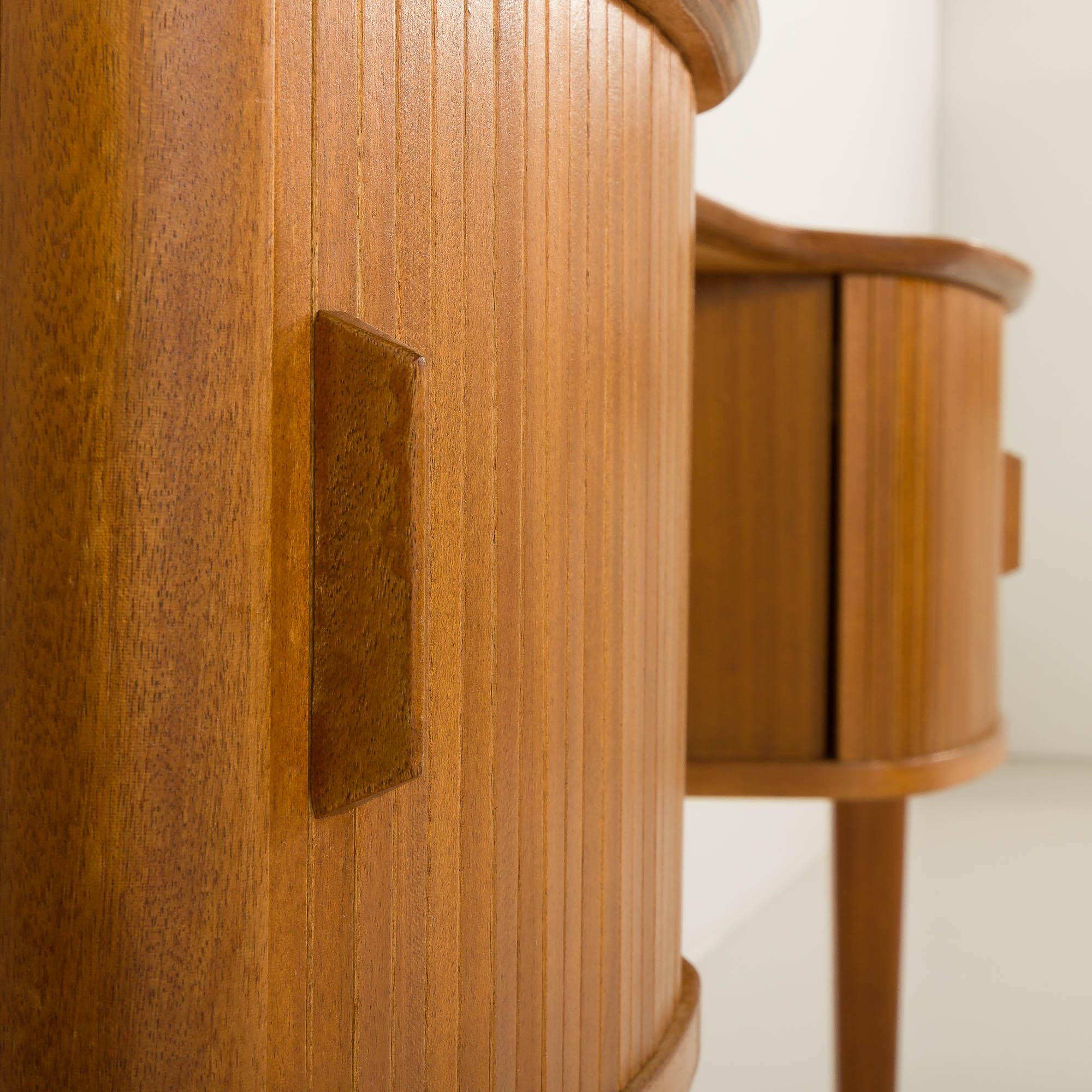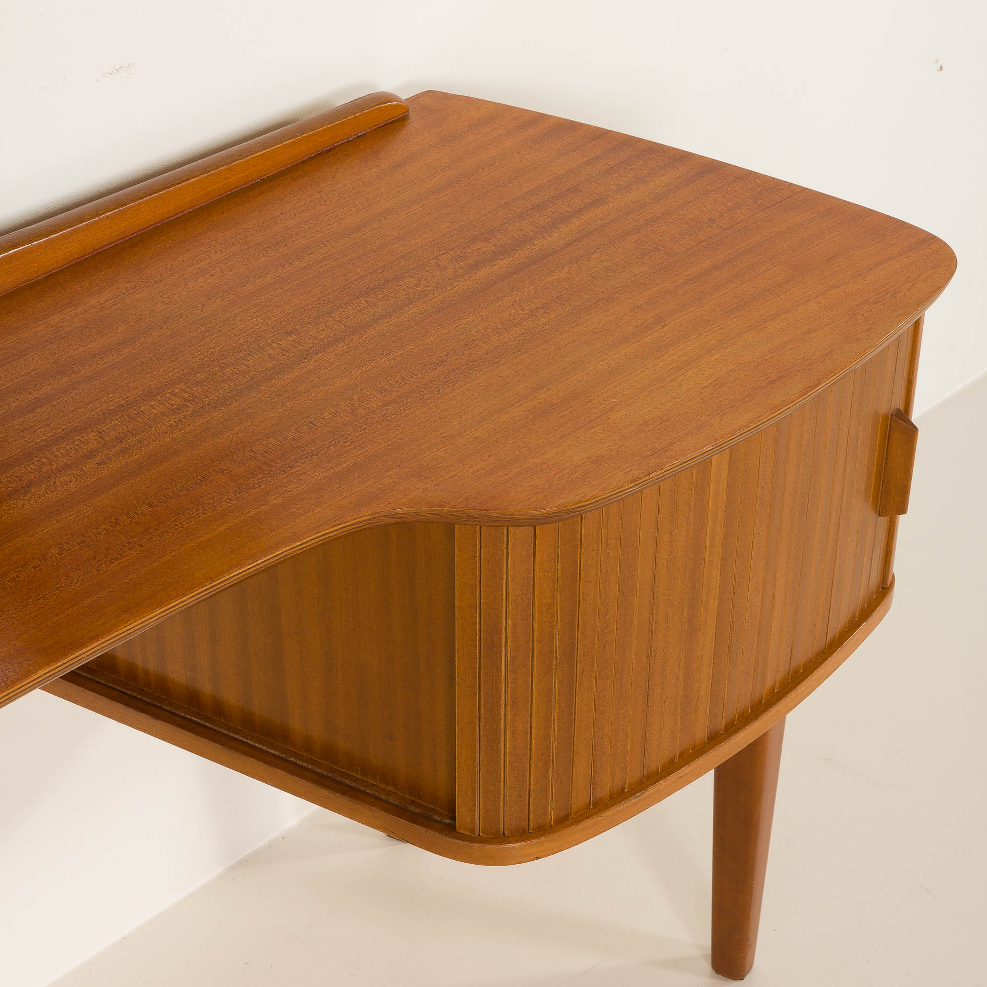Dieser seltene Vintage-Schminktisch wurde vollständig restauriert und befindet sich in einem fantastischen Zustand. Der Rollladenmechanismus und die Scharniere des Spiegels funktionieren reibungslos. Das Holz wurde gereinigt und mit professionellen Mitteln geschützt, und der Spiegel ist unversehrt.