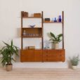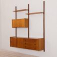 Great quality teak wall unit from the 60s, most likely made in Norway. It features lonng sideboard on the bottom ( the two bottom cabinets are inseparable ) elegant bar cabinet and two shelves 20cm D. Long reails-199cm ,allow various set ups. It is possible to fit latge TV screen or decorations on the sideboard. Great original condition with minor signs of wear. Key to the bar included.