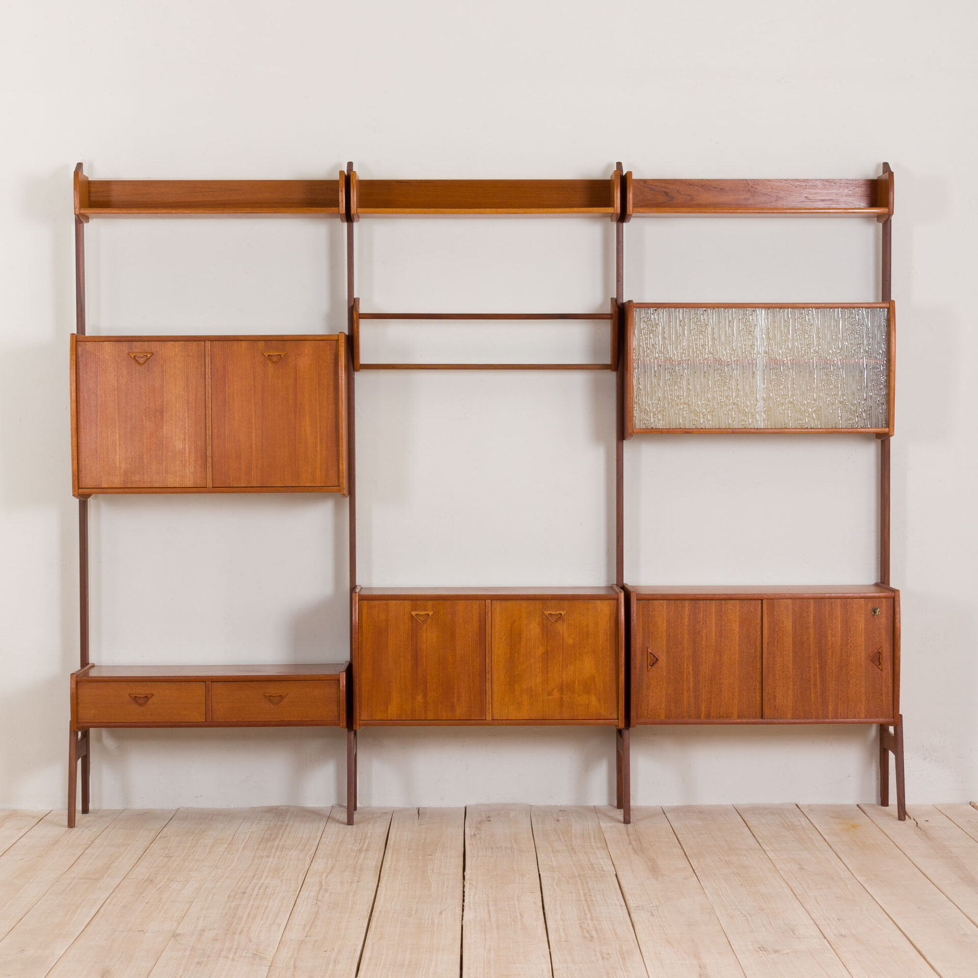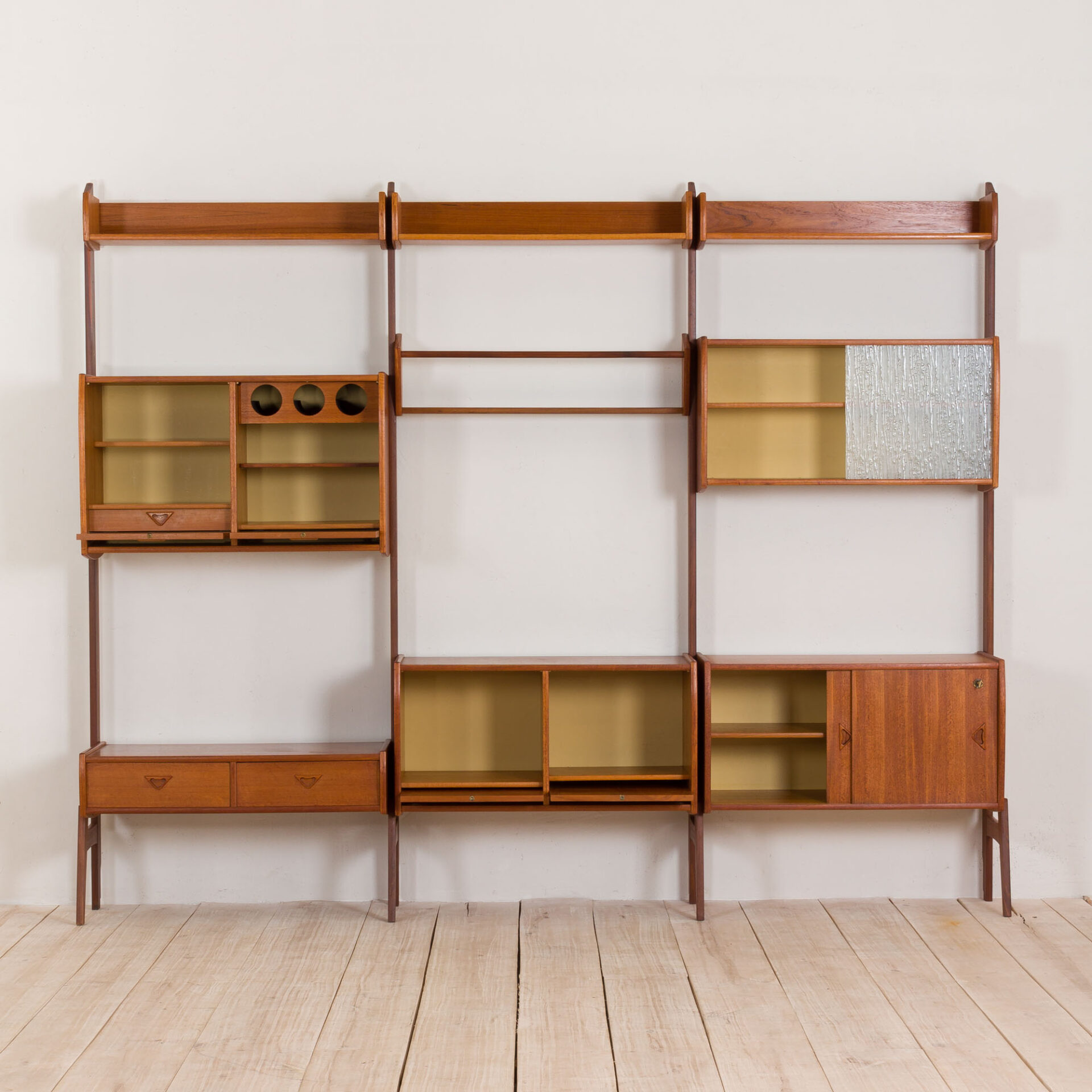 Superior quality Scandinavian modern, self-standing, 3-bay modular teak shelving system “Ergo” designed by John Texmon and Einar Blindheim for Blindheim Møbelfabrikk made in Norway in 1960s. Bar cabinet with special place for bottles. This shelving system includes: