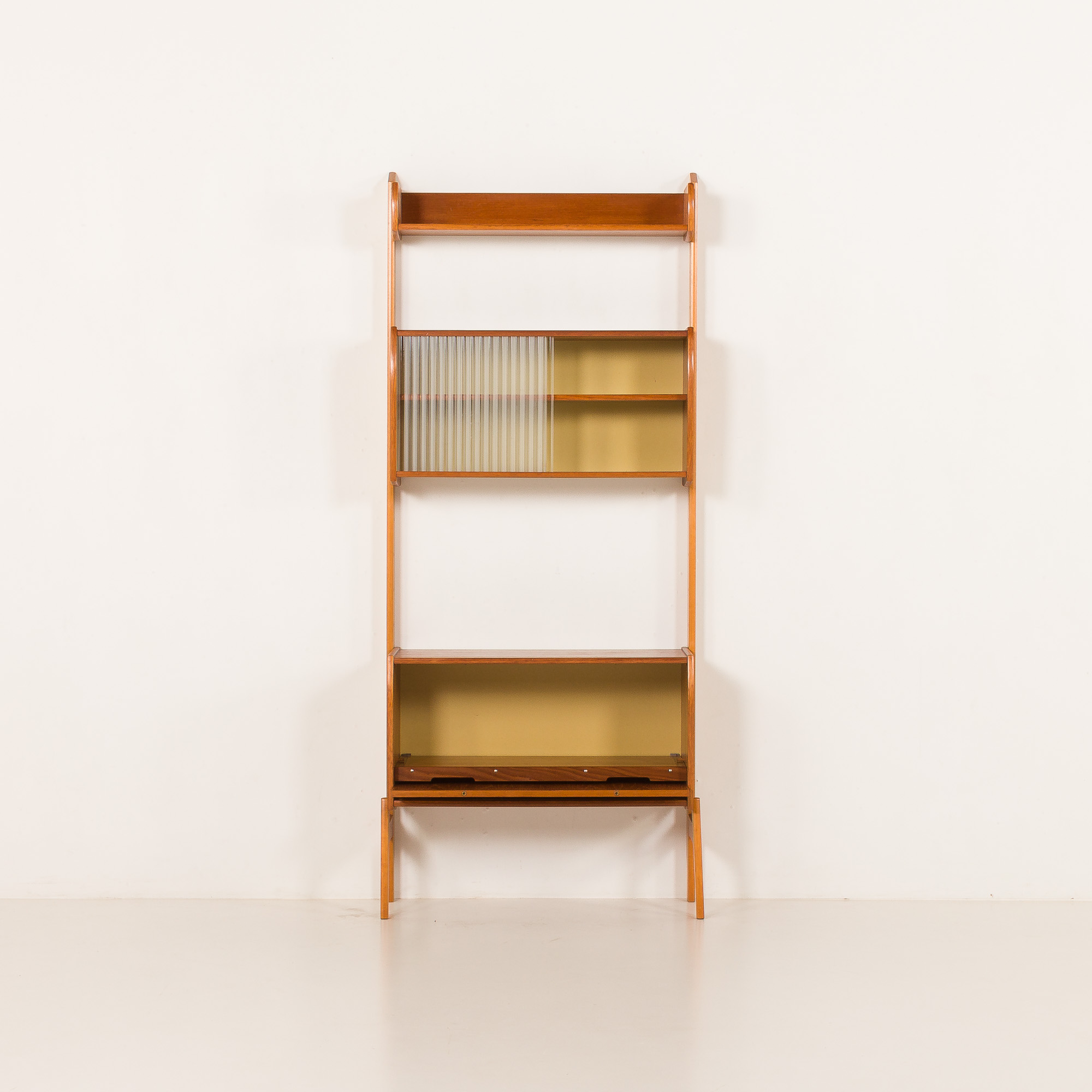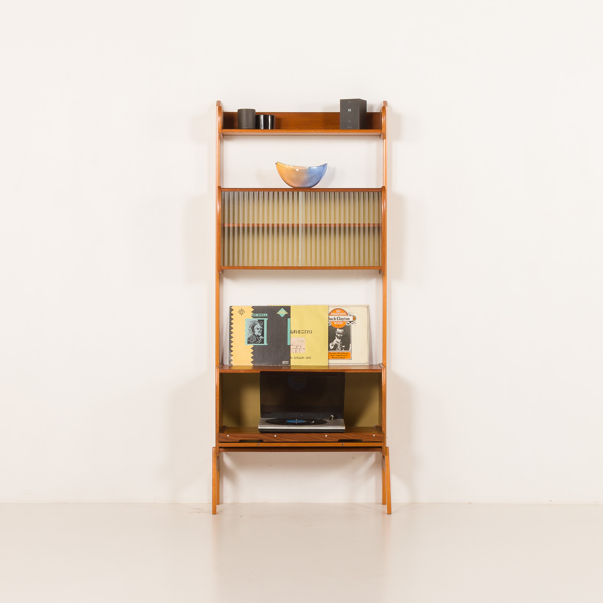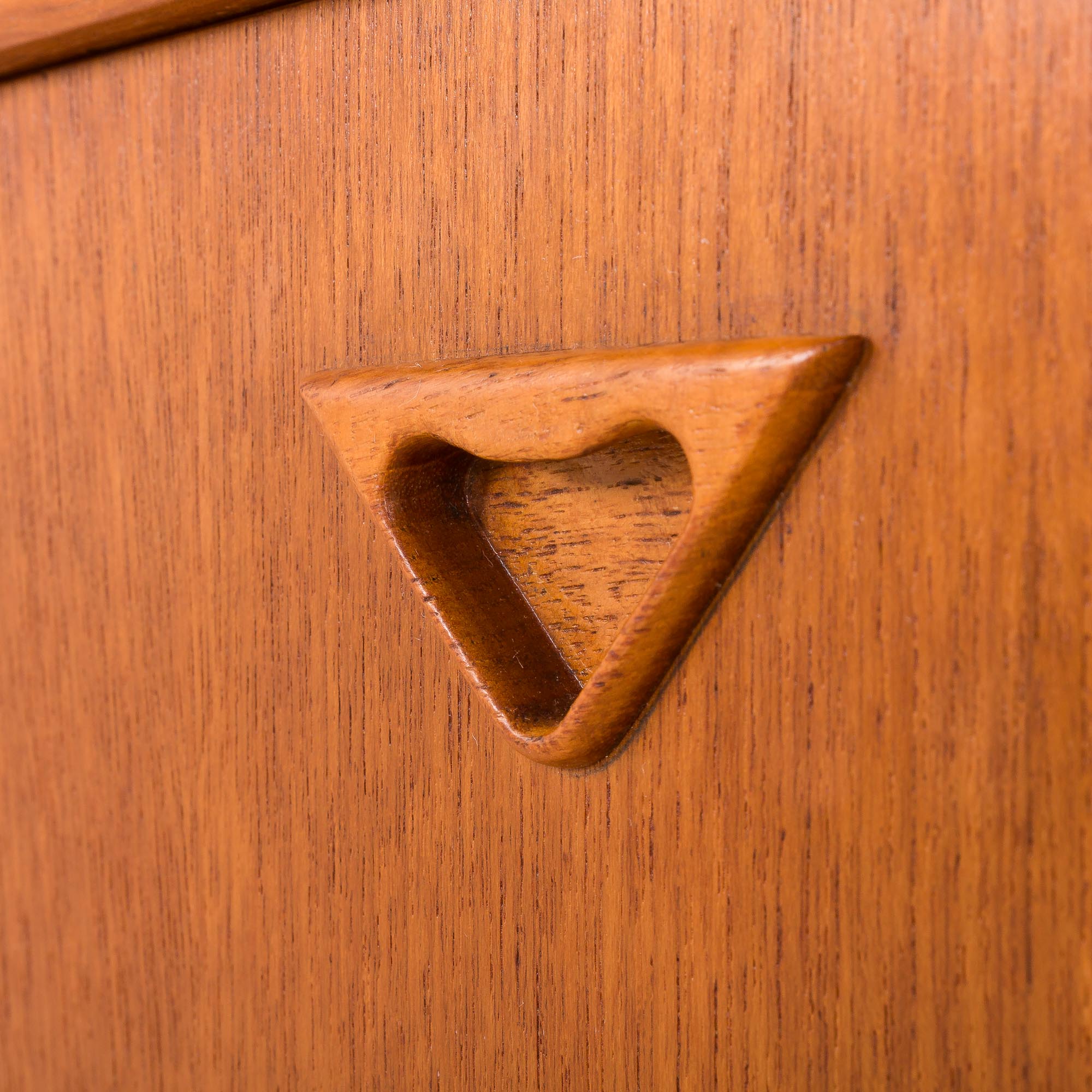 This set features a drop-down-door chest with triangle-shaped solid teak handles that is perfect to hide some audio by its extendable inner shelf. This combination of rare, useful chest with display cabinet and shelf with sides and back offers a versatile mix of display and storage options, ideal for a living room or bedroom where aesthetics and organization are crucial.