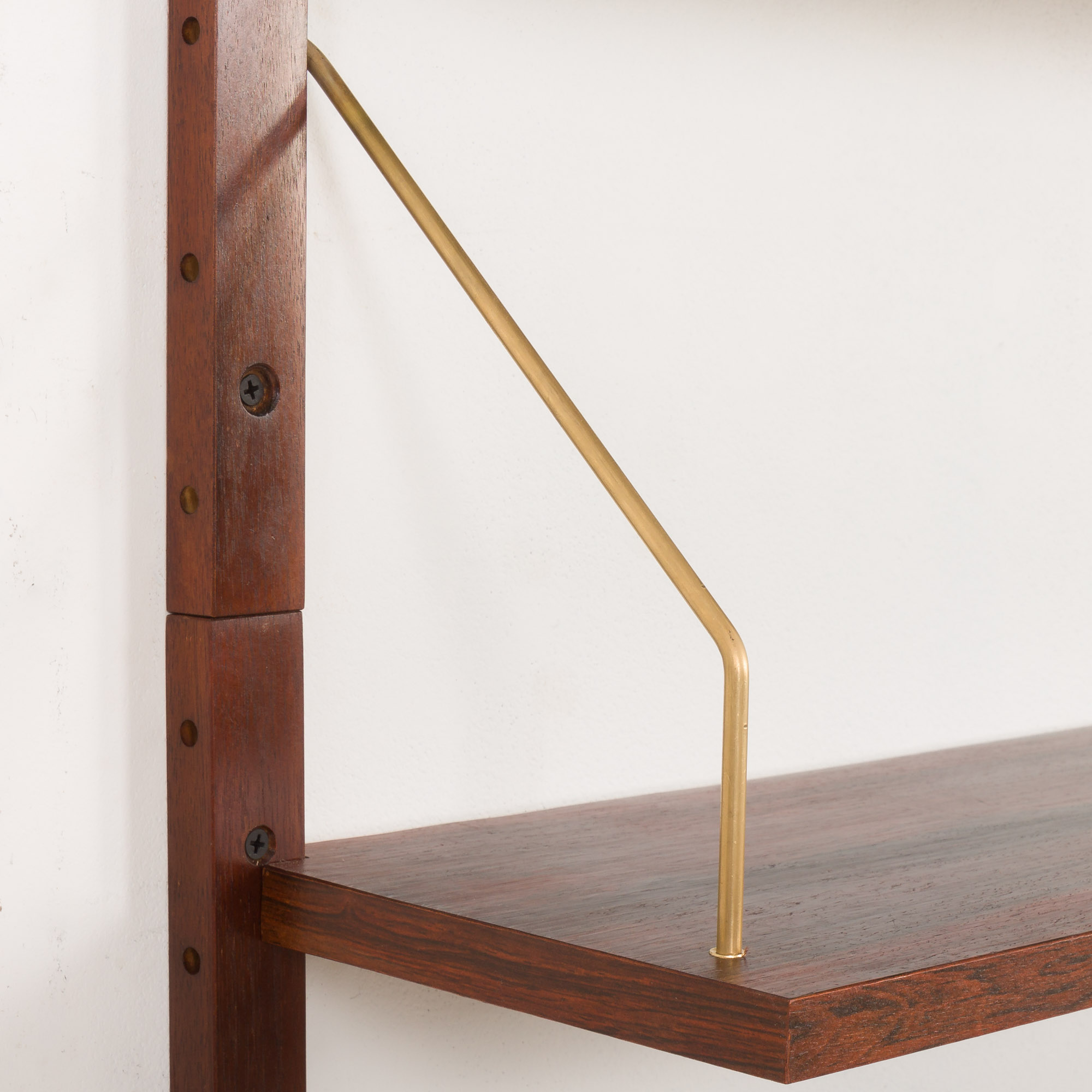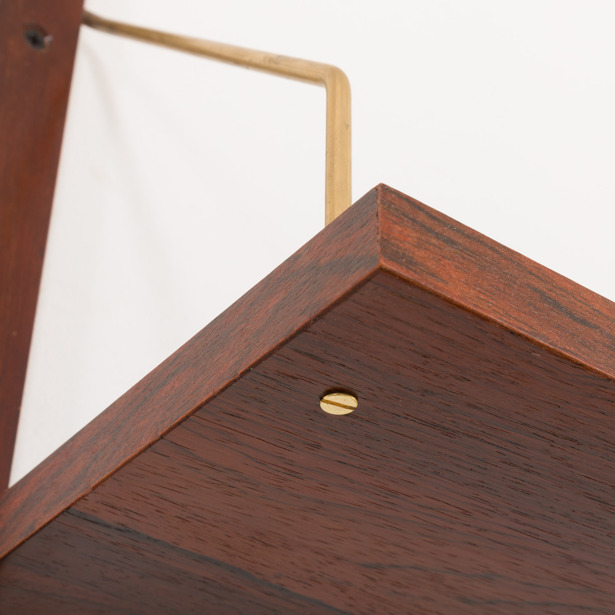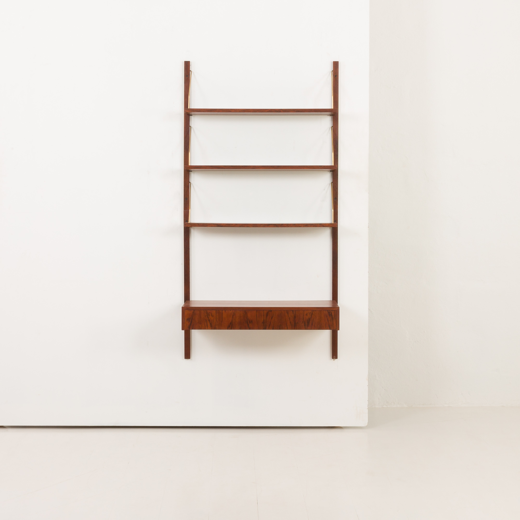 A minimalist shelving system inspired by the iconic 1960s designs of Preben Sorensen and Poul Cadovius. Thanks to its size and wall attachment, it takes up minimal space. It is made from rich rosewood and rosewood veneer, the material highly valued for its rarity, rich, deep color and distinctive grain pattern. The addition of a compact desk with a drawer allows you to create a discreet and functional home office space.