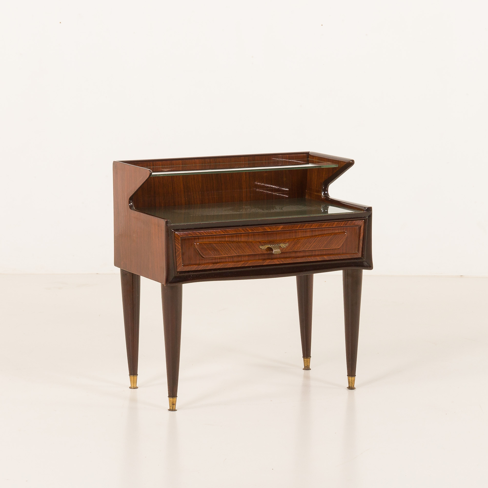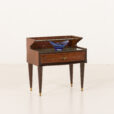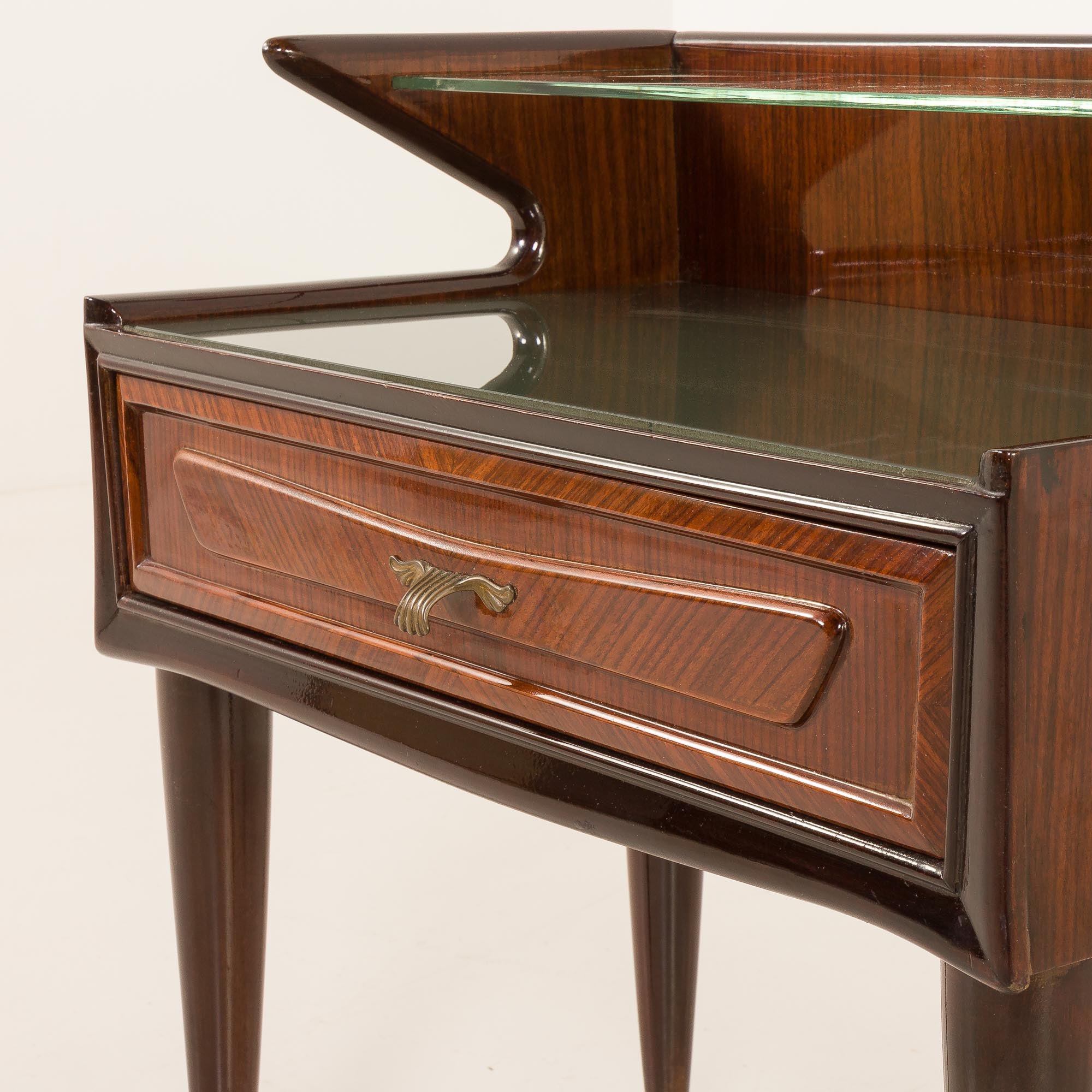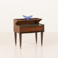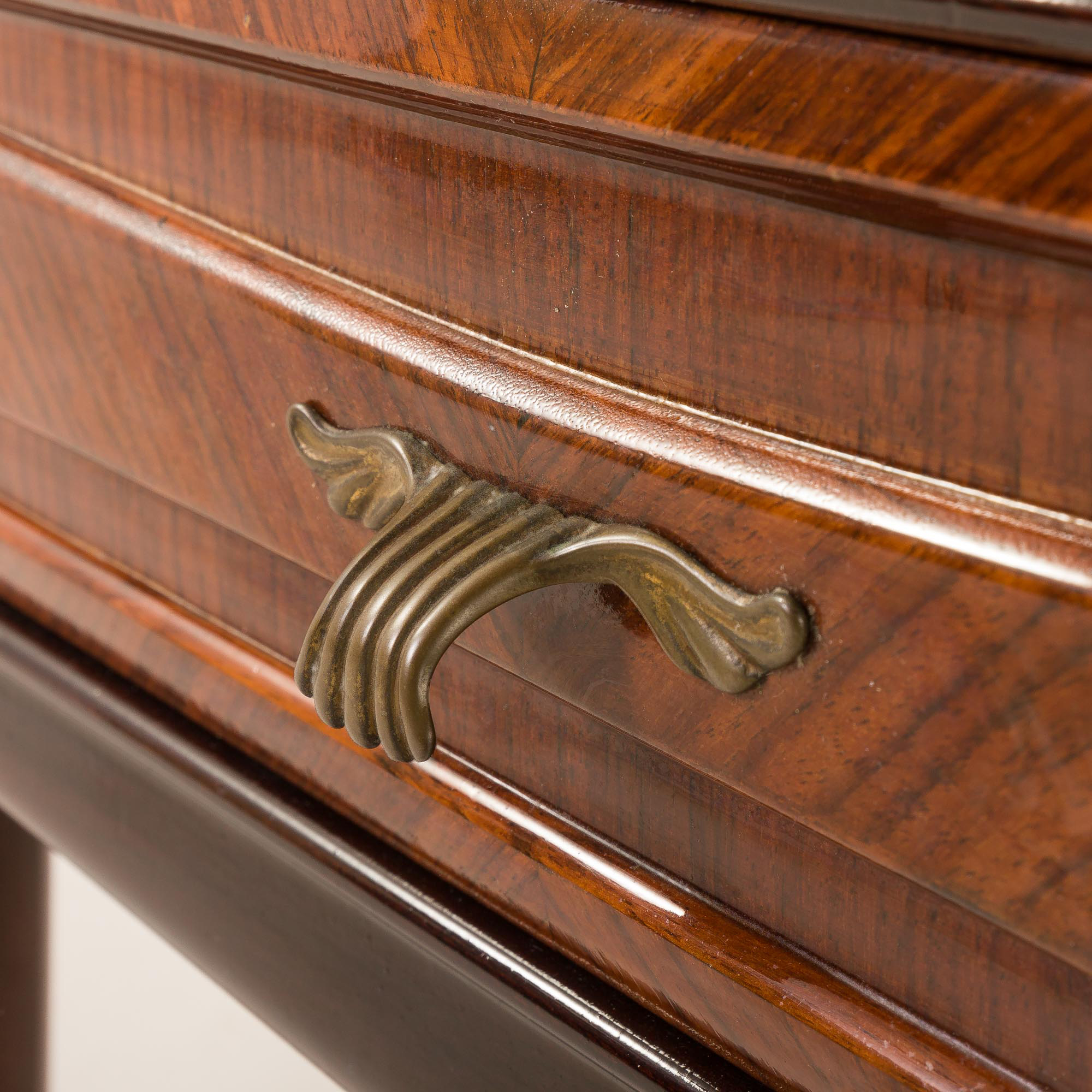 This side table is renowned for its exquisite shape, vintage brass ornamentation, and opulent inlays. Carved in walnut with walnut veneer and gently rounded side panels, it creates a beautiful frame for the drawer. The rich grain of the wood, especially evident in the square-laid veneer on the drawer front, shows the designer’s love for high-quality materials and craftsmanship.