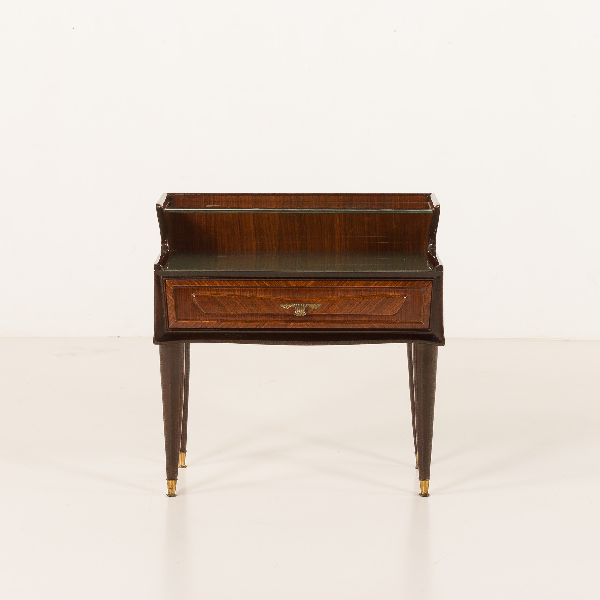 The Italian mid-century side table, very reminiscent of Paolo Buffa projects from the same period, was manufactured some time in the 1950s. Buffa was known for creating designs that blend Neoclassical style with Art Deco motifs and modernist principles, which is clearly evident in this piece.