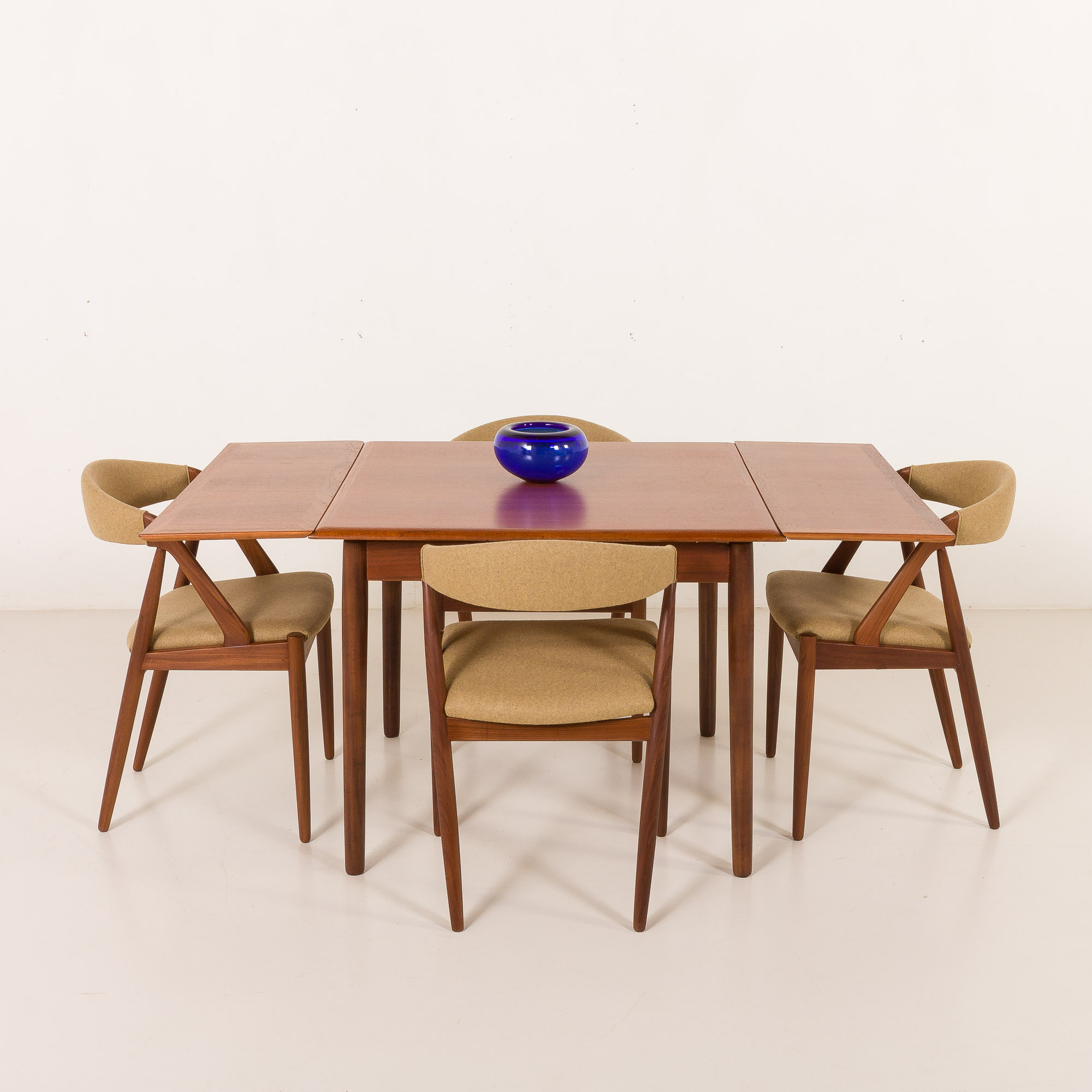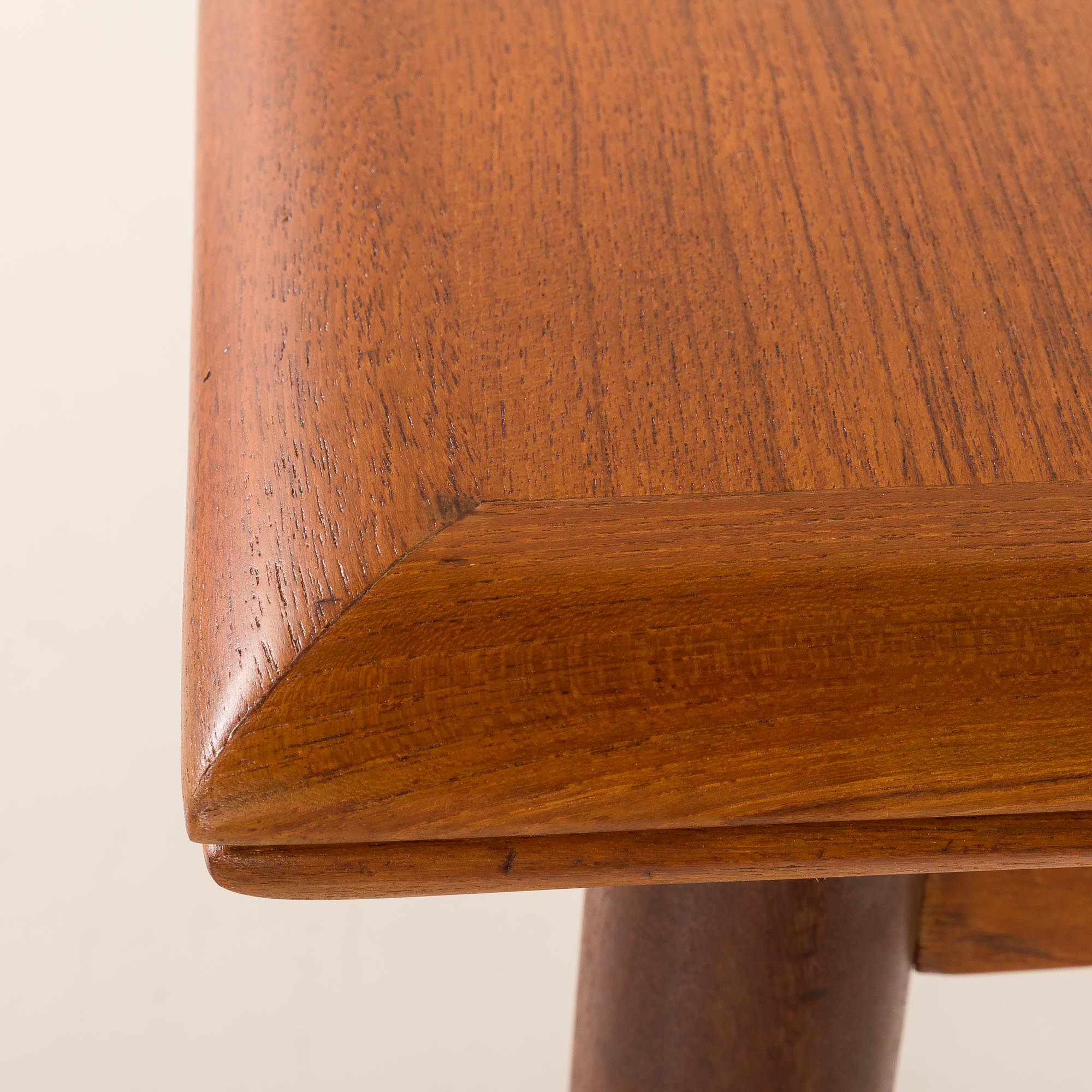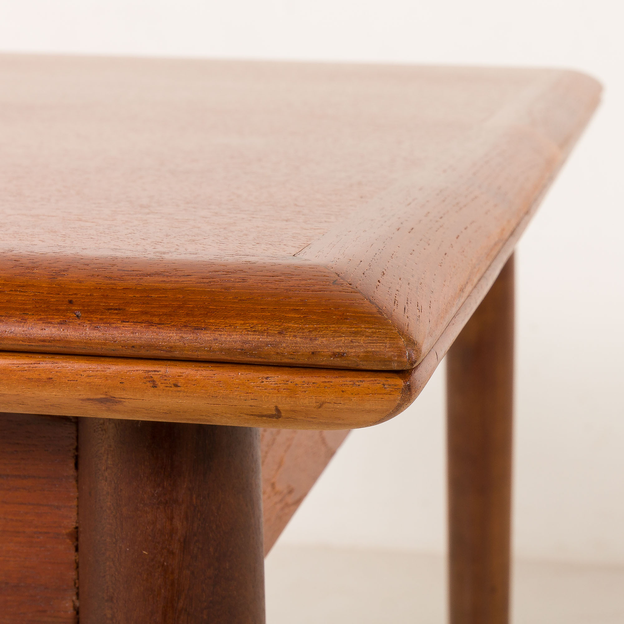 The table is crafted in teak wood, with a beautiful rich grain and a warm tone. A distinctive feature is the thick, softly rounded solid teak edge that runs around all tabletops. An especially rare detail is the overlapping of the tabletops. This solution demonstrates the cleverness of Danish carpenters of the period.