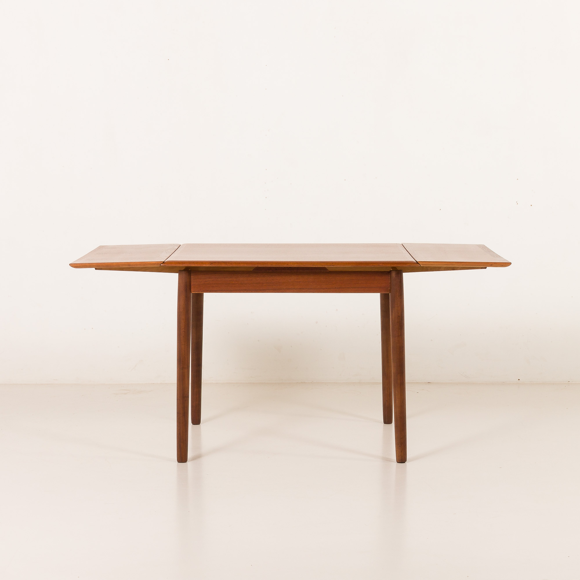 This small Danish square teak dining table from the 1960s is a beautifully crafted example of Scandinavian mid-century design, where functionality meets refined craftsmanship.