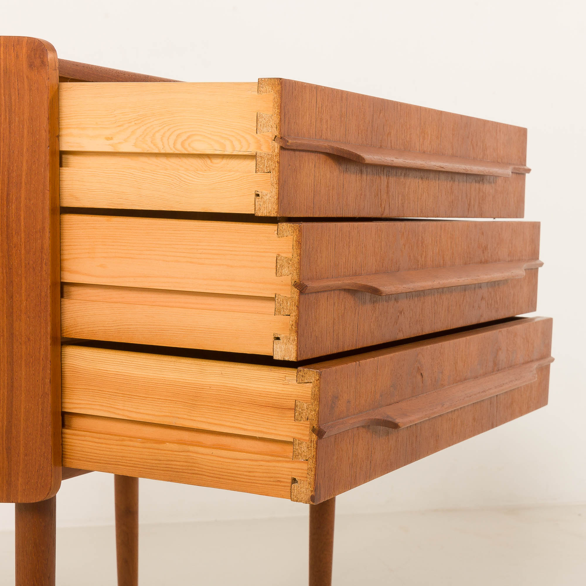 A small vintage Danish teak chest with three drawers and solid teak sculptural pull-out handles made in Denmark in 1960s. Most likely designed as an entry chest but could also be used as a side table or a nightstand. Slightly protruding edges add versatility to the piece making it perfect for a hallway or walk-in closet combined with a Danish midcentury mirror. The rich grain of teak veneer, diligent select on the front, and solid teak details show the mastery of Danish midcentury craftsmanship. Tapered solid teak legs emphasize the Scandinavian origin and are detachable, providing more convenient transport.