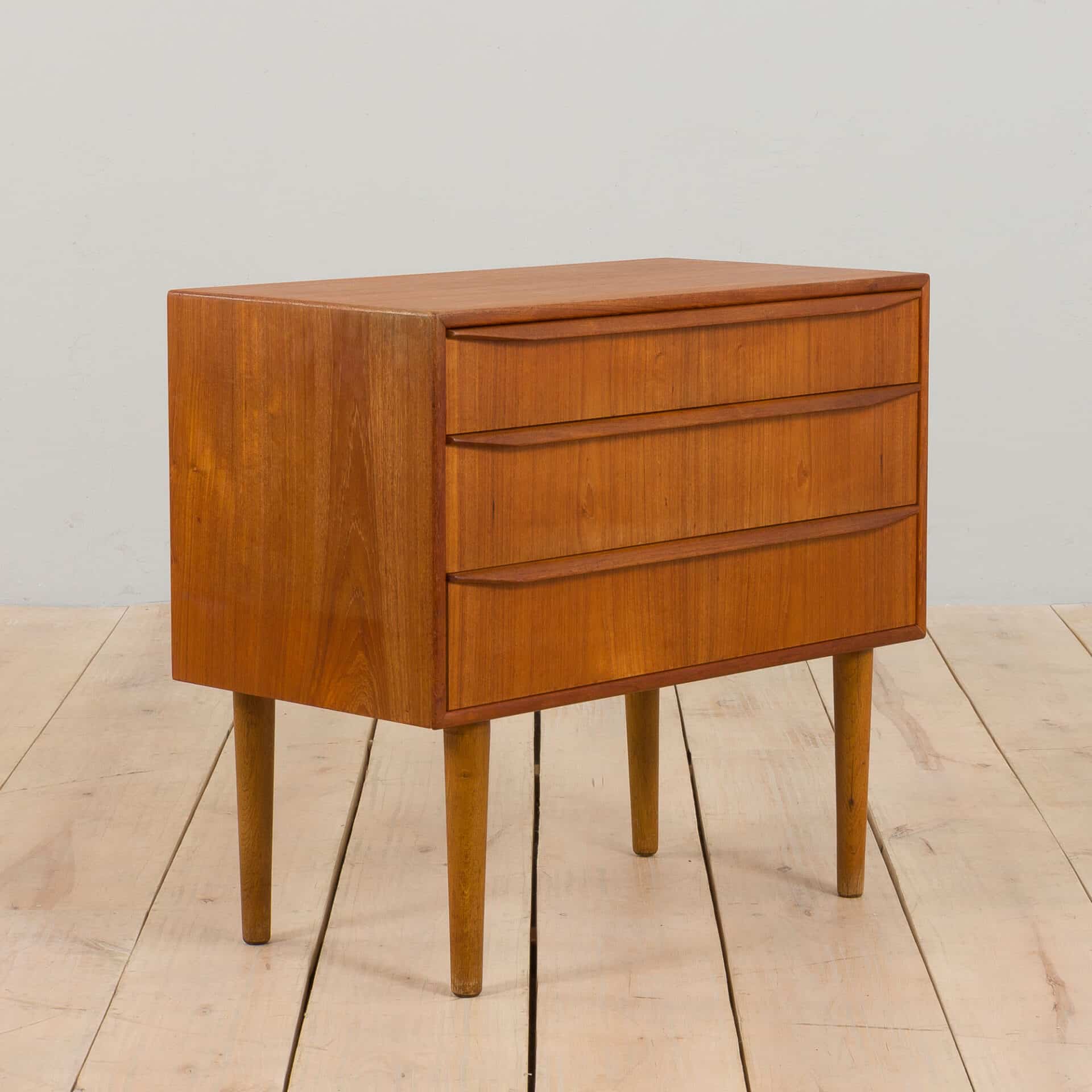 Atemberaubende kleine Kommode aus Teakholz mit drei Schubladen und massiven Teakholz-Griffen, hergestellt von einem dänischen Hersteller in den 1960er Jahren. Wahrscheinlich als Flurkommode konzipiert, kann aber auch als Beistelltisch oder Nachttisch verwendet werden. Die konischen Beine aus massivem Teakholz sind abnehmbar, was den Transport erleichtert. Hervorragender Vintage-Zustand, mit zusätzlichen Schichten Danish Oil renoviert. Die Schubladen sind sauber und lassen sich leichtgängig öffnen und schließen.