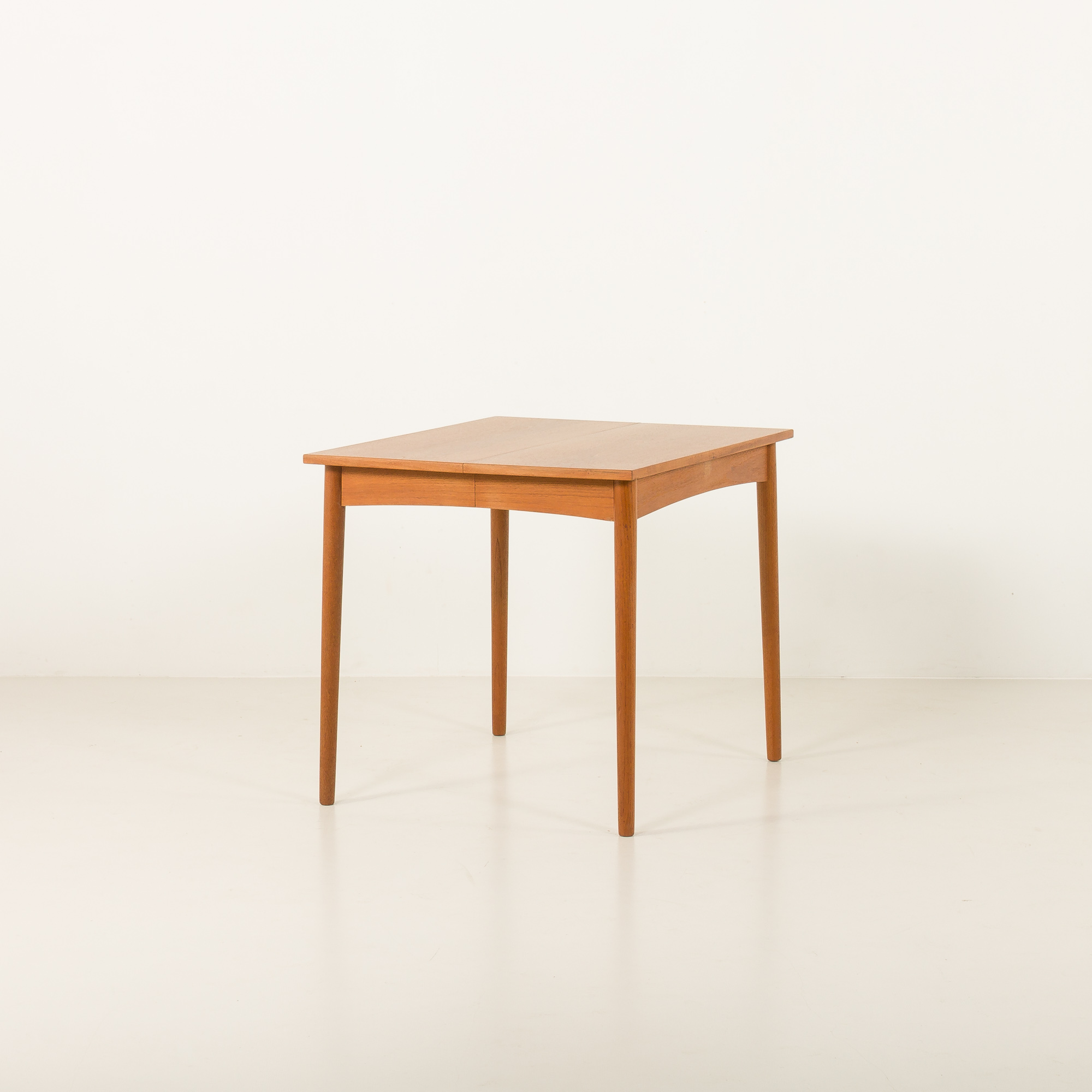 This elegant extendable square vintage table is a refined example of Danish mid-century modern design from the 1960s. With its clean lines and subtle craftsmanship, it embodies the quiet sophistication typical of Scandinavian furniture from this era.