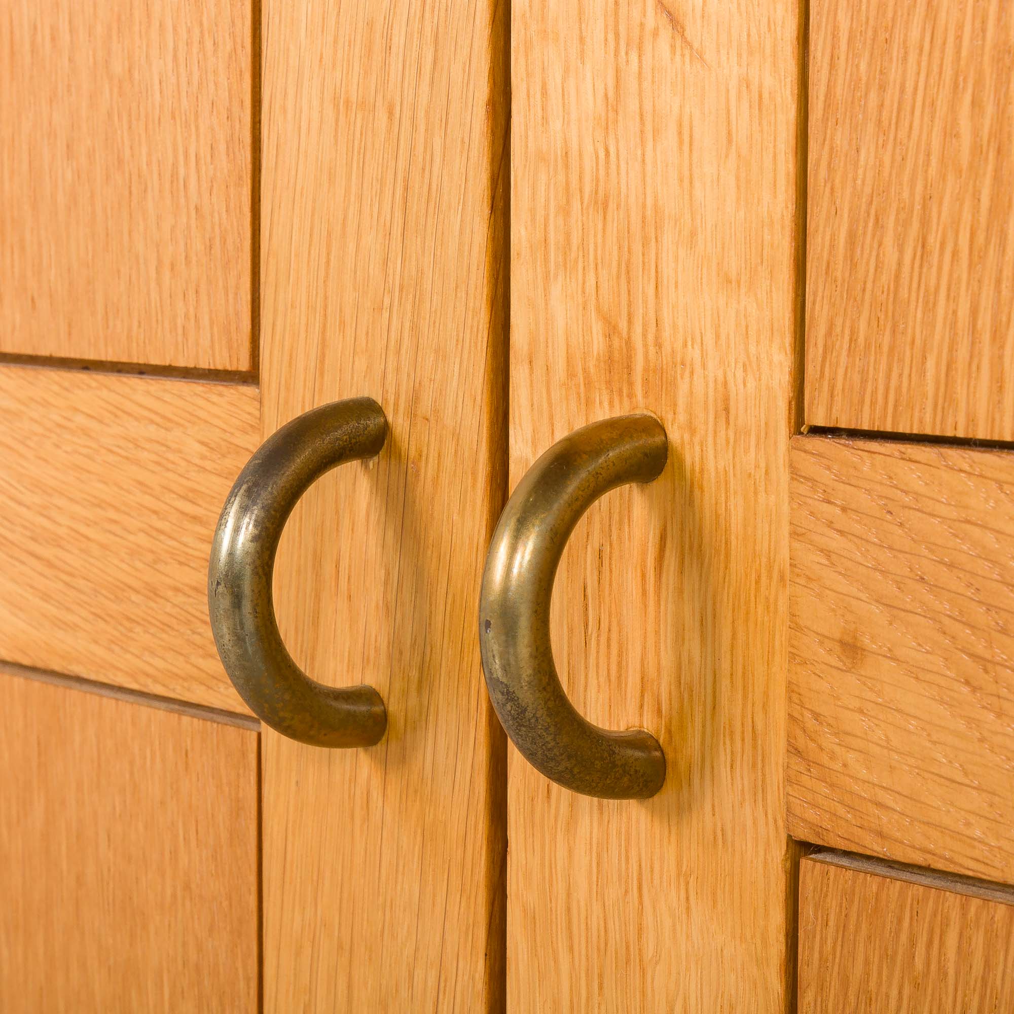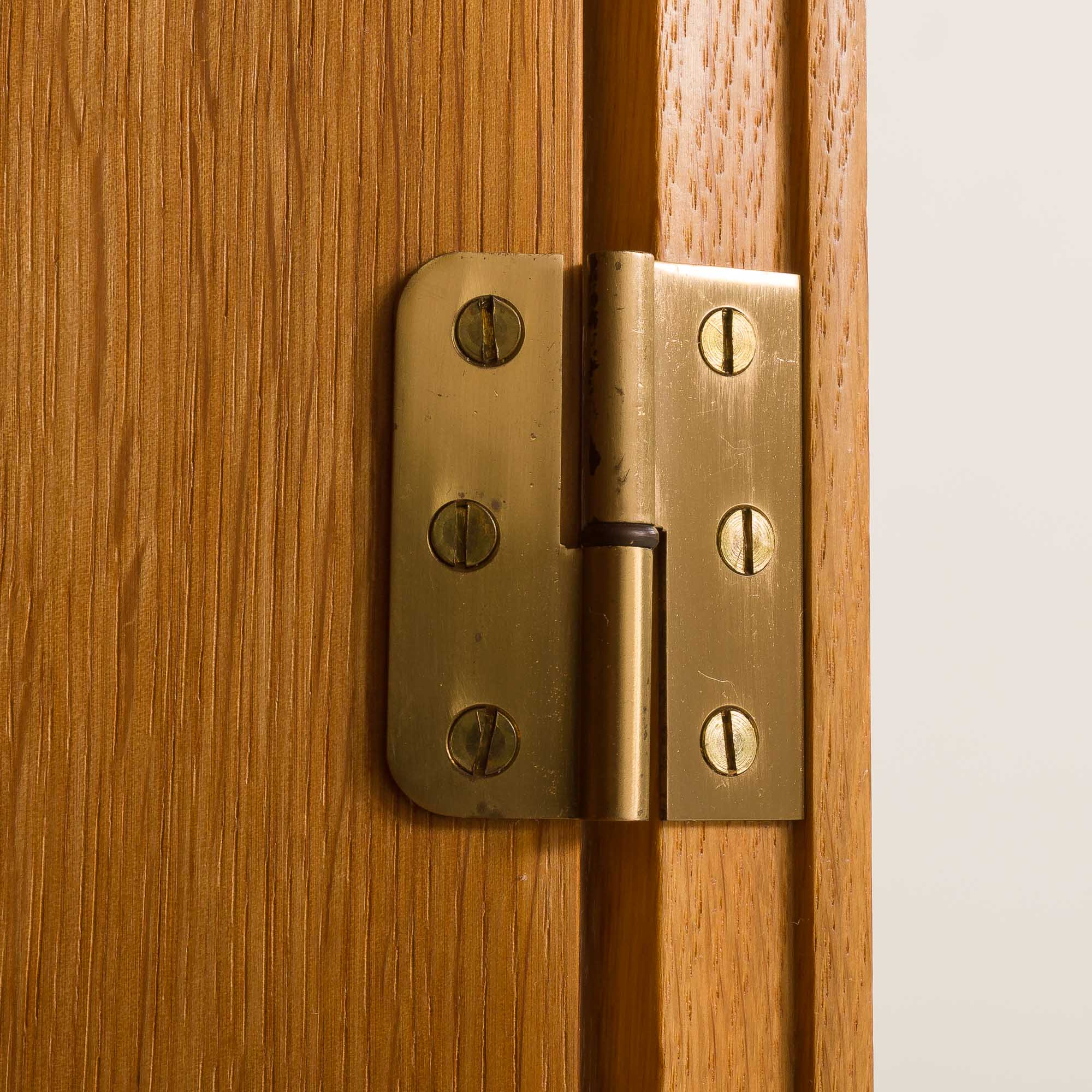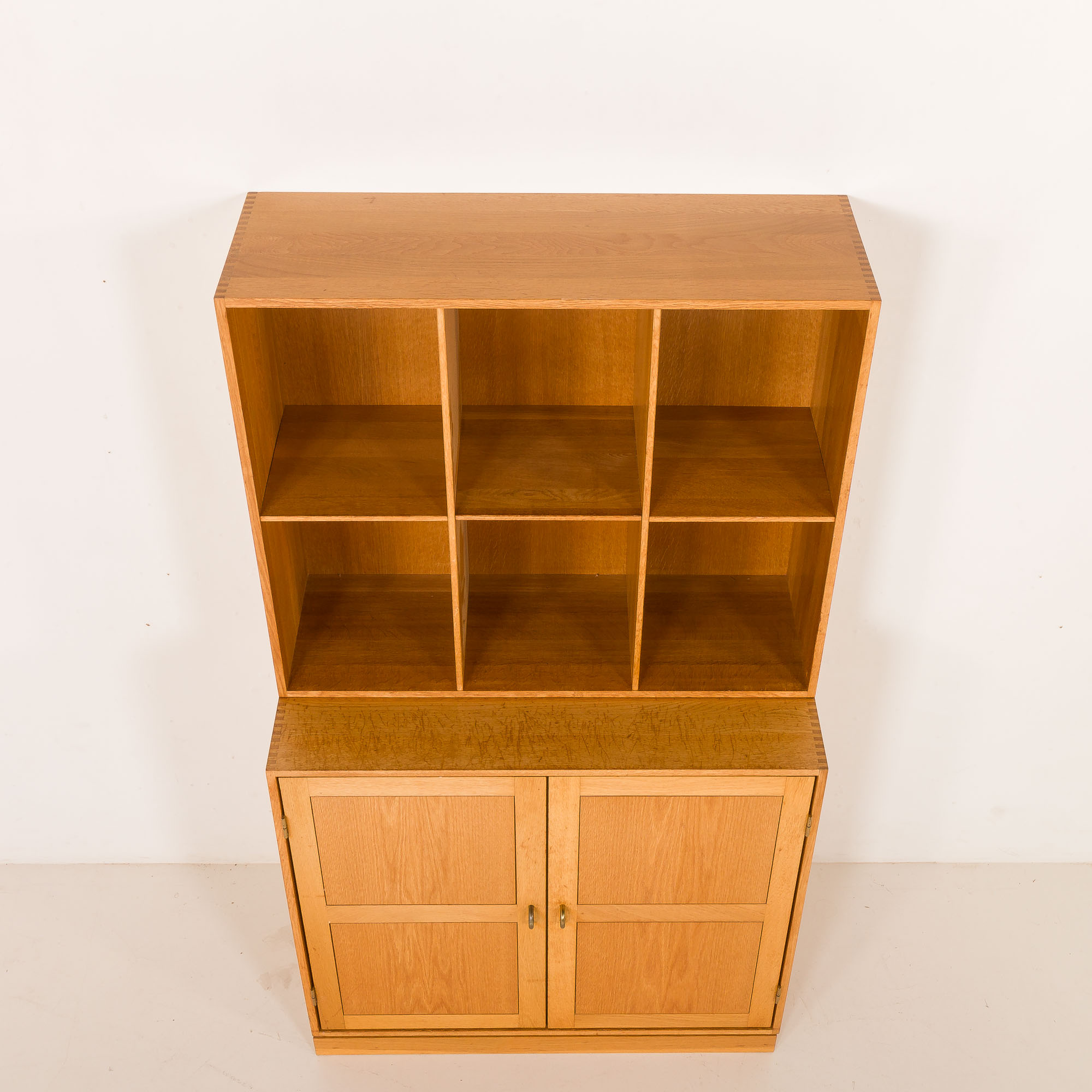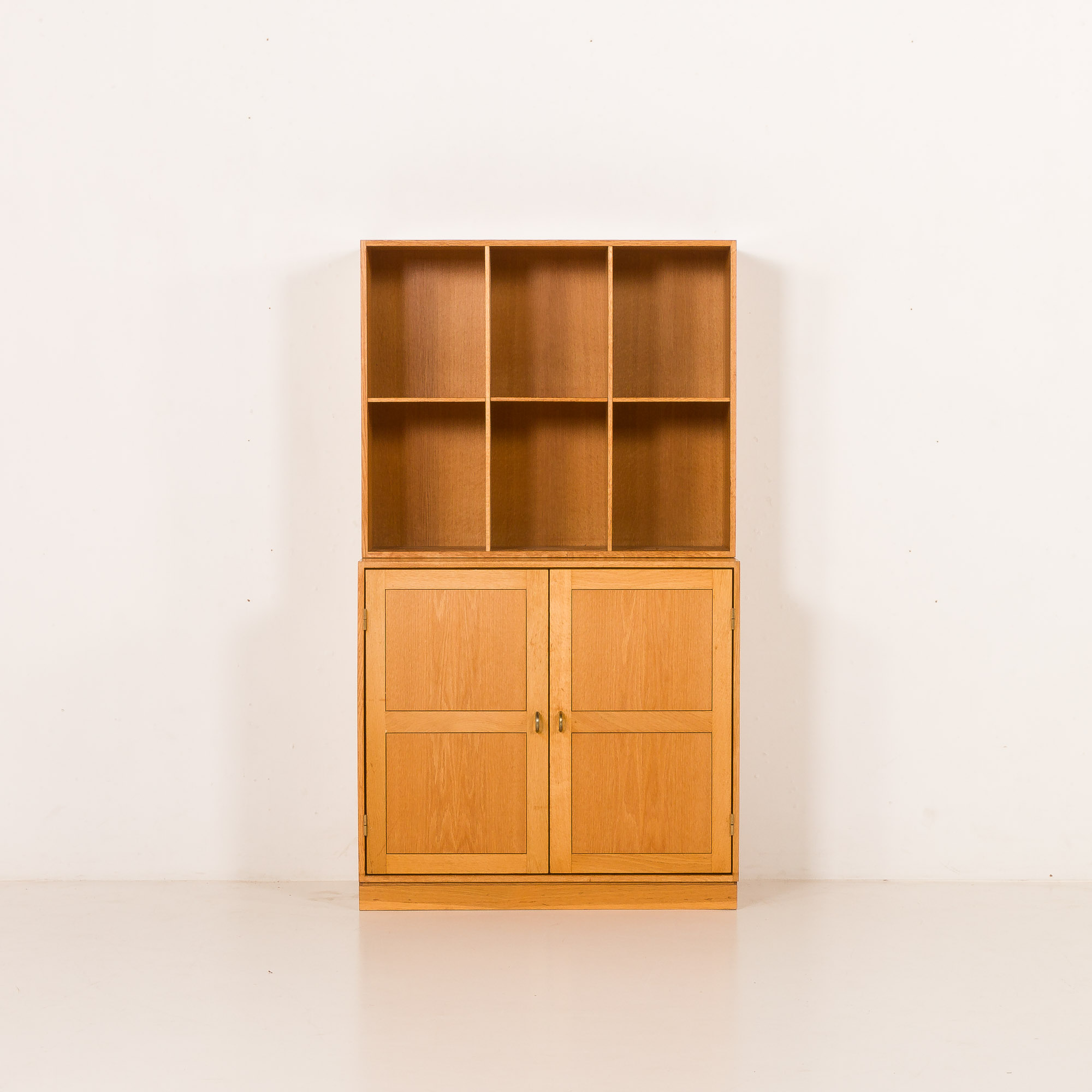 The bookcase consists of two independent sections that can be used together as a single unit or separated according to the needs of the interior. Crafted from oak, the bookcase showcases a warm, light golden natural tone and beautifully visible grain. The upper section is open and divided into six compartments, making it ideal for books, ceramics, or decorative objects. The lower section is enclosed with double doors and offers four internal compartments, providing practical concealed storage while maintaining a clean, minimalist appearance. The bookcase stands on oak base.
