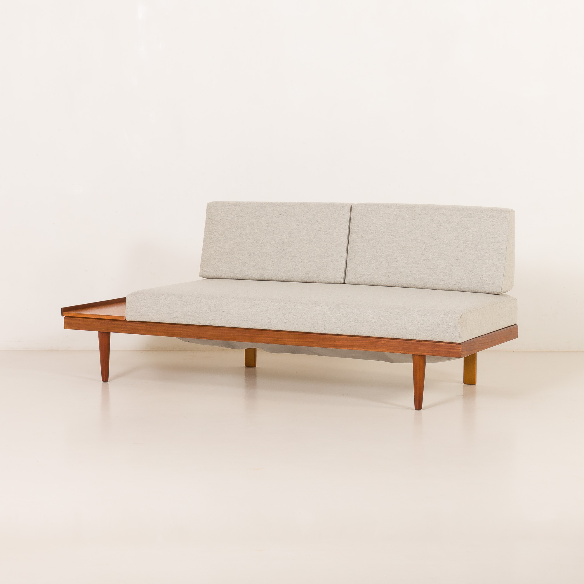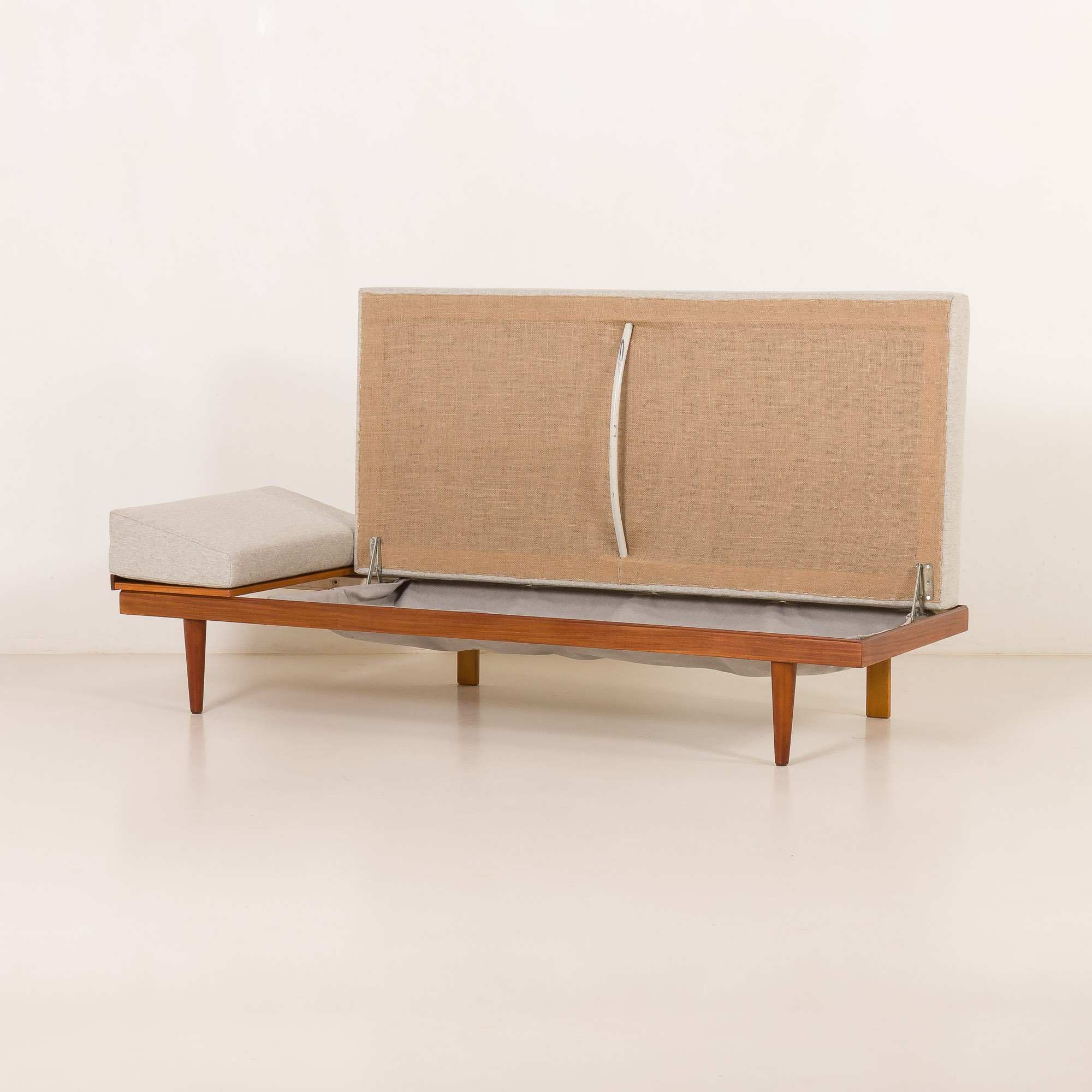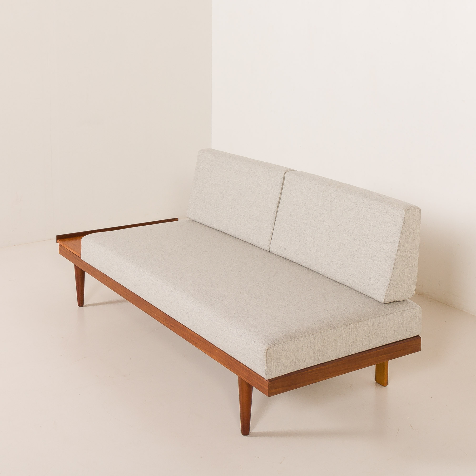 Pillows and mattresses have been reupholstered in elegant, light gray, fully natural wool fabric, and foams have been exchanged. Excellent condition. Total length reaches 190 cm.