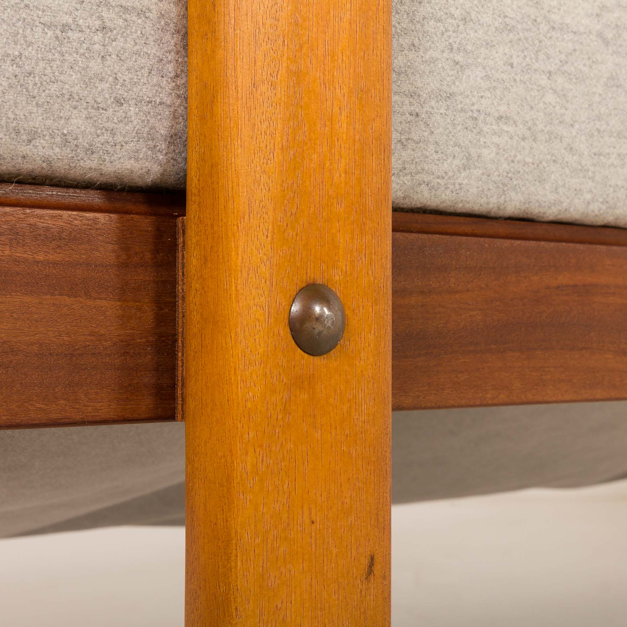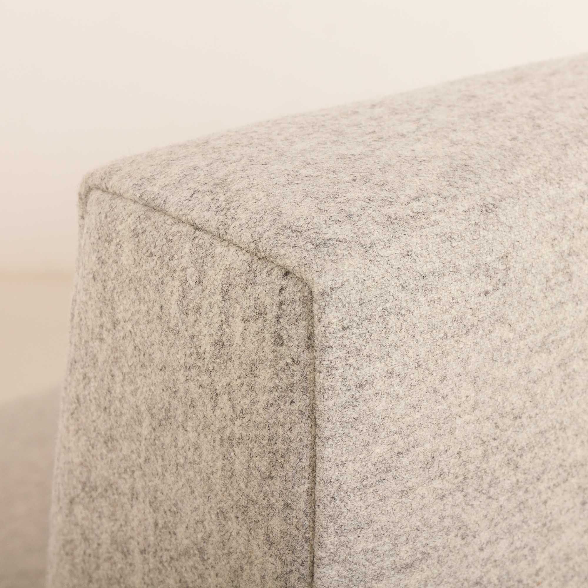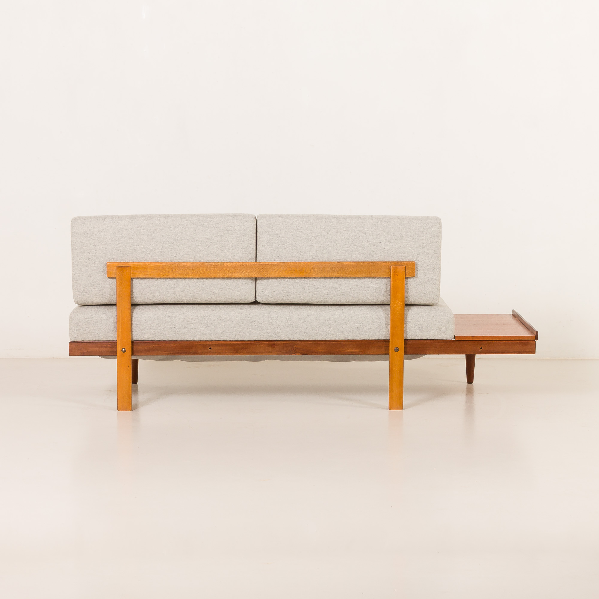 Pillows and mattresses have been reupholstered in elegant, light gray, fully natural wool fabric, and foams have been exchanged. Excellent condition. Total length reaches 190 cm.