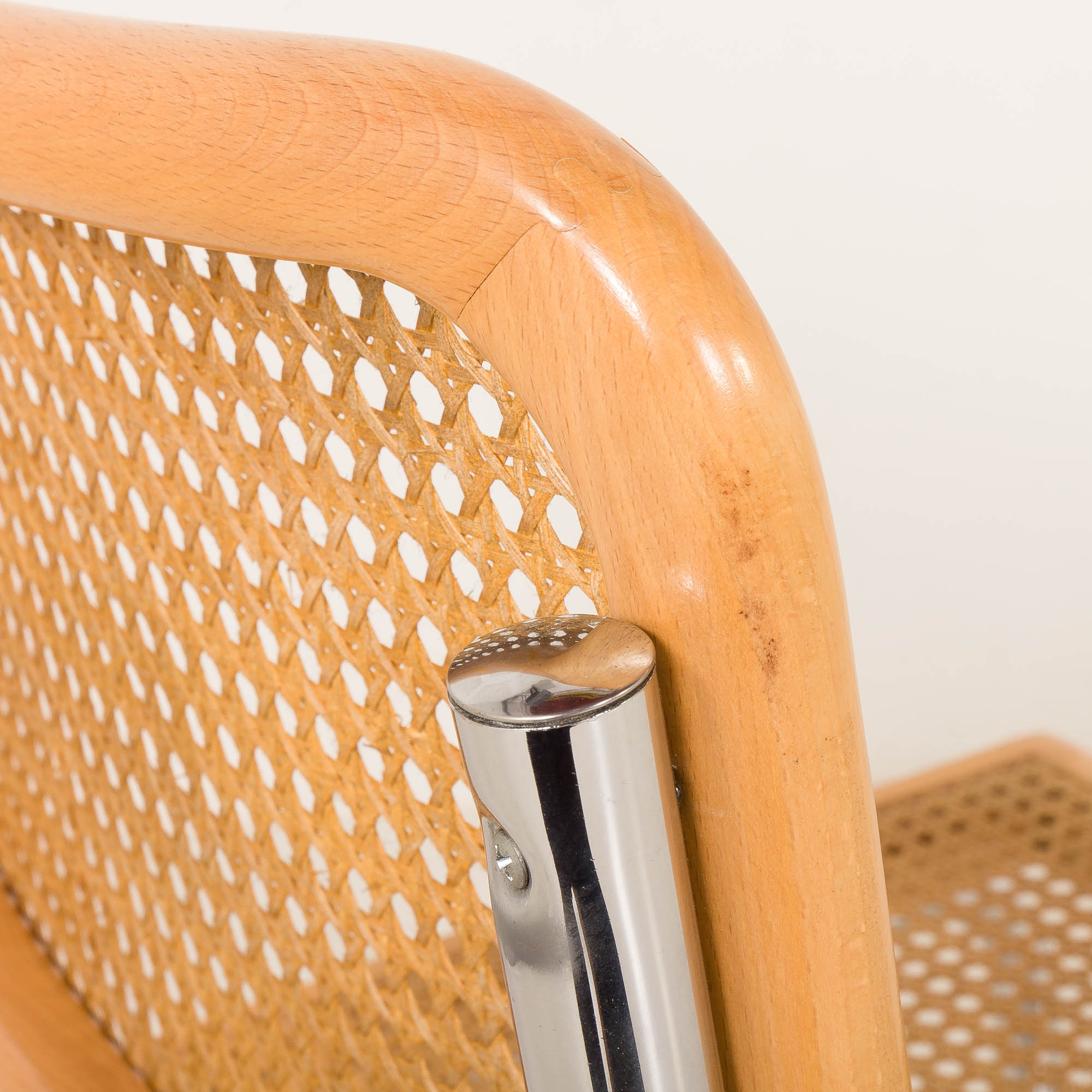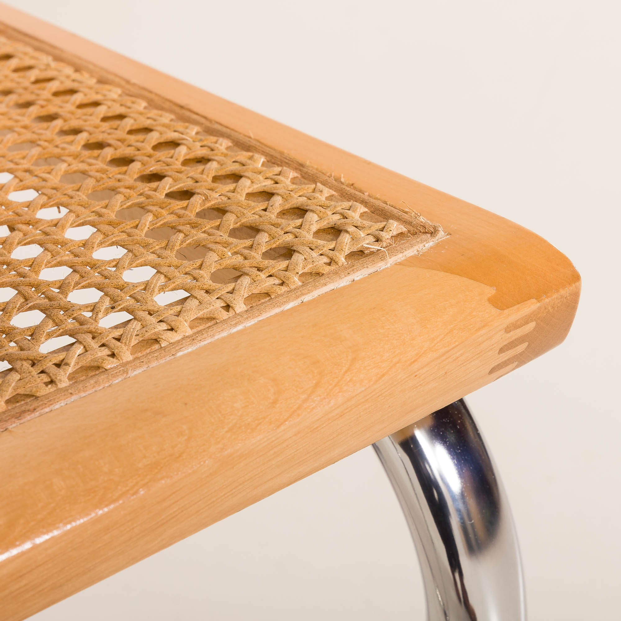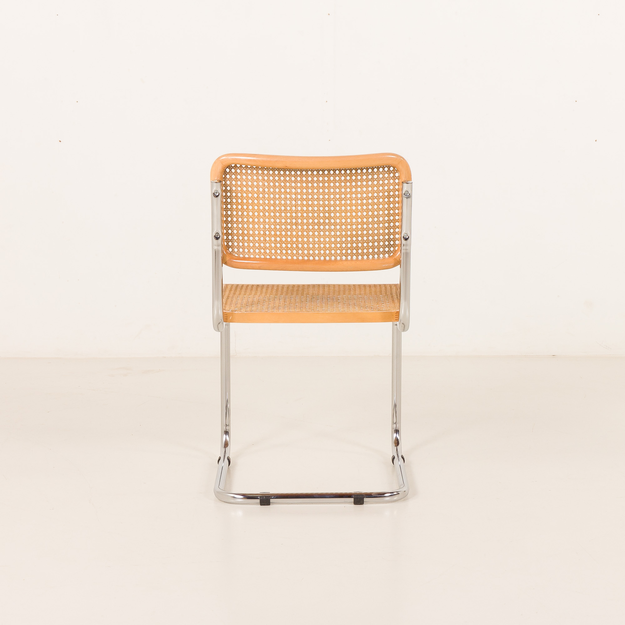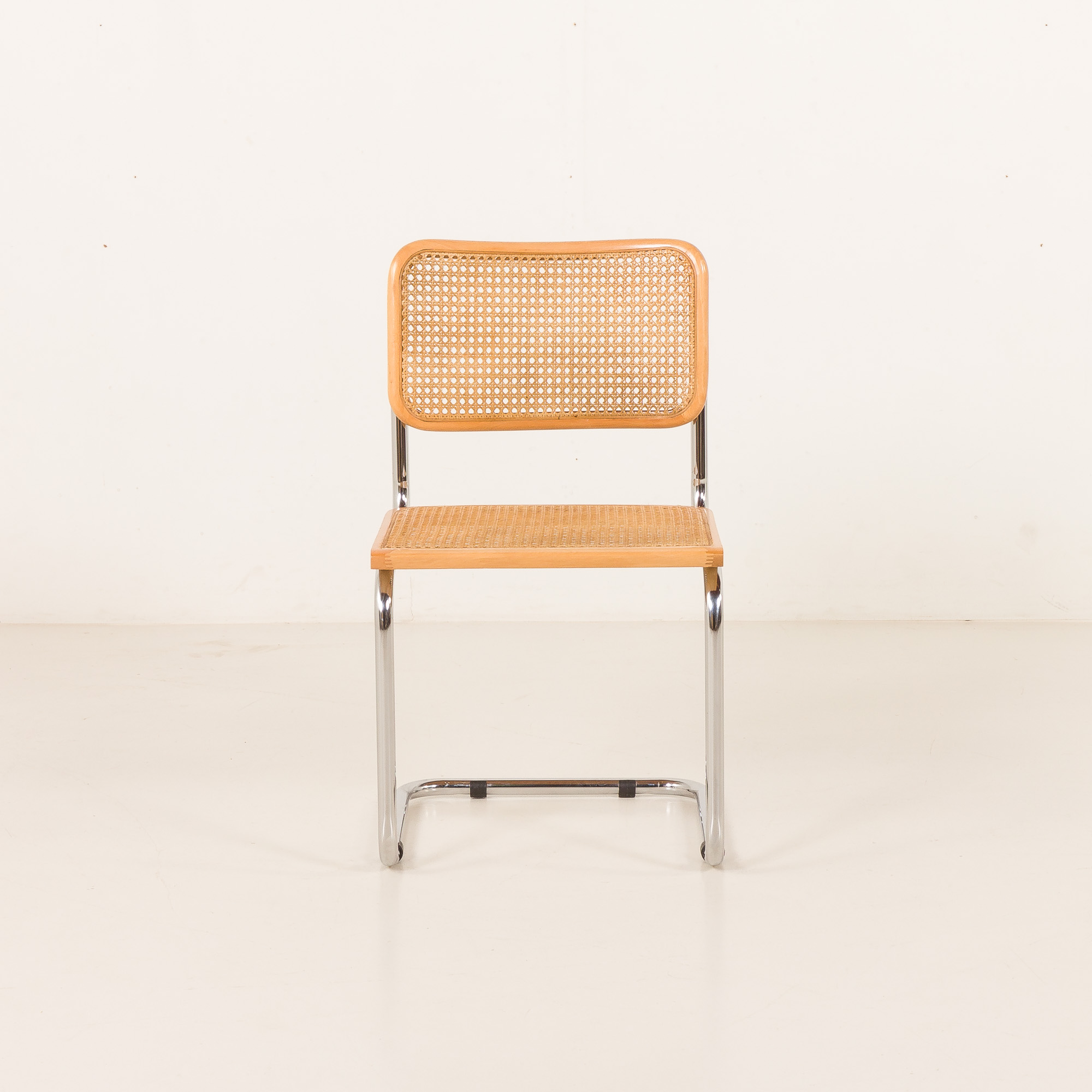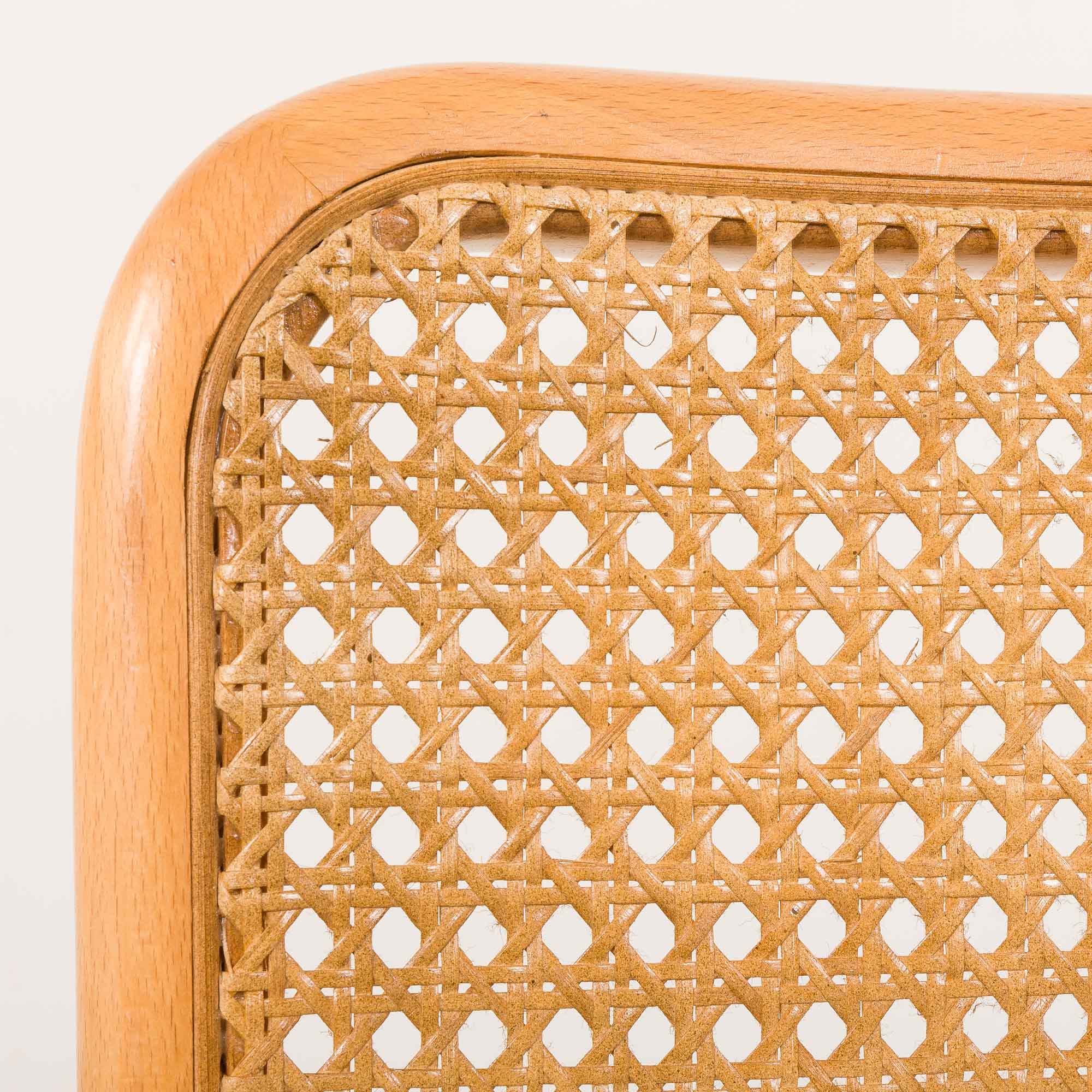 This Cesca chair features a natural beech frame with a harmonious light color throughout, enhancing its sleek and airy aesthetic. Throughout the 20th century, there were many manufacturers in Italy, many of them not licensed by Breuer. Some of the copies are very well done with good proportions, like the one above. The most attractive feature is the way they age, especially the caning showing the light golden color.