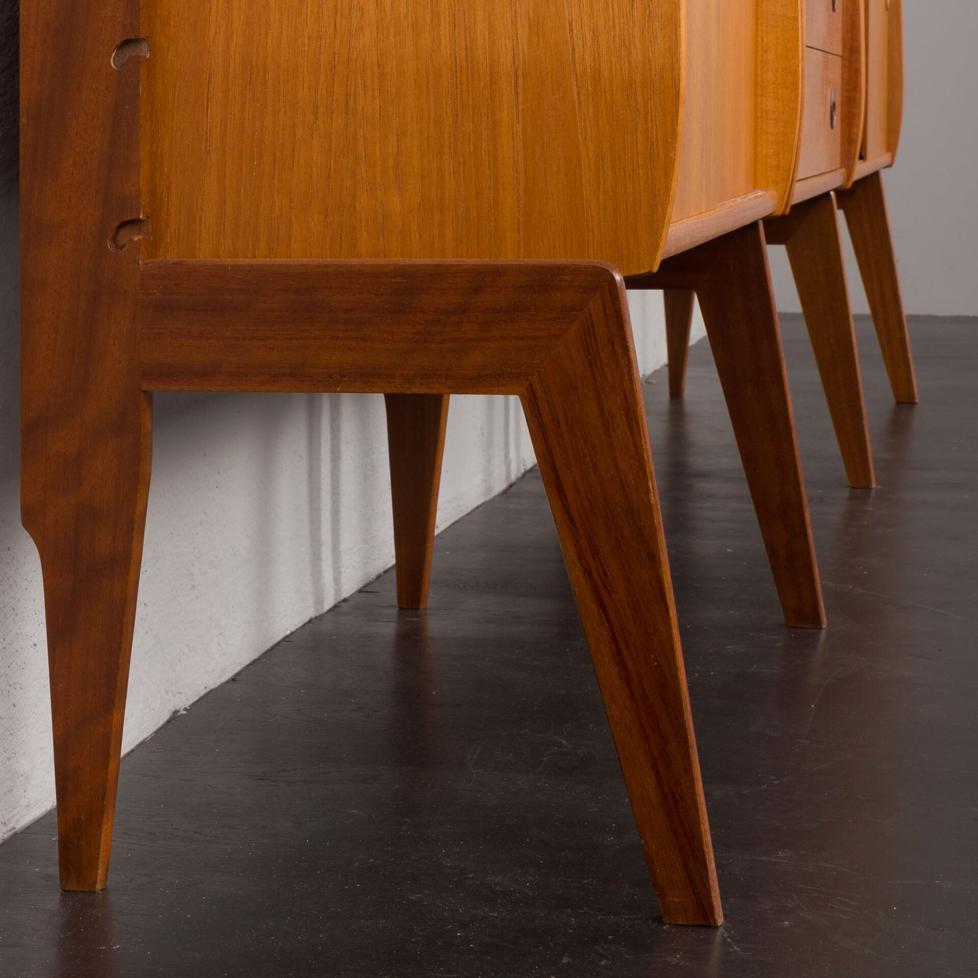 The wall unit has been checked by our team. We have examined if all doors and drawers work properly. On many occasions, we have to sand down and refinish the most used parts (if they are scratched badly). Here we have only rejuvenated the wood with Danish Oil. We leave minor signs of use that do not spoil the aesthetic and only confirm it is originality. We try to bring furniture back to its best look, still considering they are 60 years old. Clients from all around the world already have trusted our work and its fruits.