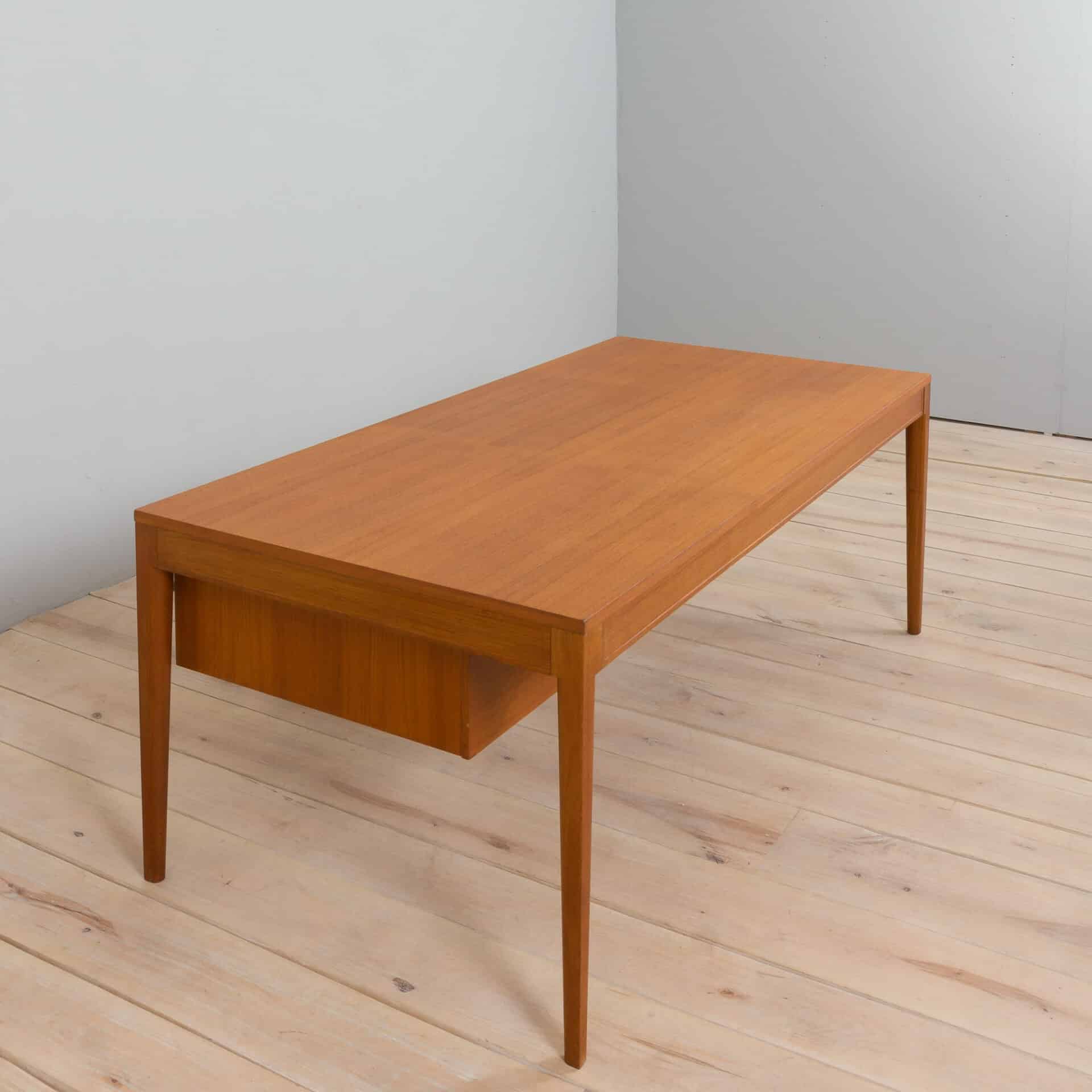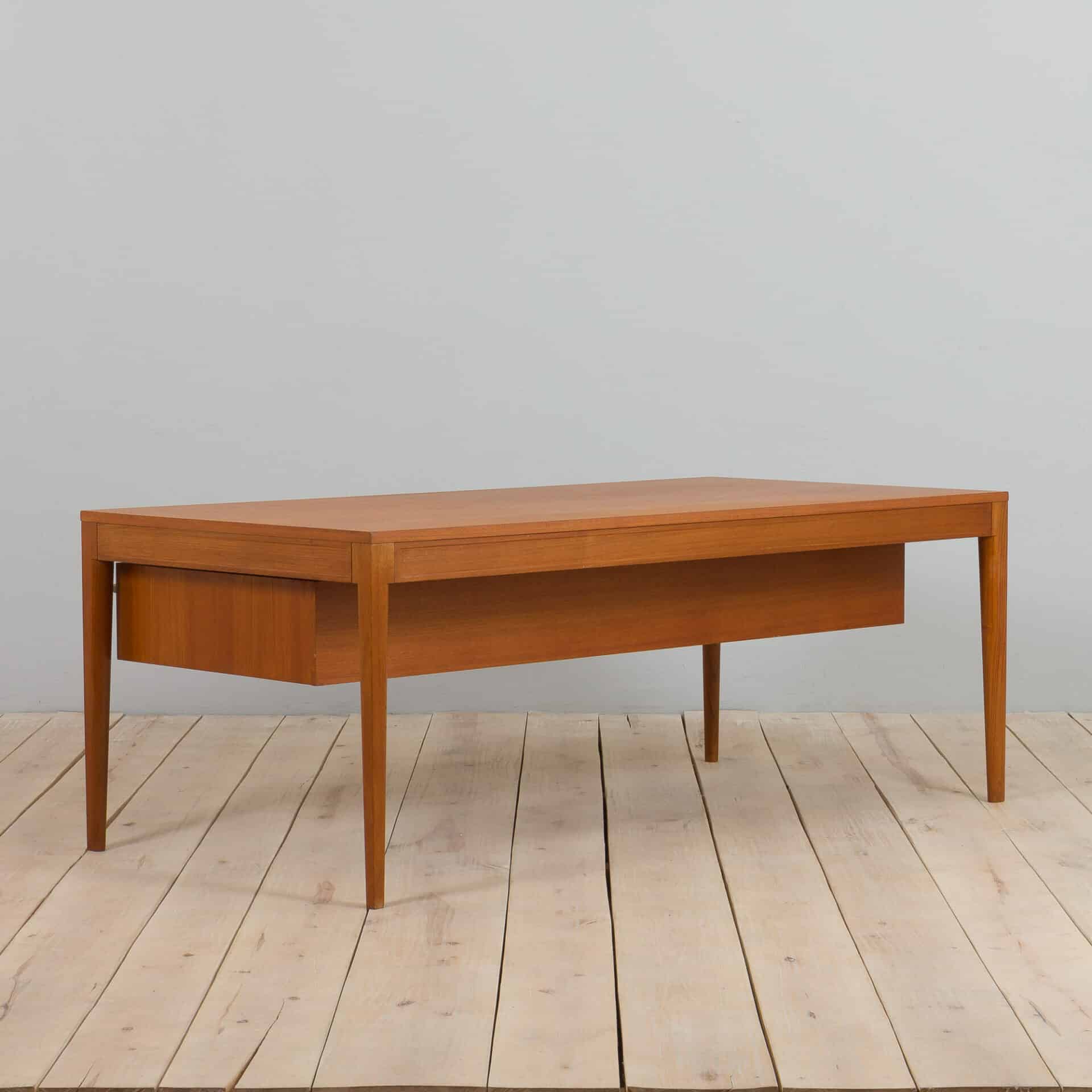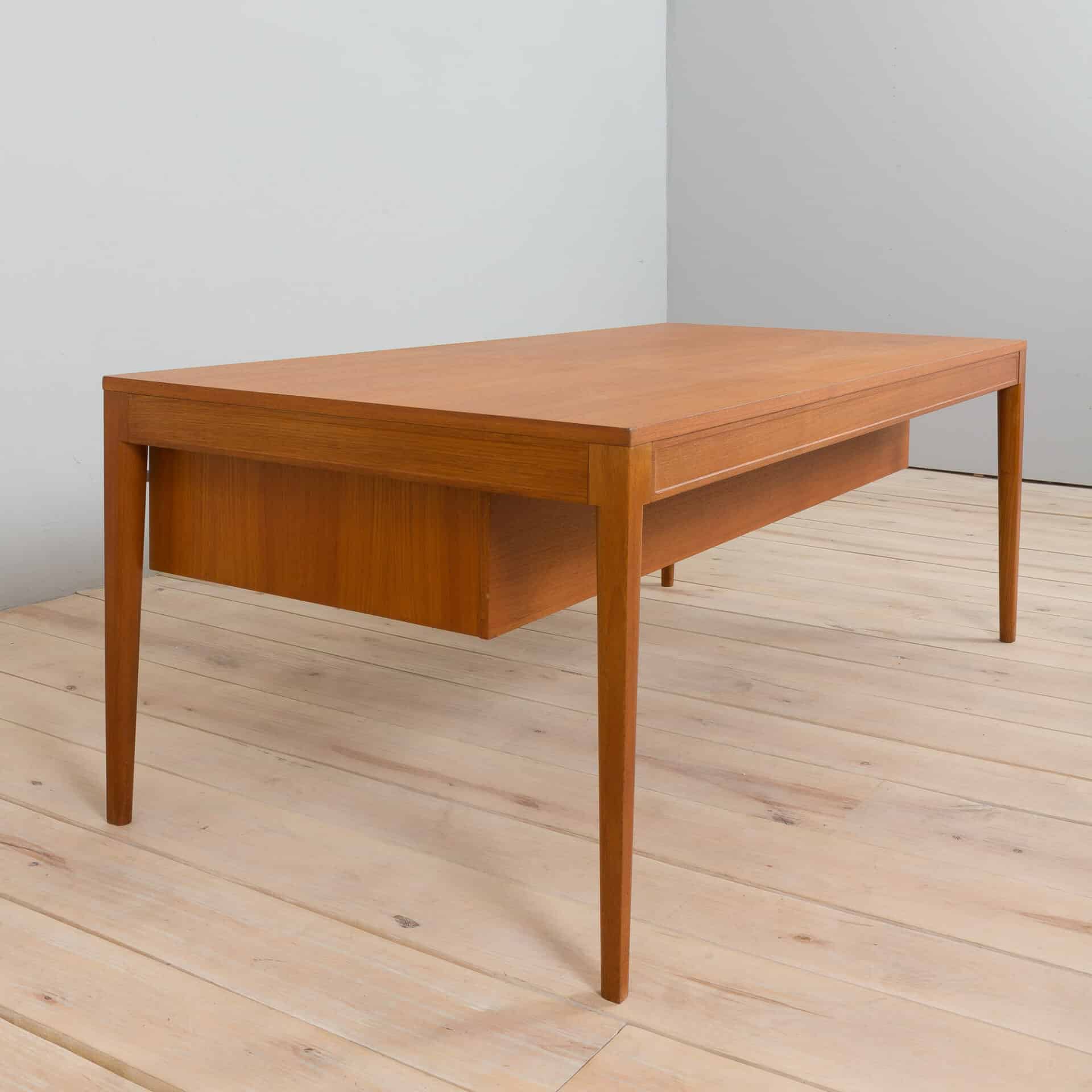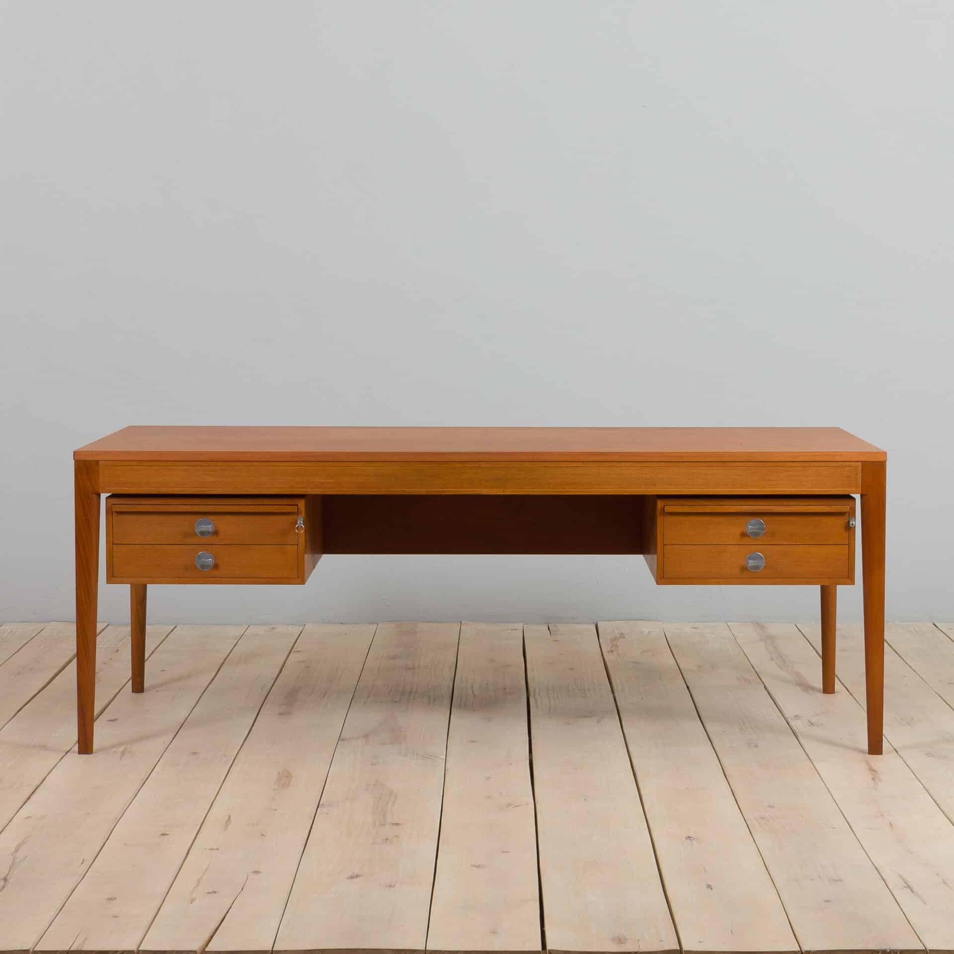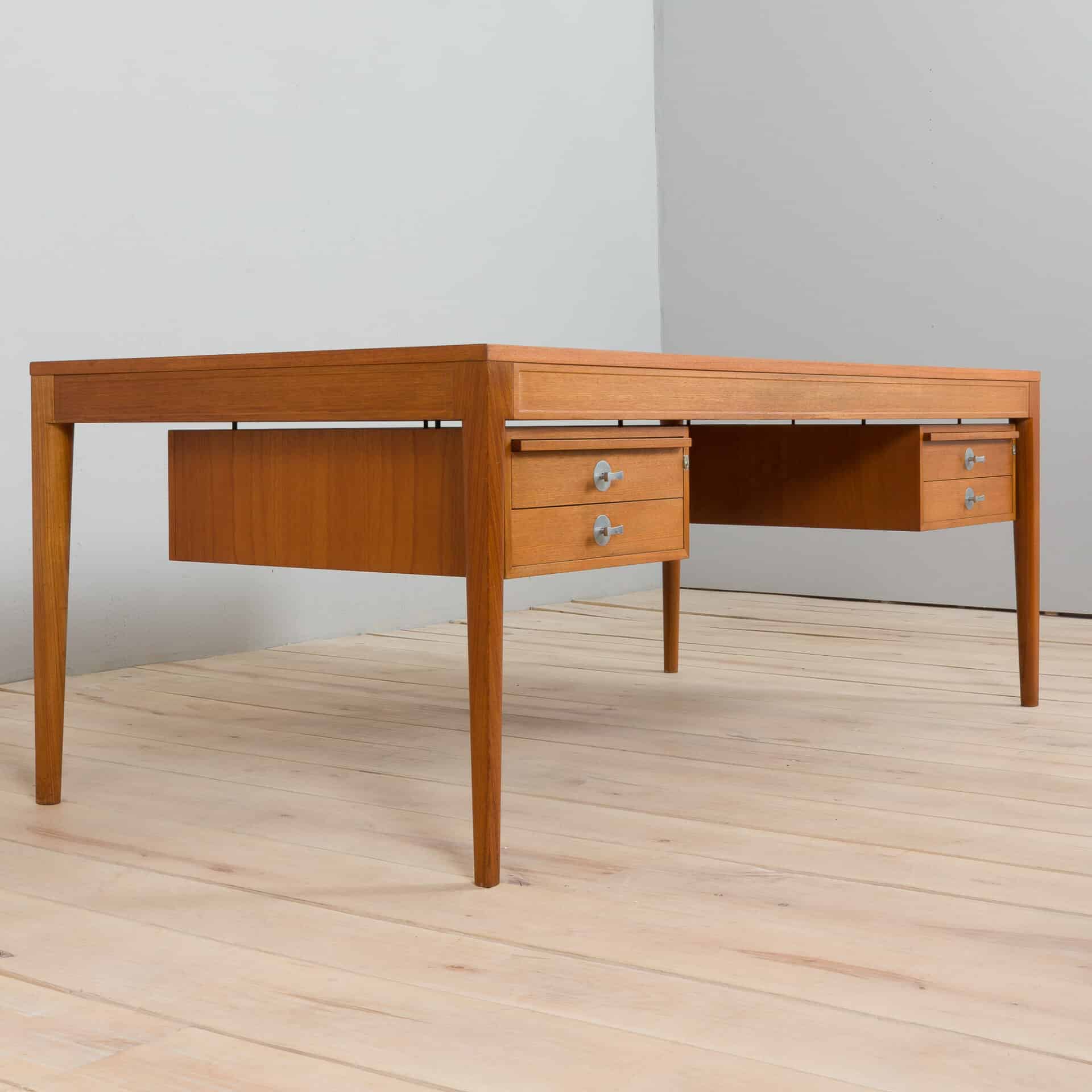 This extra-large ‘Diplomat’ writing teak desk was designed by Finn Juhl in 1958 and made by France & Son in Denmark in the 1960s. The desk features two floating drawers on each side with handles in polished aluminum and a central locking mechanism on both sides. Two keys included. The drawers have wooden dividers inside, and on each side, there is a very useful pull-out glass shelf.