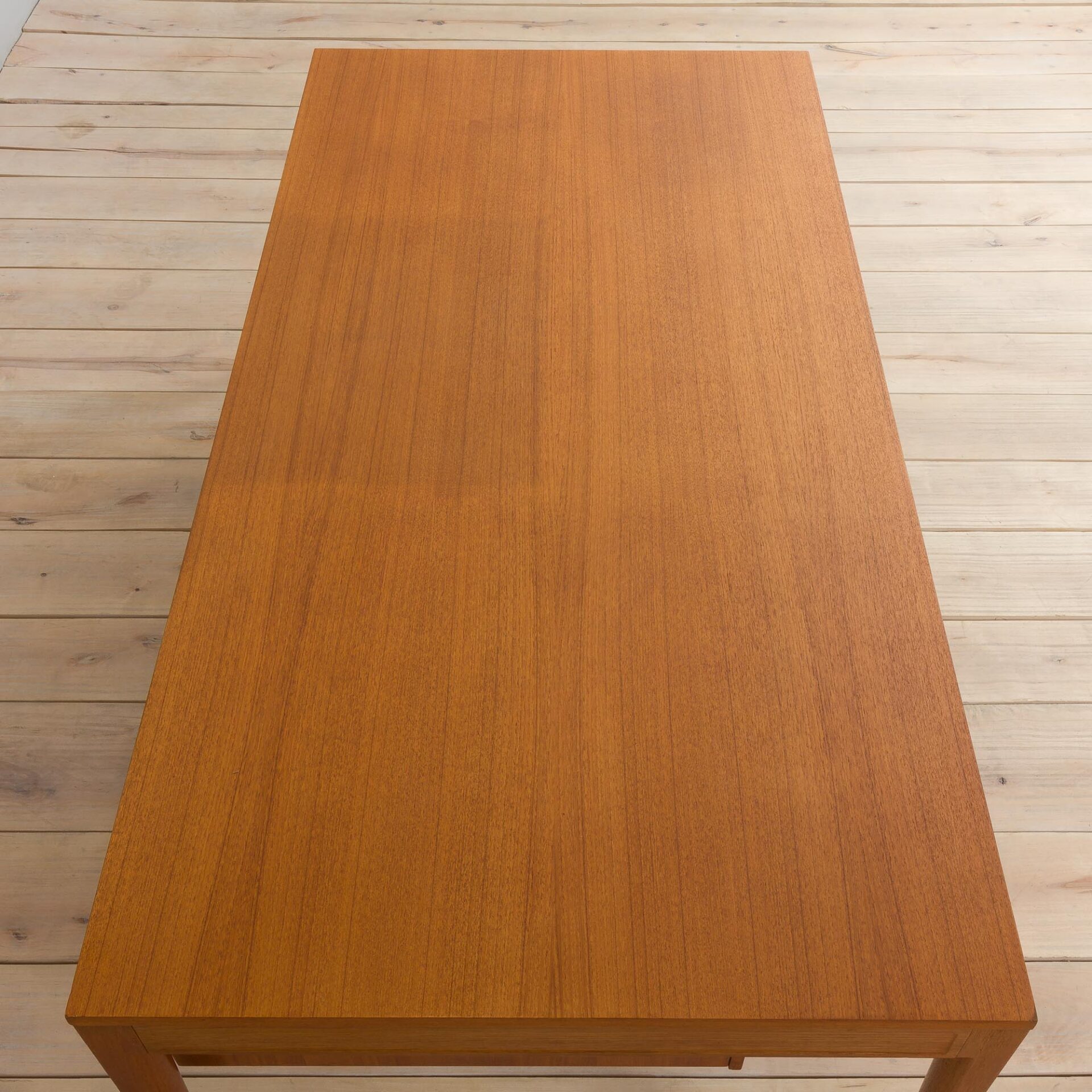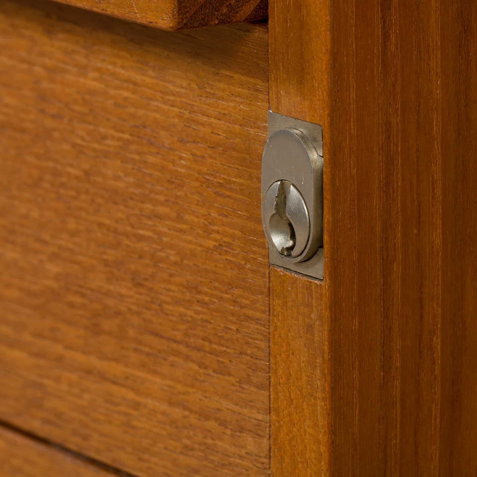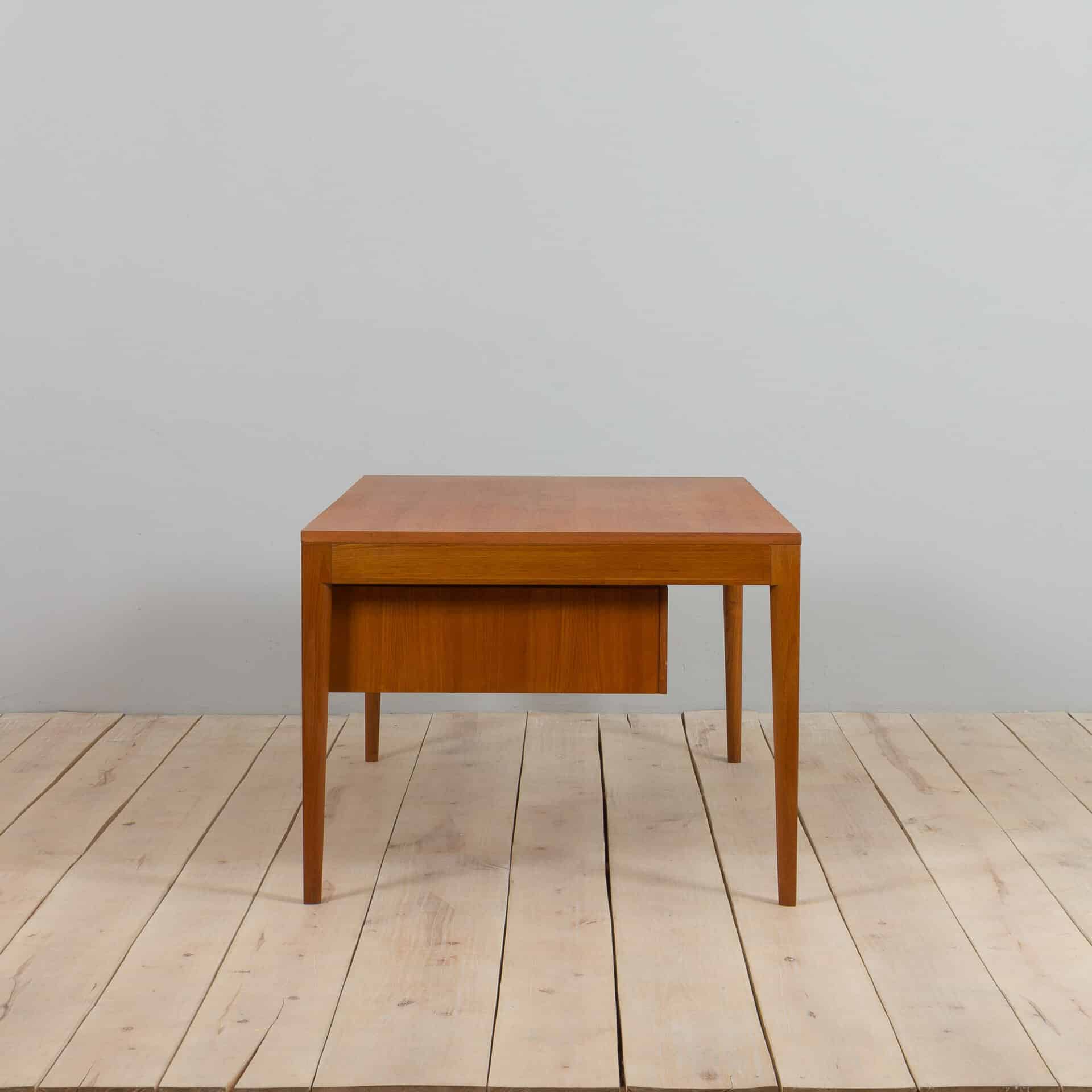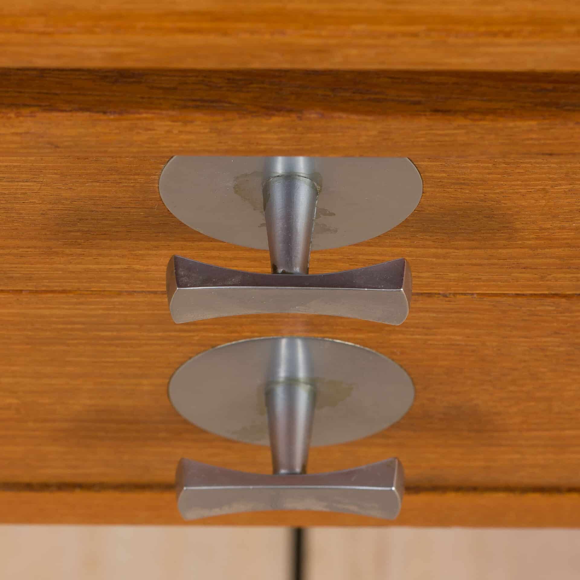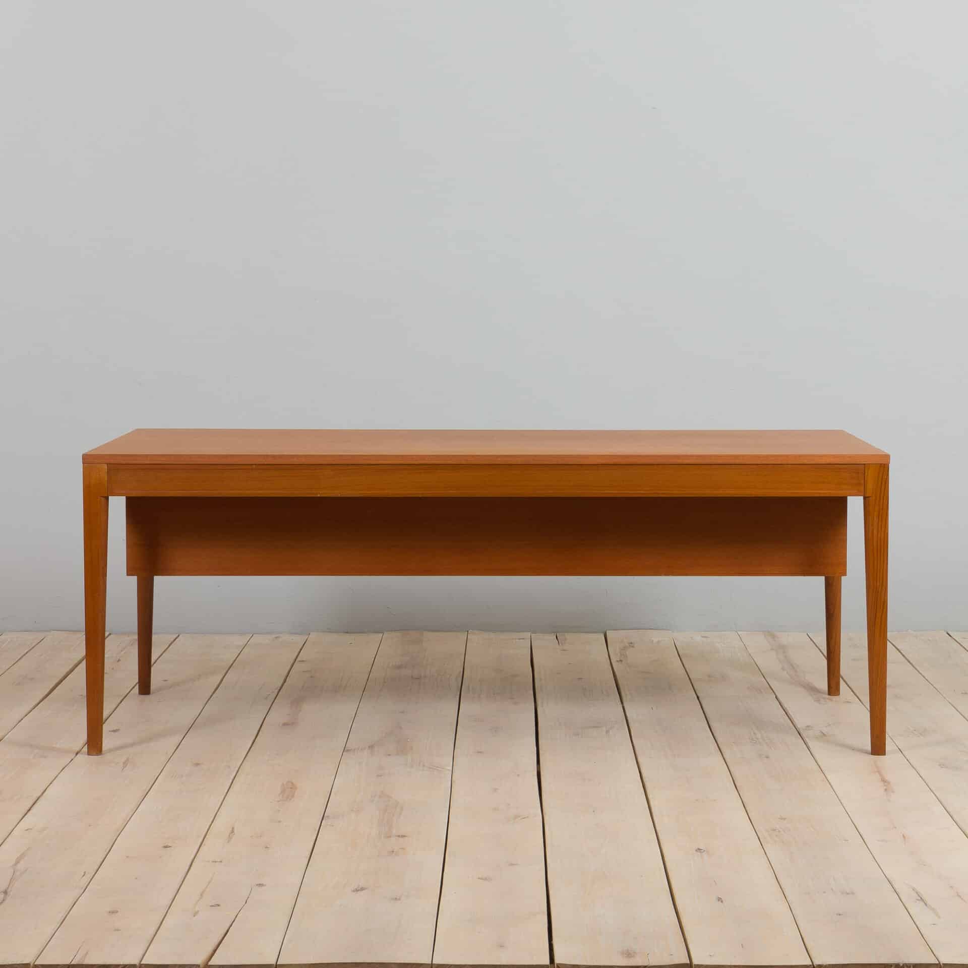 This extra-large ‘Diplomat’ writing teak desk was designed by Finn Juhl in 1958 and made by France & Son in Denmark in the 1960s. The desk features two floating drawers on each side with handles in polished aluminum and a central locking mechanism on both sides. Two keys included. The drawers have wooden dividers inside, and on each side, there is a very useful pull-out glass shelf.