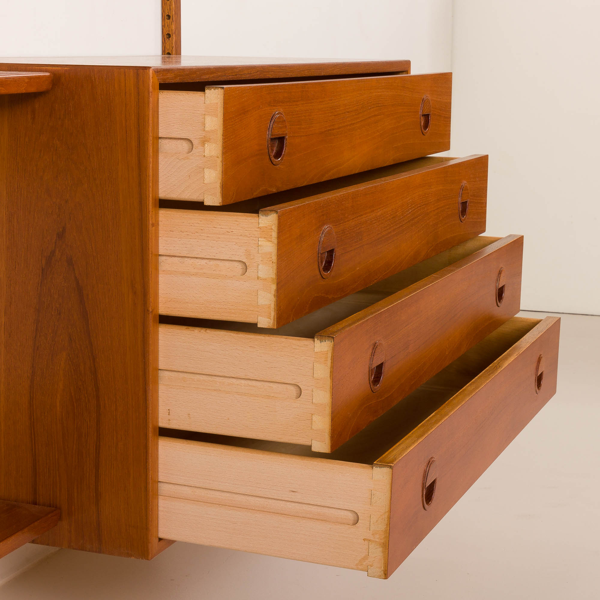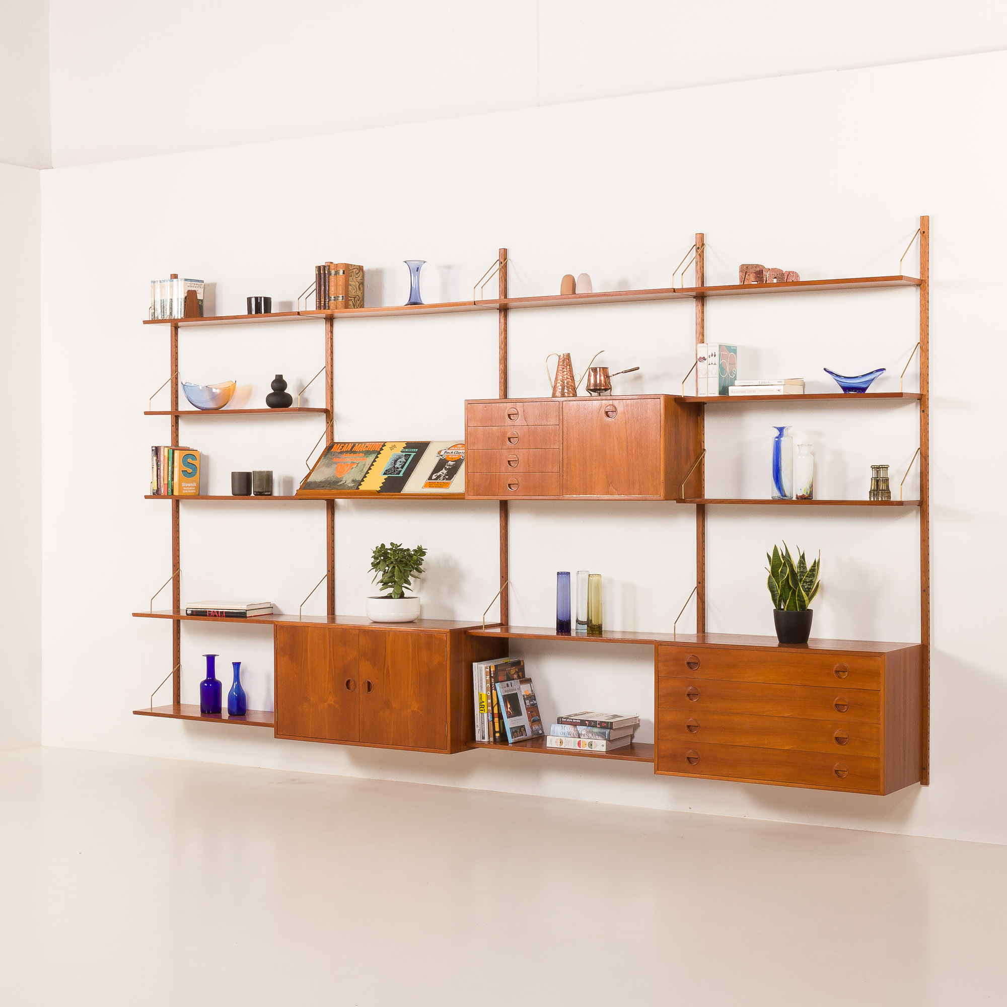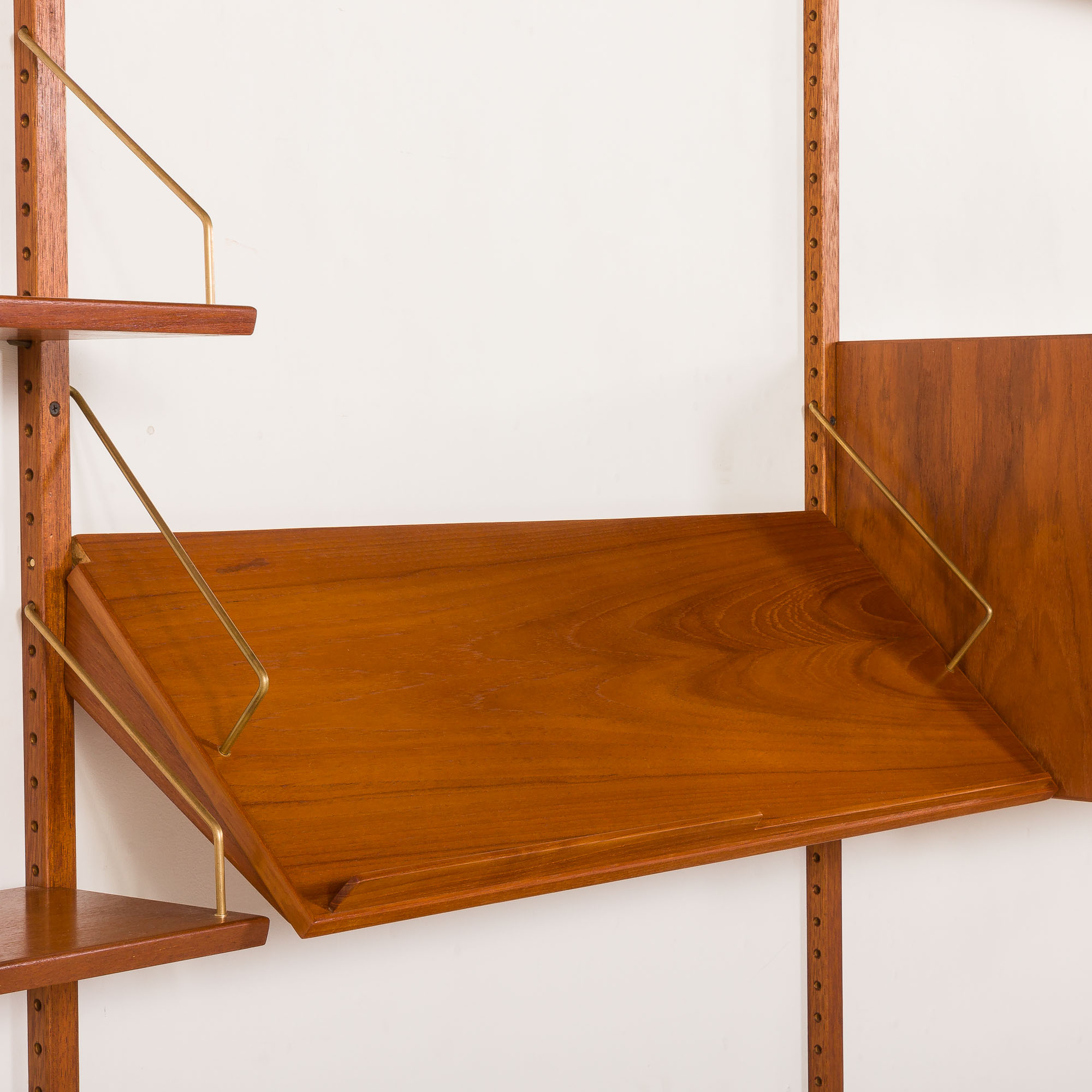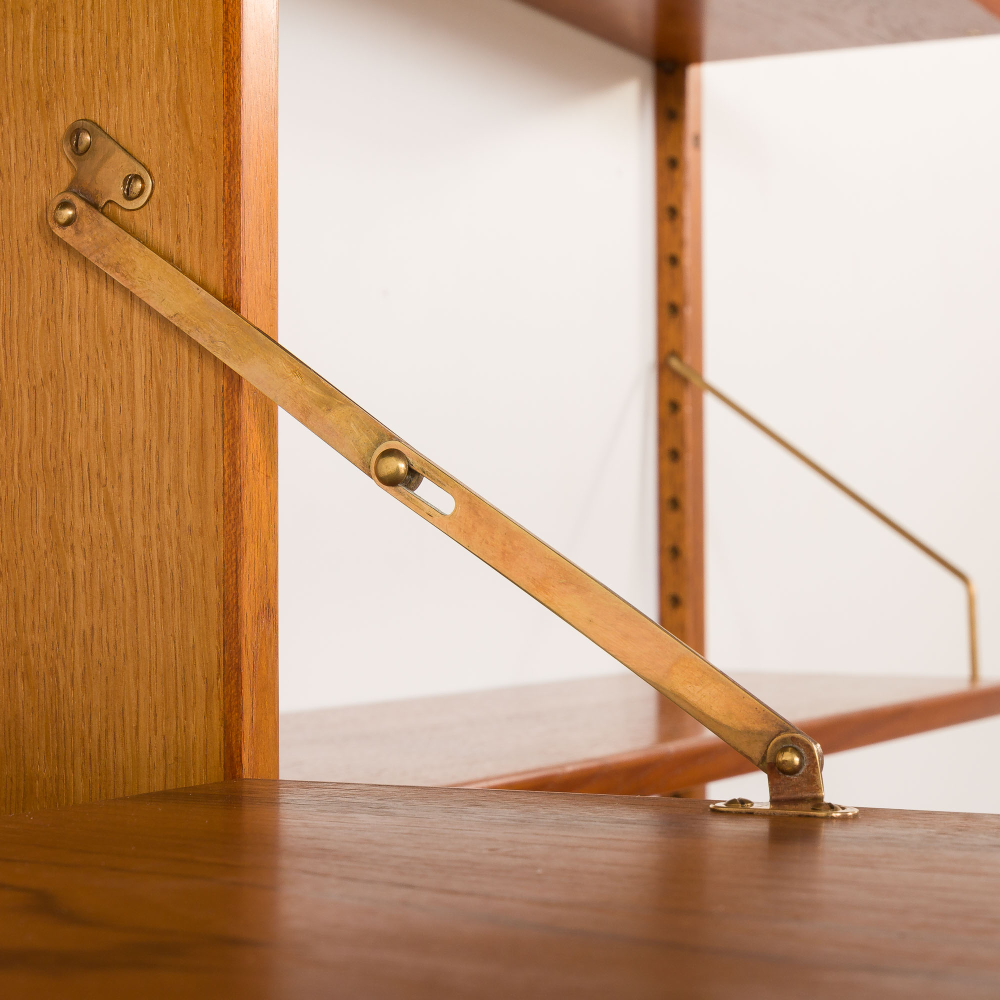 The modular system is supported by five solid teak wall-mounted rails with original solid brass hangers, allowing easy adjustment and reconfiguration of all elements according to your needs.
