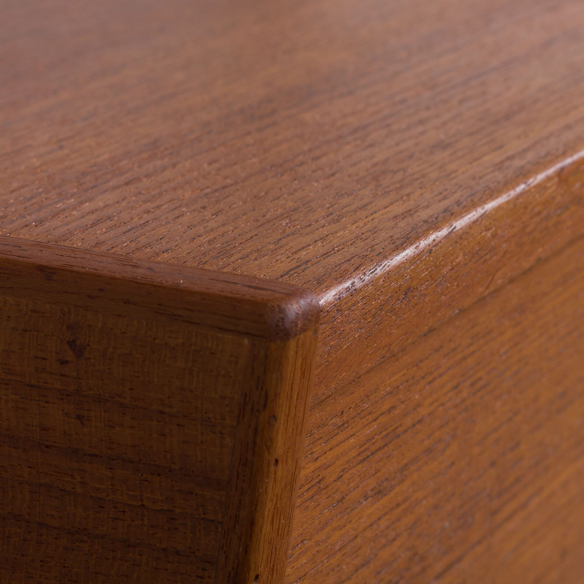 Danish mid-century teak wall unit with a floating desk was designed by Thygesen and Sorensen for Hansen & Guldborg, in the 60s. It can perfectly create an unobtrusive workspace in the living room or an elegant welcome area in the hallway. The nicely shaped desk has two drawers with beautiful sculptured recessed pull handles made of solid teak.