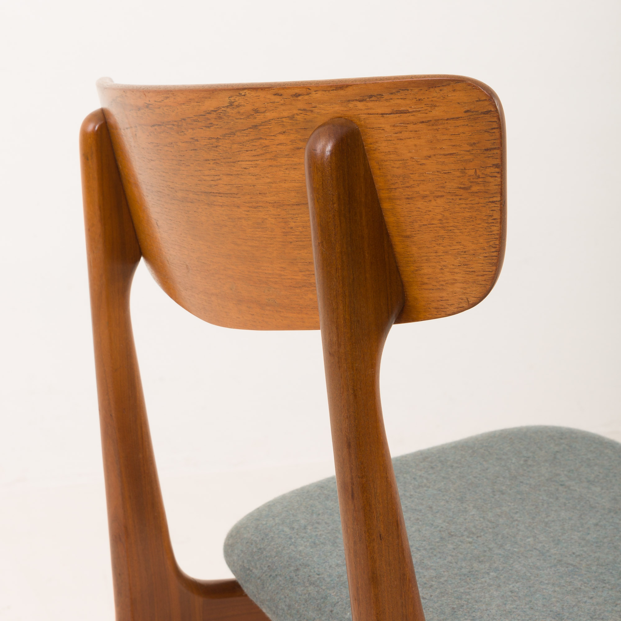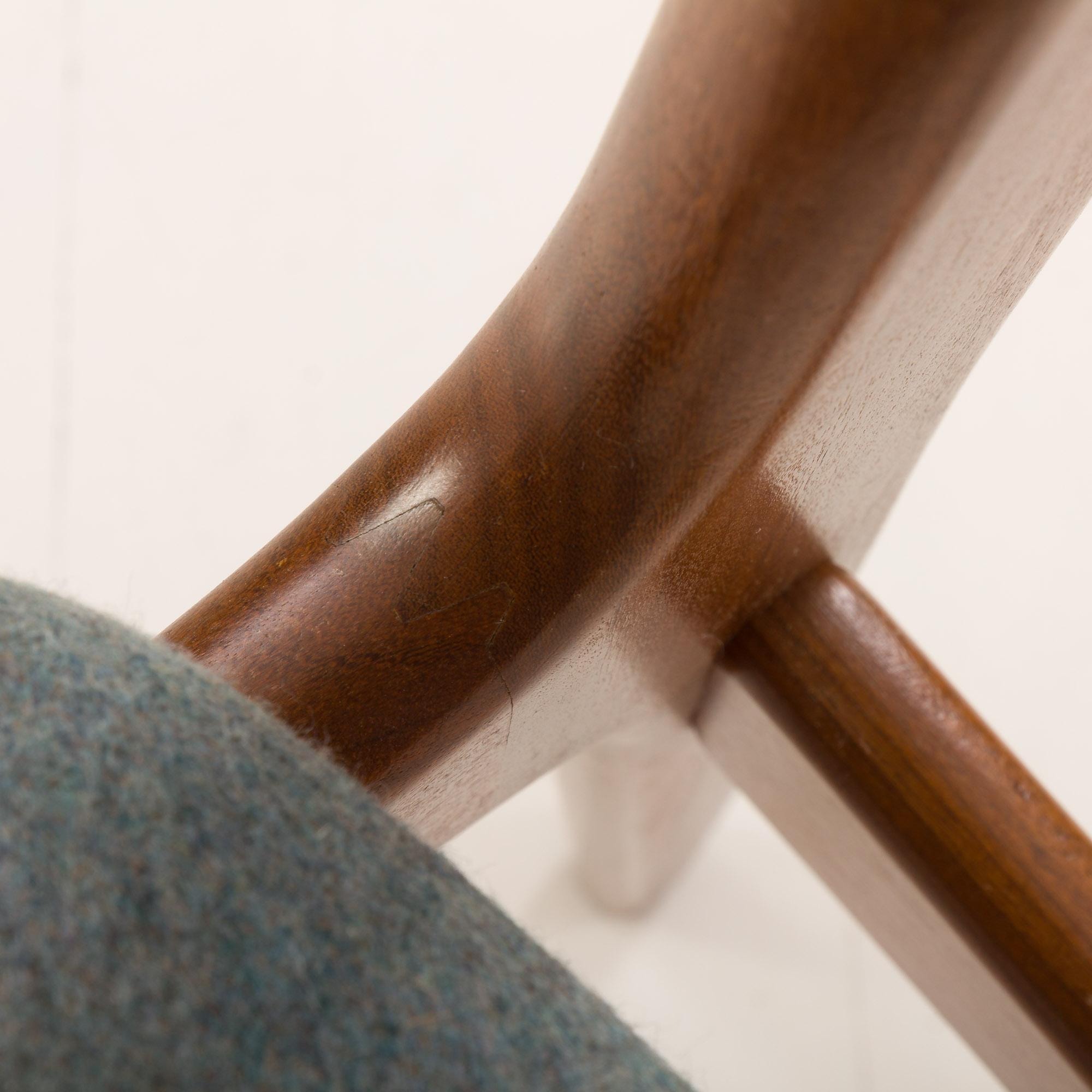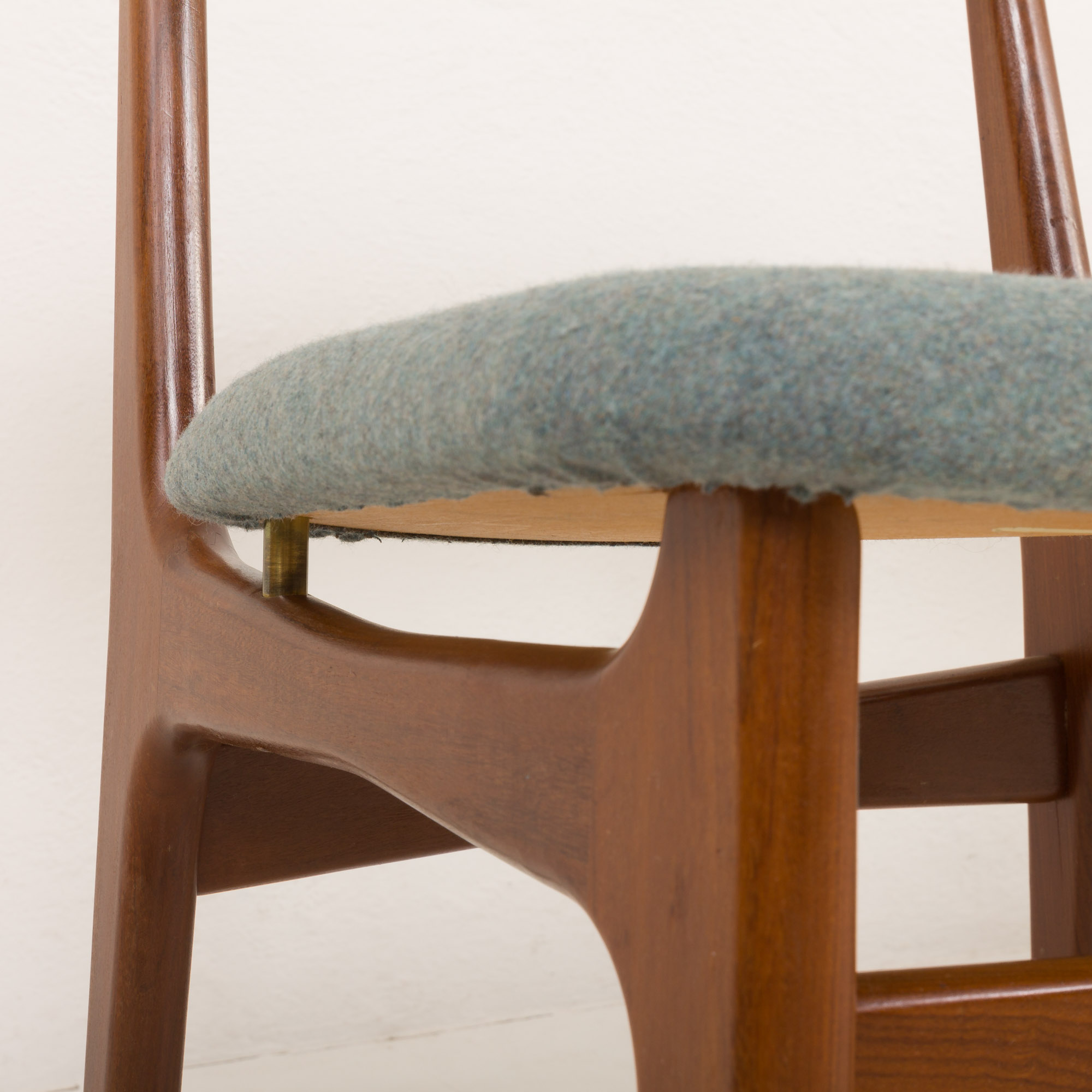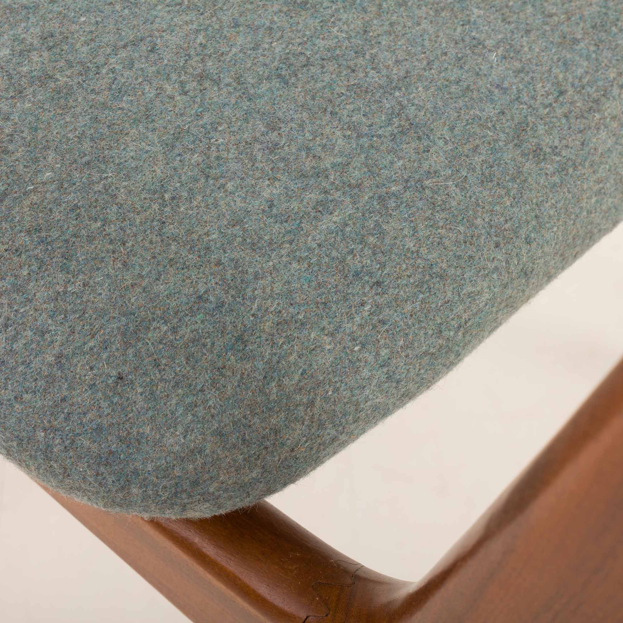 The shape of the backrests speaks for itself: ergonomically bent and slightly rounded, the rectangular design offers excellent support and rest for your back. The chairs have been reupholstered in grey-greenish natural wool, which beautifully complements the teak frame and adds harmony to contemporary interiors filled with artificial materials.