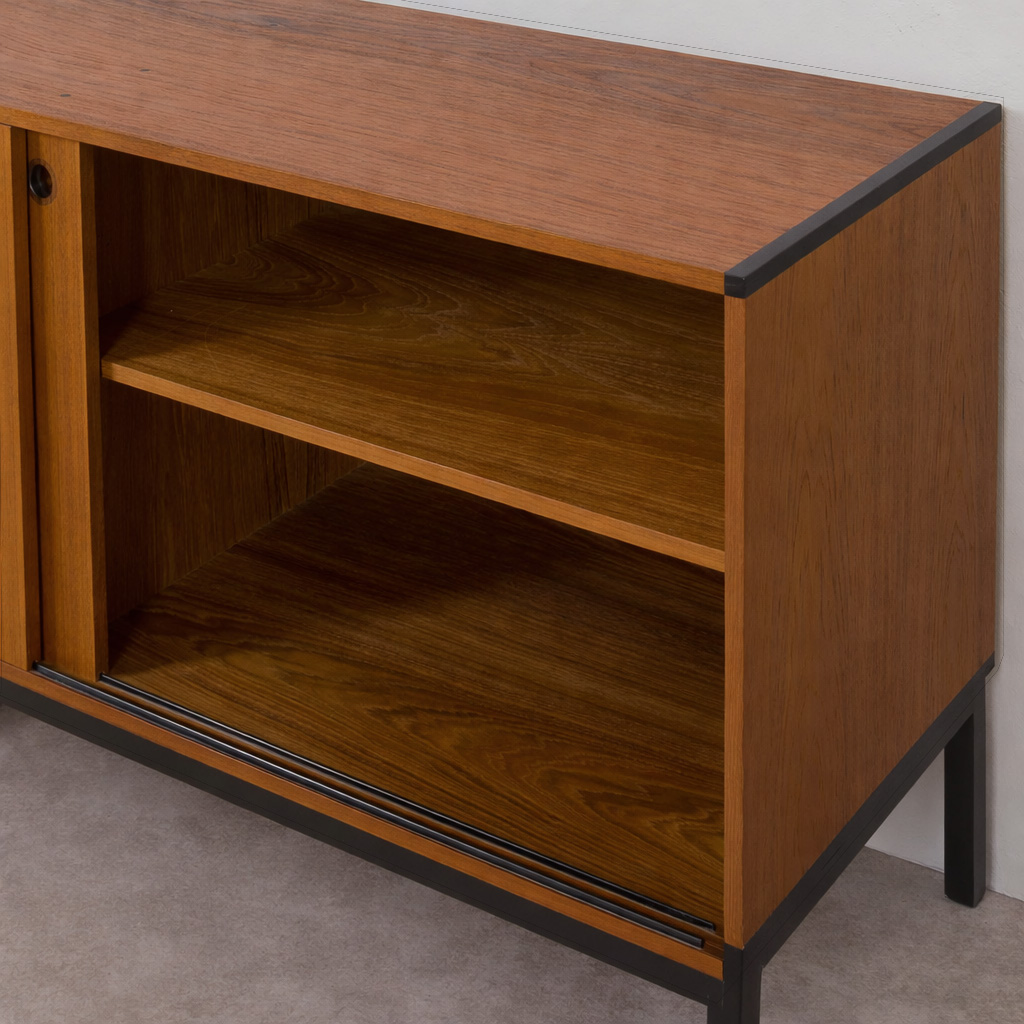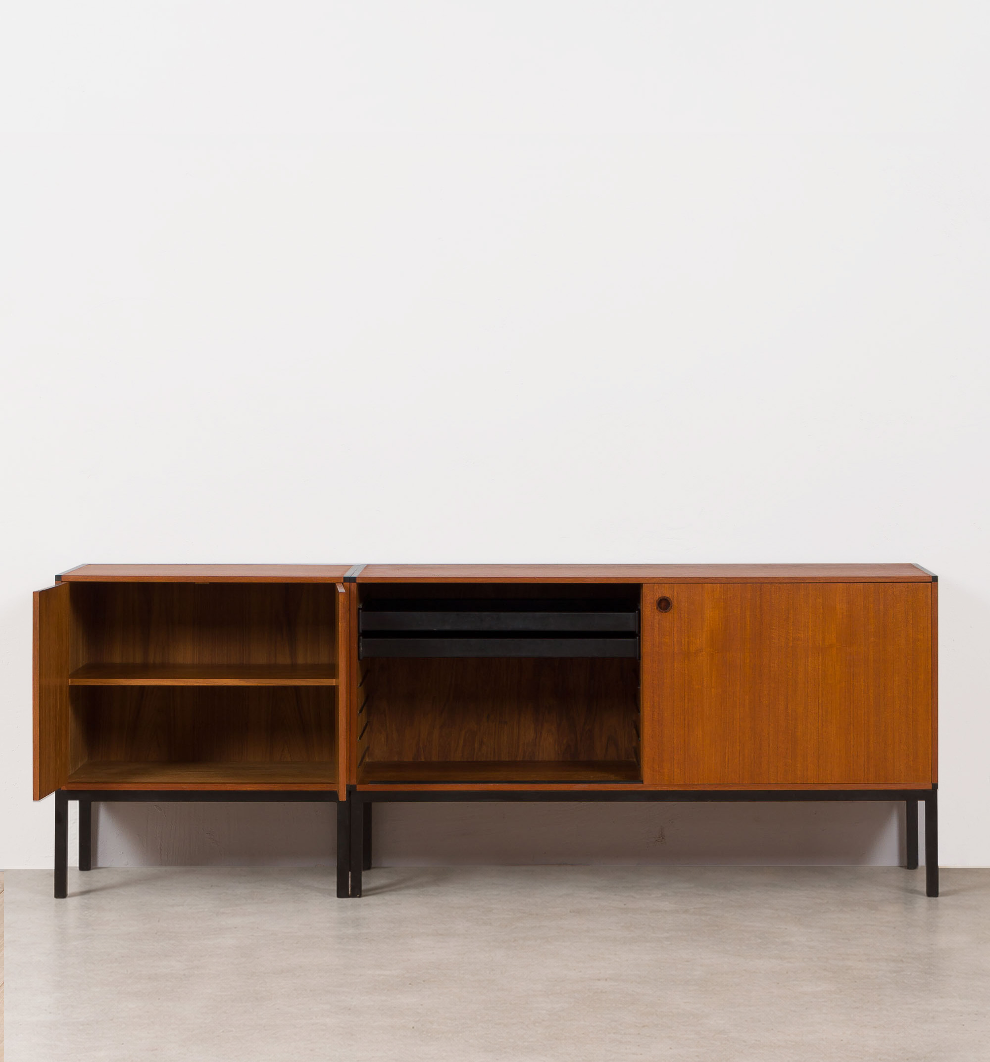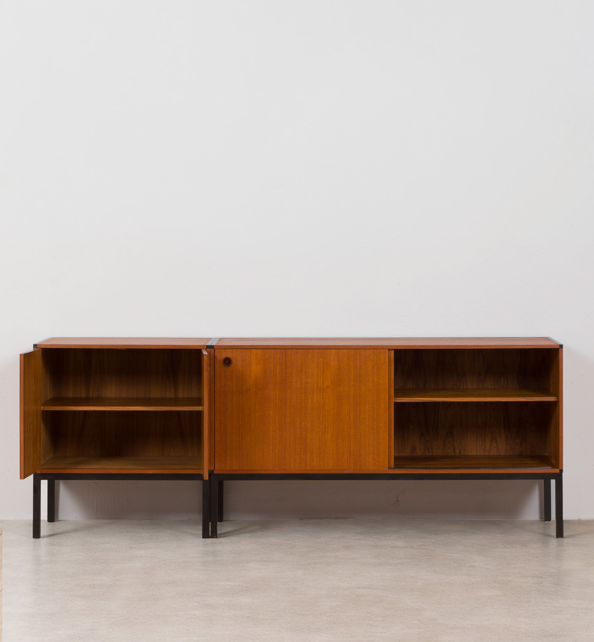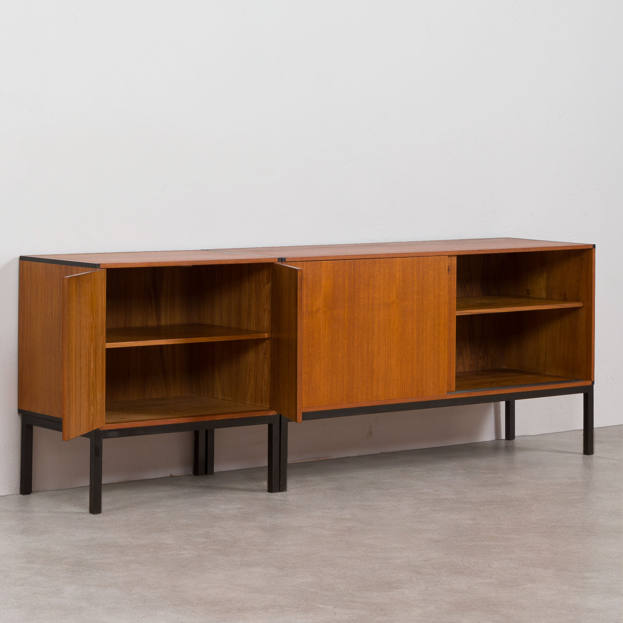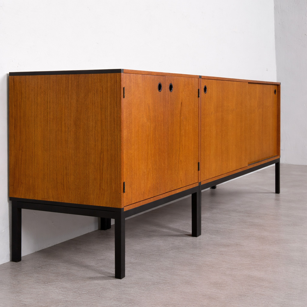 Ensemble de 2 crédences en teck créant un long buffet conçu par Aksel Kjersgaard au Danemark dans les années 1960. Excellent exemple du minimalisme utilitaire danois avec des détails sans prétention cachés dans les poignées en bois de rose. L'armoire la plus grande (128 cm de large) est dotée de portes coulissantes et de 2 tiroirs en laque noire. Les deux crédences sont dotées d'une base en acier également laqué noir. Garde au sol de 21 cm. Les armoires peuvent être utilisées ensemble comme une seule pièce plus grande ou peuvent être disposées séparément. Les étagères intérieures sont réglables en hauteur. Très bon état, le placage a été rafraîchi avec de l'huile danoise.