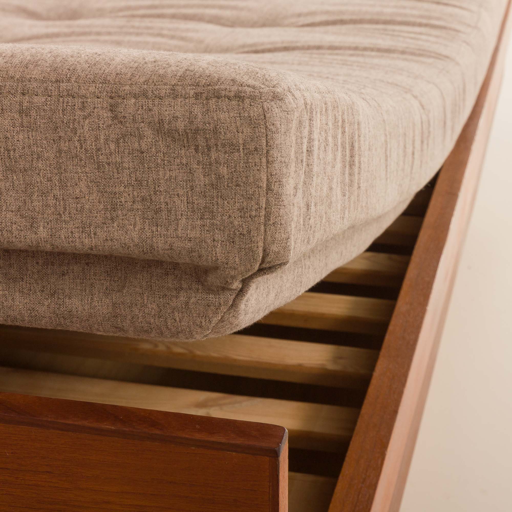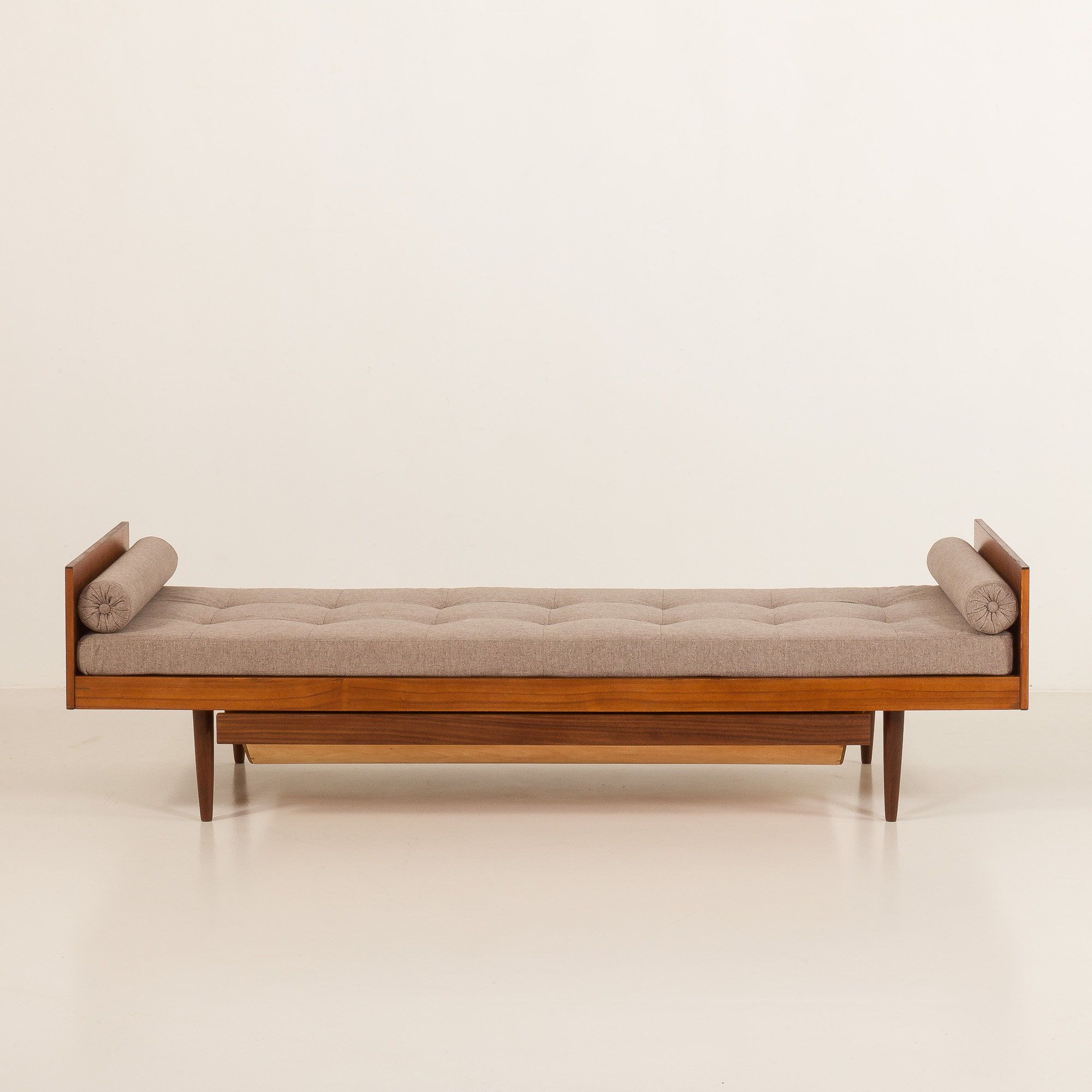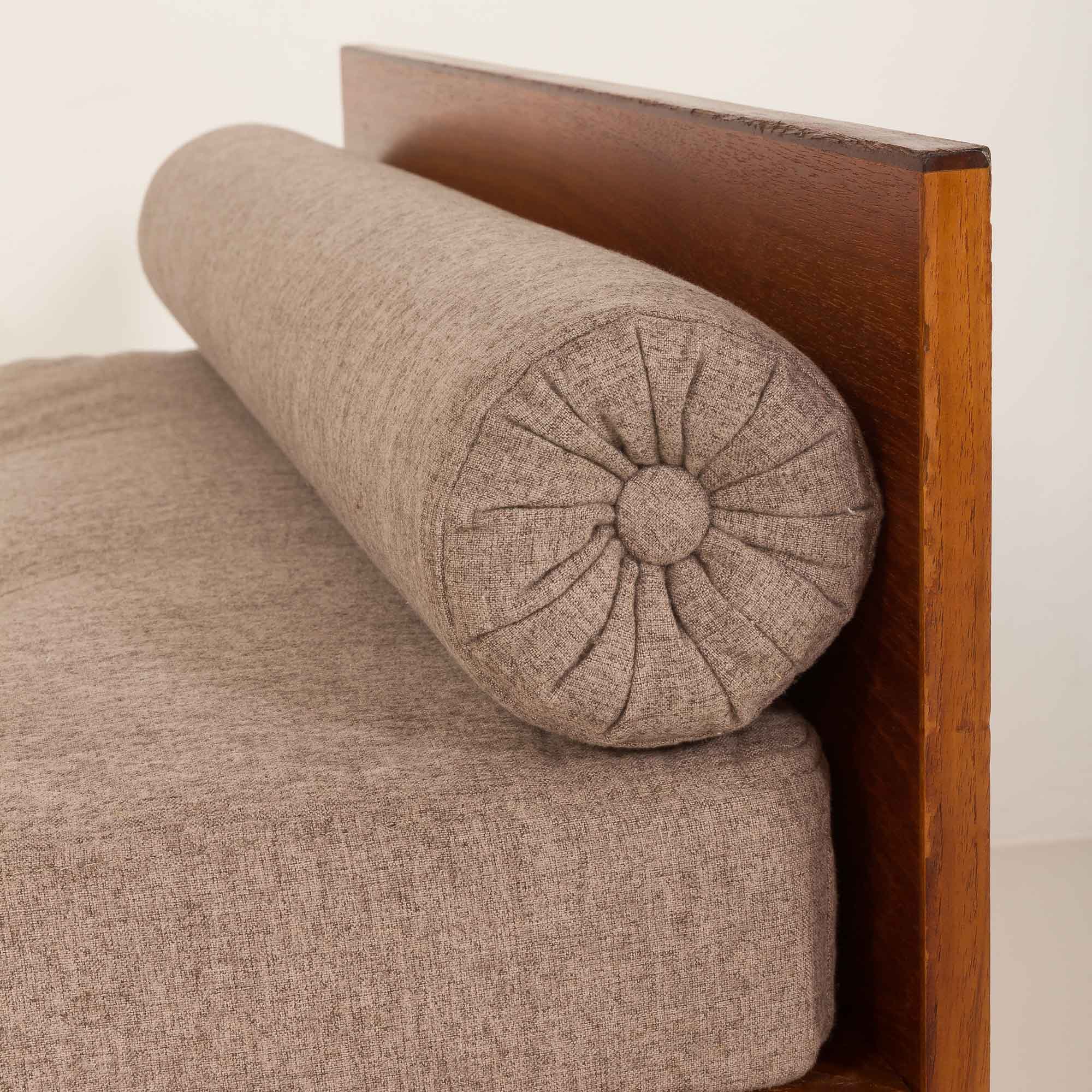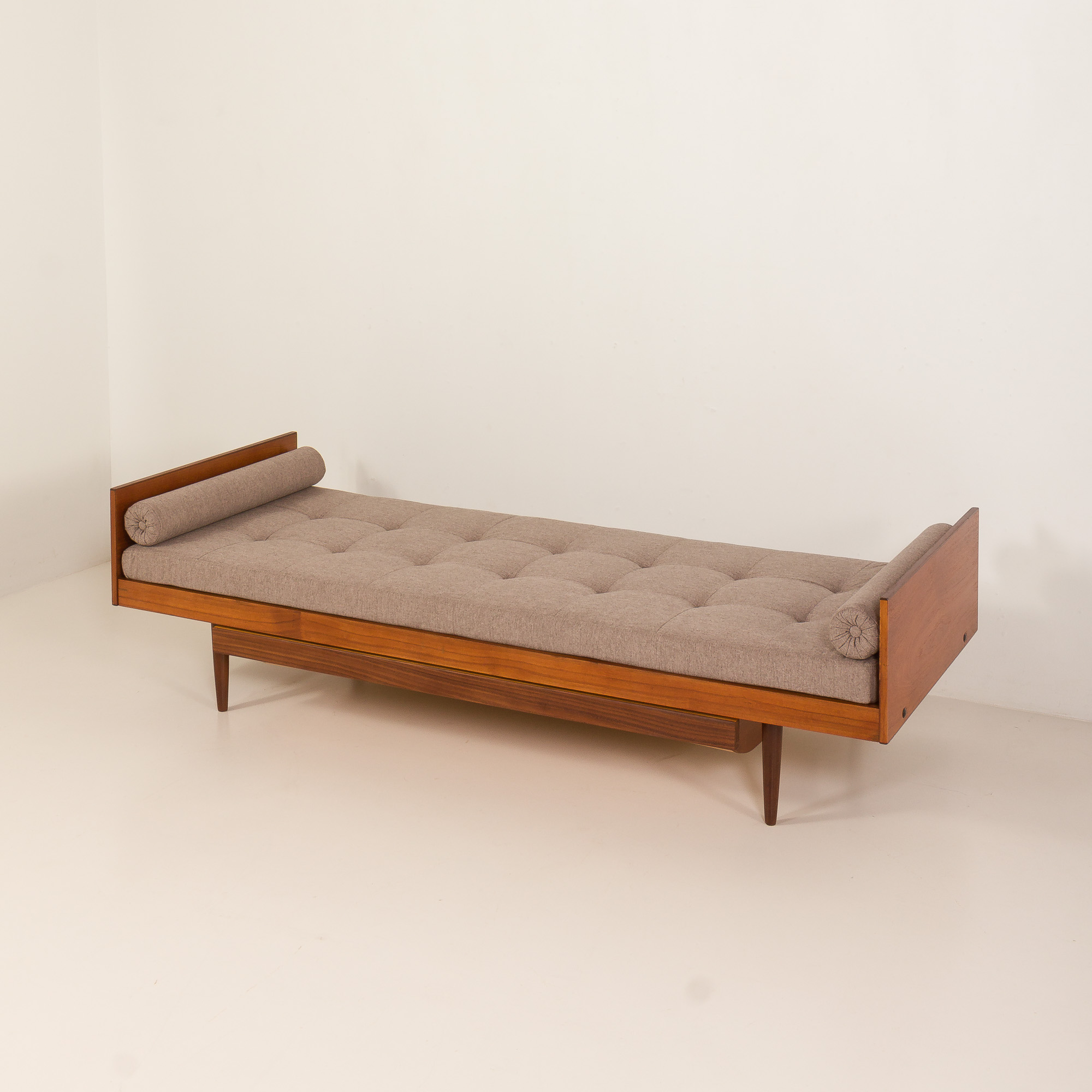 The daybed is in fantastic condition after full renovation. The wood has been treated with Danish oil layers. It is stable and ready to use. The new mattress and bolsters, upholstered in soft fabric add comfort and style.