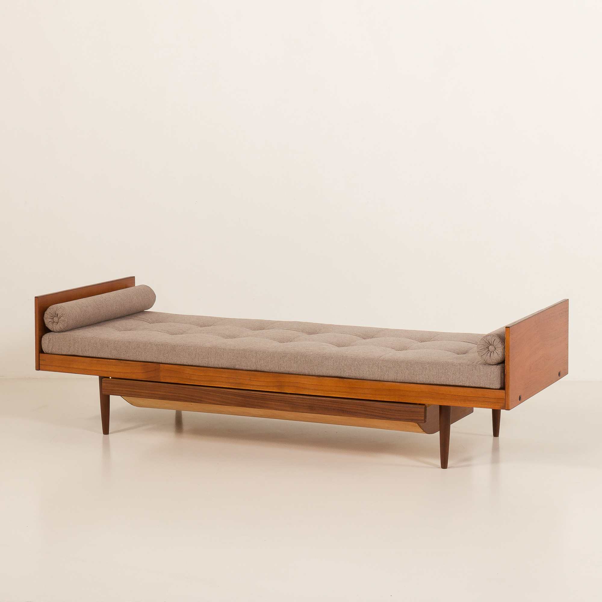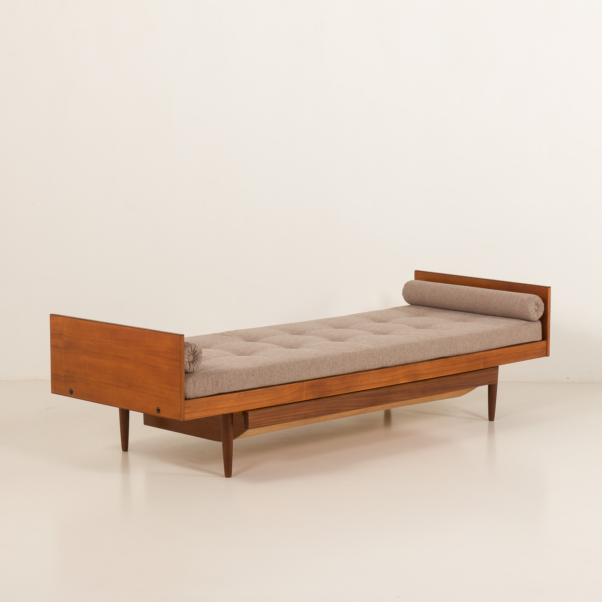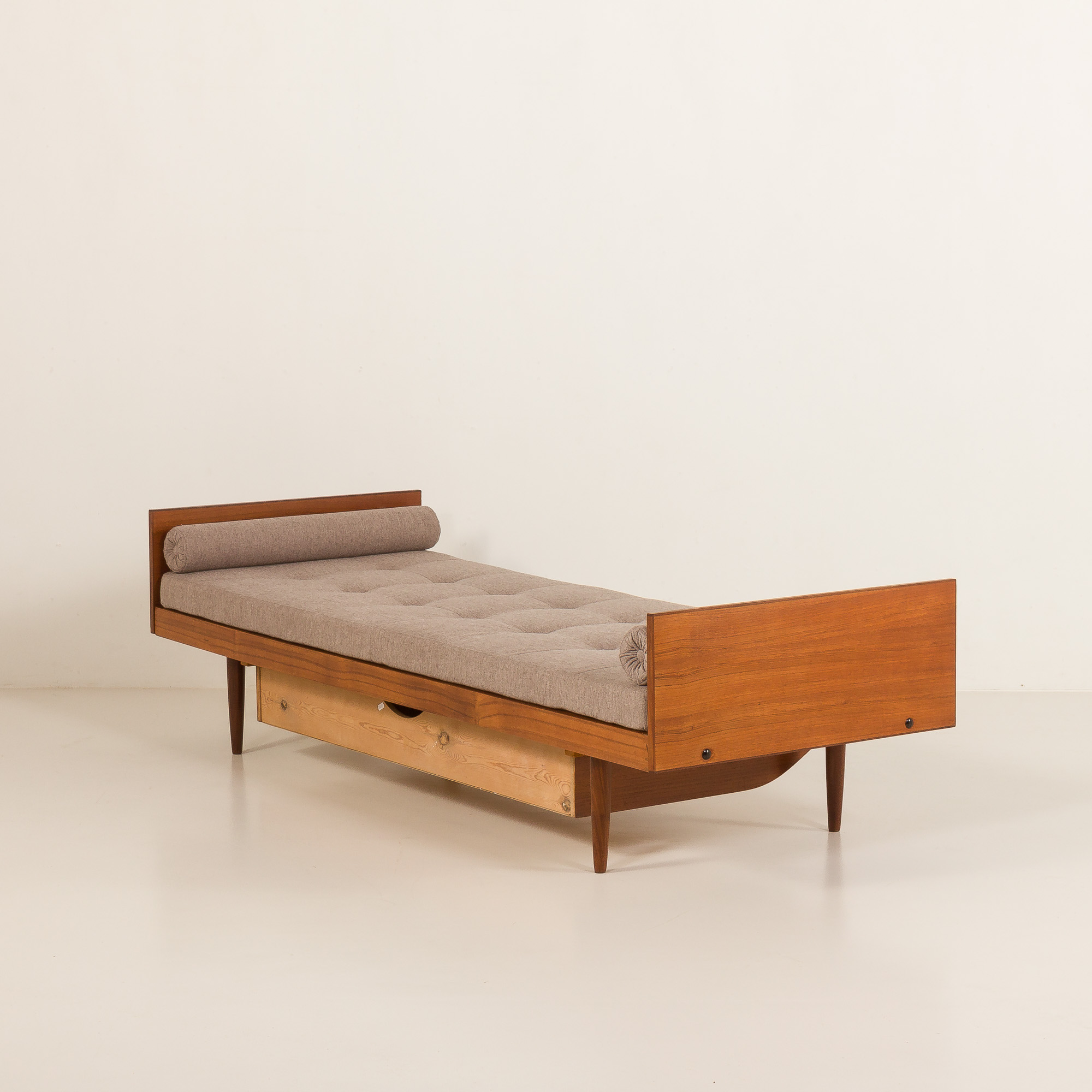 A refined example of Scandinavian design, this mid-century daybed from the 1960s combines minimalist elegance with practical functionality. Crafted in warm-toned teak wood, it features a quilted mattress upholstered in cotton fabric, complemented by two cylindrical bolster cushions.