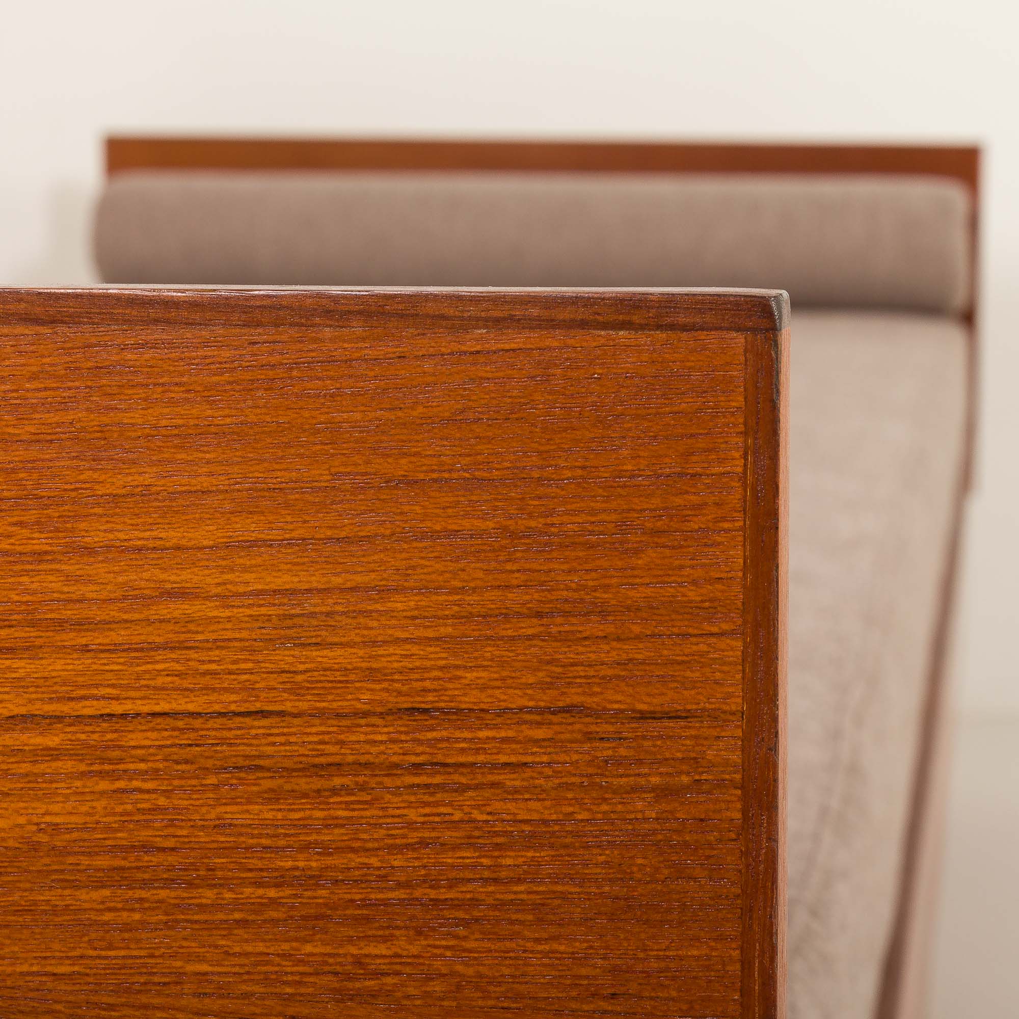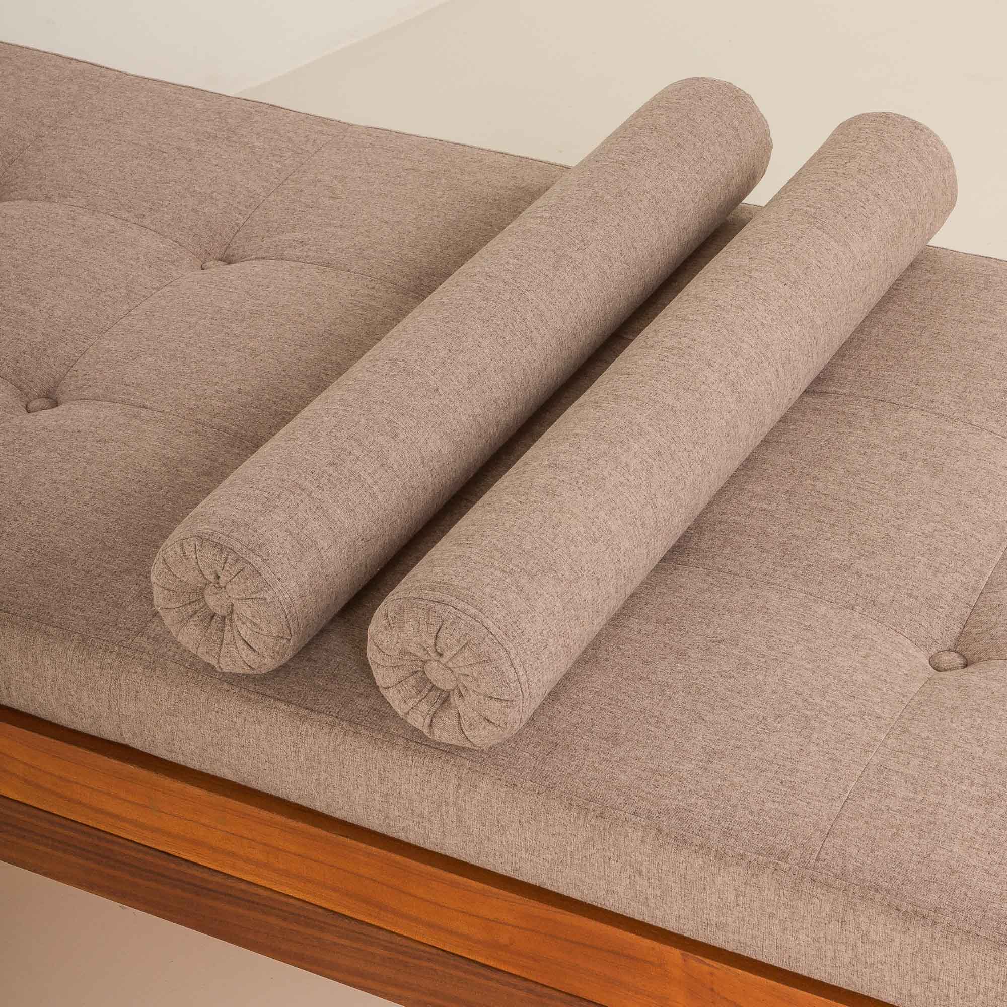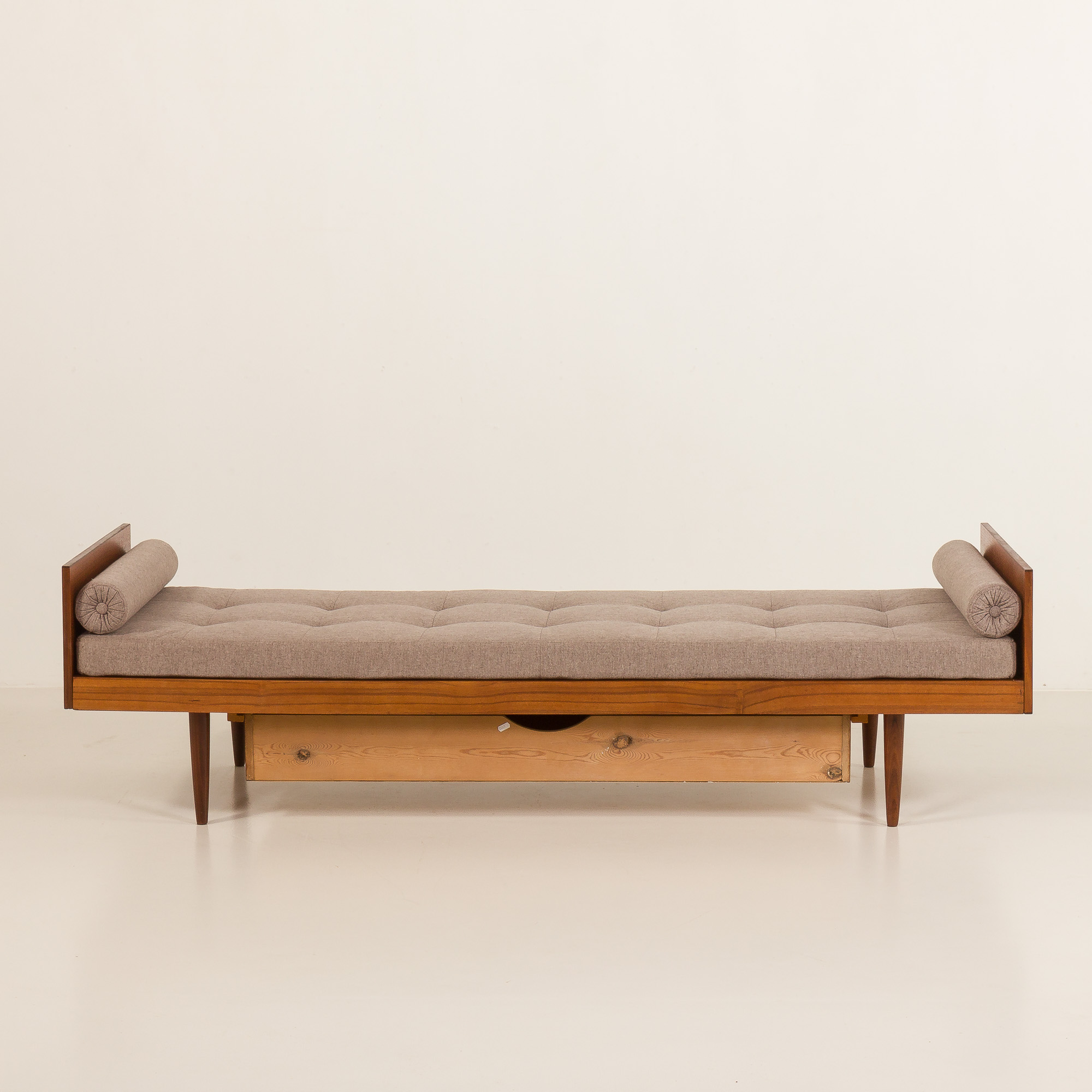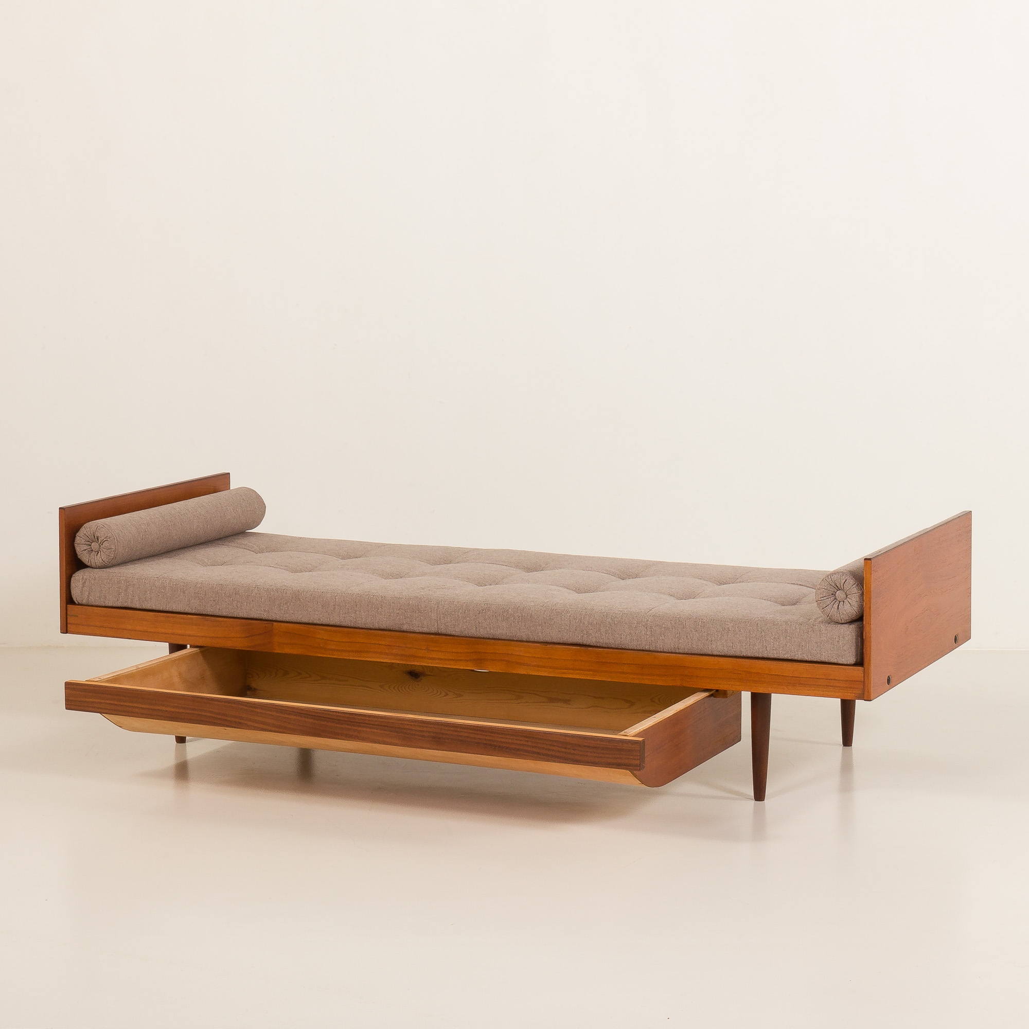A refined example of Scandinavian design, this mid-century daybed from the 1960s combines minimalist elegance with practical functionality. Crafted in warm-toned teak wood, it features a quilted mattress upholstered in cotton fabric, complemented by two cylindrical bolster cushions.
