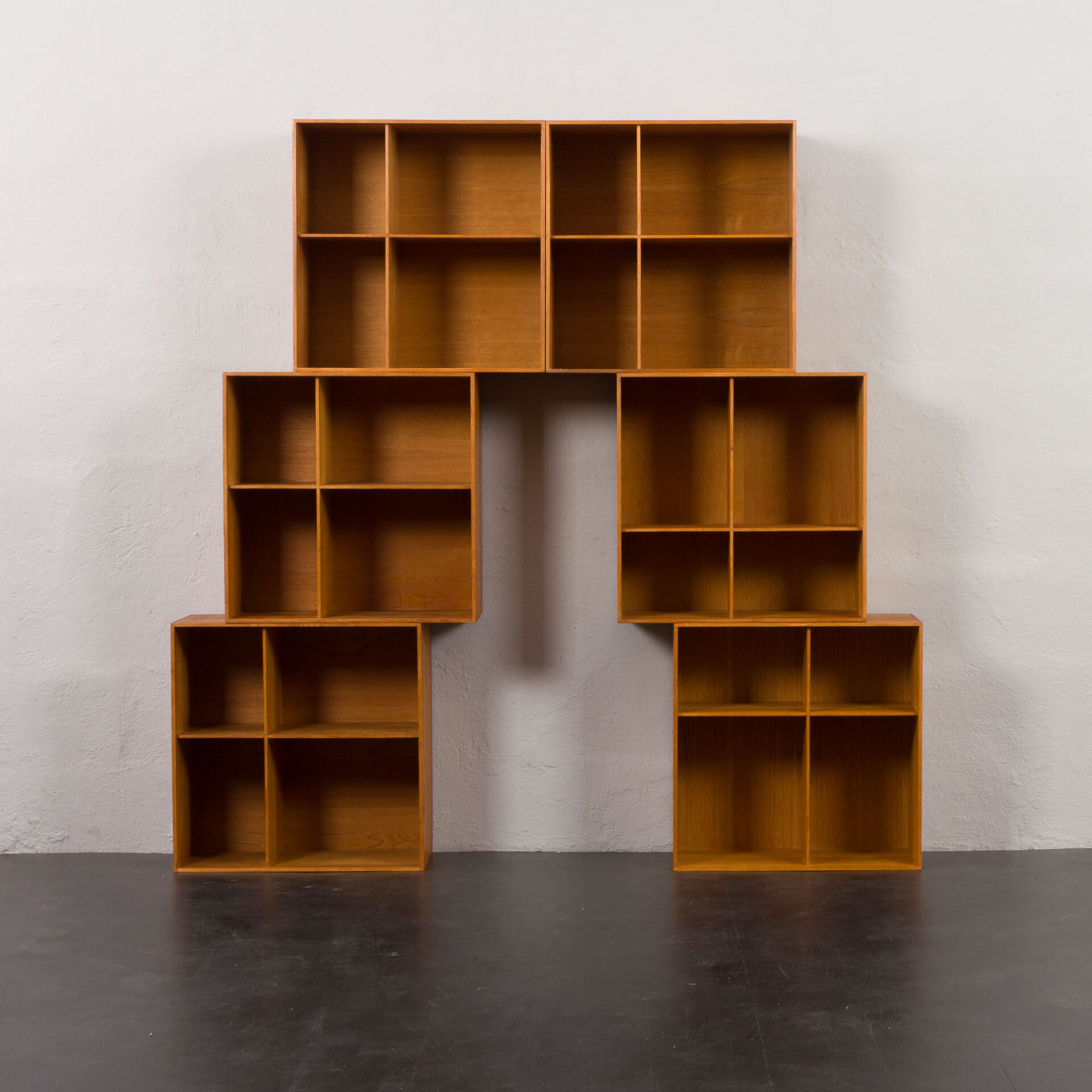 An impressive completely cubic modular bookcase designed by Peter Hvidt and Orla Molgaard Nielsen and manufactured by Soborg Mobelfabrik in the 1960s inDenmark. The bookcase is made of solid oak. The set features six self-contained modules with shelves. All can be arranged as required. The possibilities are a lot! all the cubes are built in There are characteristic way with dovetail joints on each of the cubes.